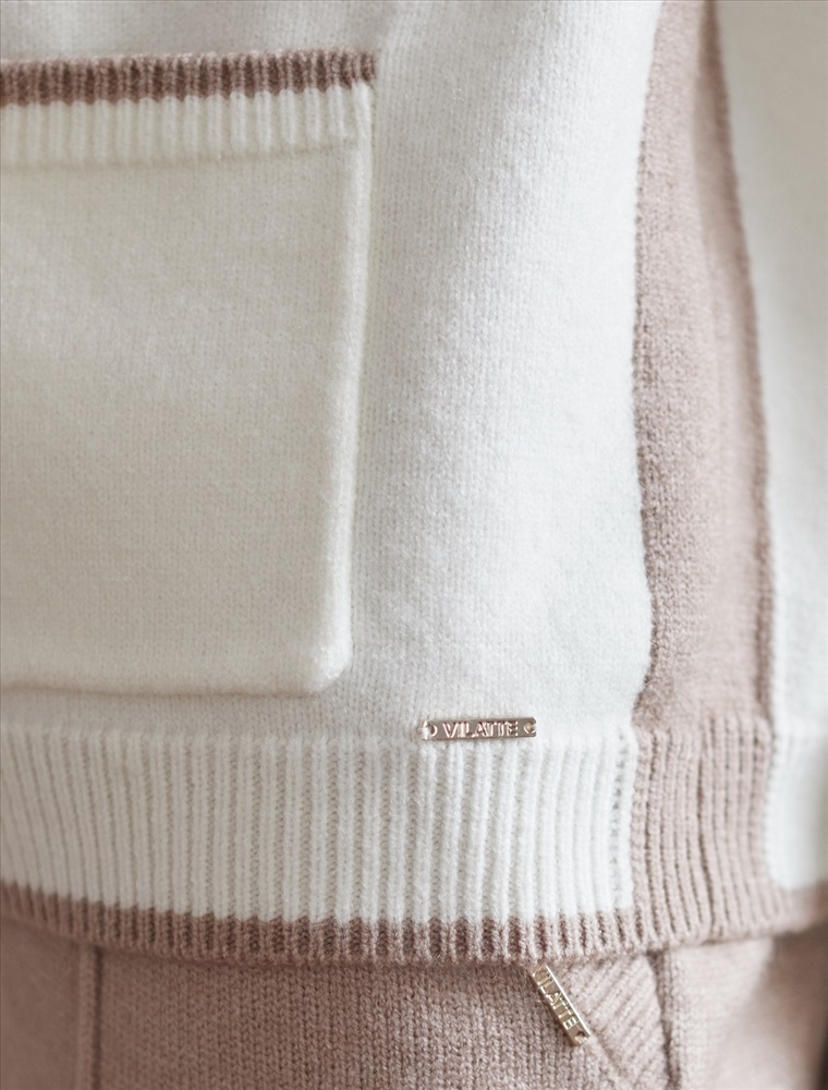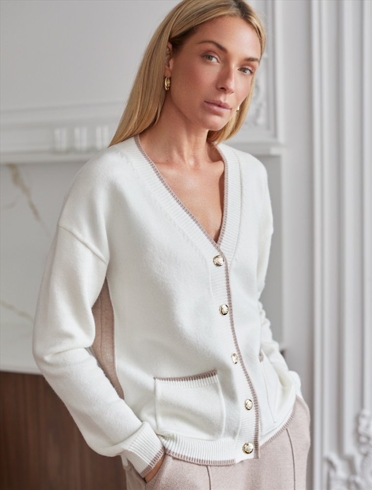Размер товара на первом фото: 42 Кардиган выполнен из мягкой меланжевой пряжи с добавлением кашемира. Модель прямого силуэта дополнена контрастными вставками, что позволяет выбрать брюки в тон основного изделия, либо канта. Роскоши добавляют фактурные золотистые пуговицы. Изделие очень приятное к телу, совершенно не колется и отлично сохраняет тепло. Сочетается в костюме с брюками D38.013, D38.012 и юбкой D36.016