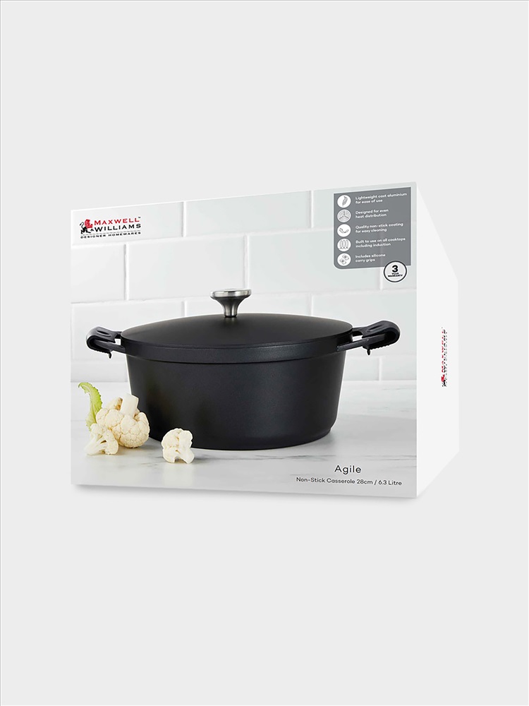 Бренд: MAXWELL & WILLIAMS Кастрюля, 28 см, 6,3 л, с крышкой, с покрытием, алюминий, черная, Agile. Материал: алюминий (литой) с антипригарным покрытием. Можно мыть в посудомоечной машине.