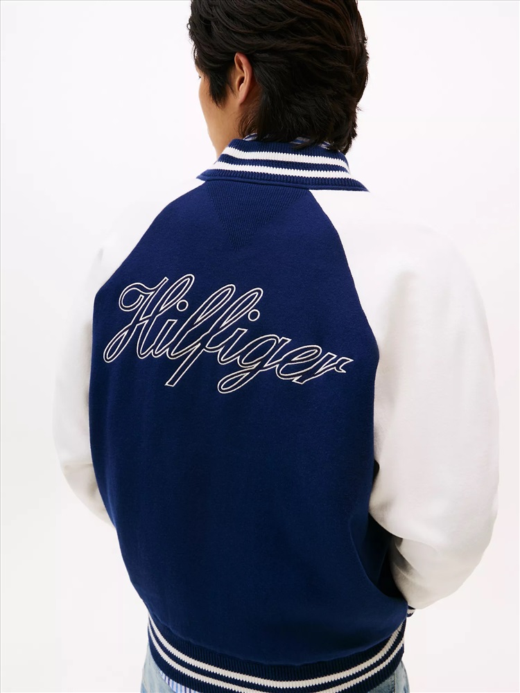 Tommy Hilfiger men's jacket. Our jacket merges the comfort and movement of a sweater with the sporty feel of a bomber. Made from cotton knit with a touch of cashmere, this outer layer is super soft. Raglan colorblock sleeves and our embroidered monogram add to the varsity vibe.