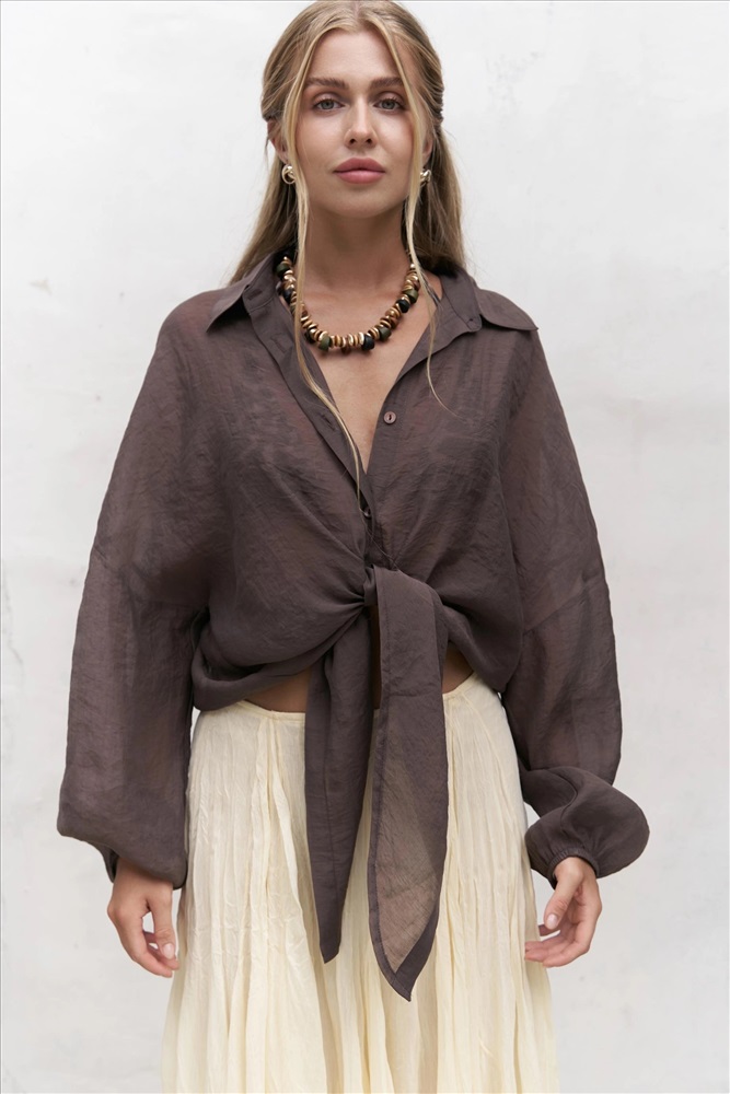 Прозрачная рубашка с длинными рукавами и спущенными плечами и широкими манжетами. Спереди ассиметричный крой и застежка на пуговицы.