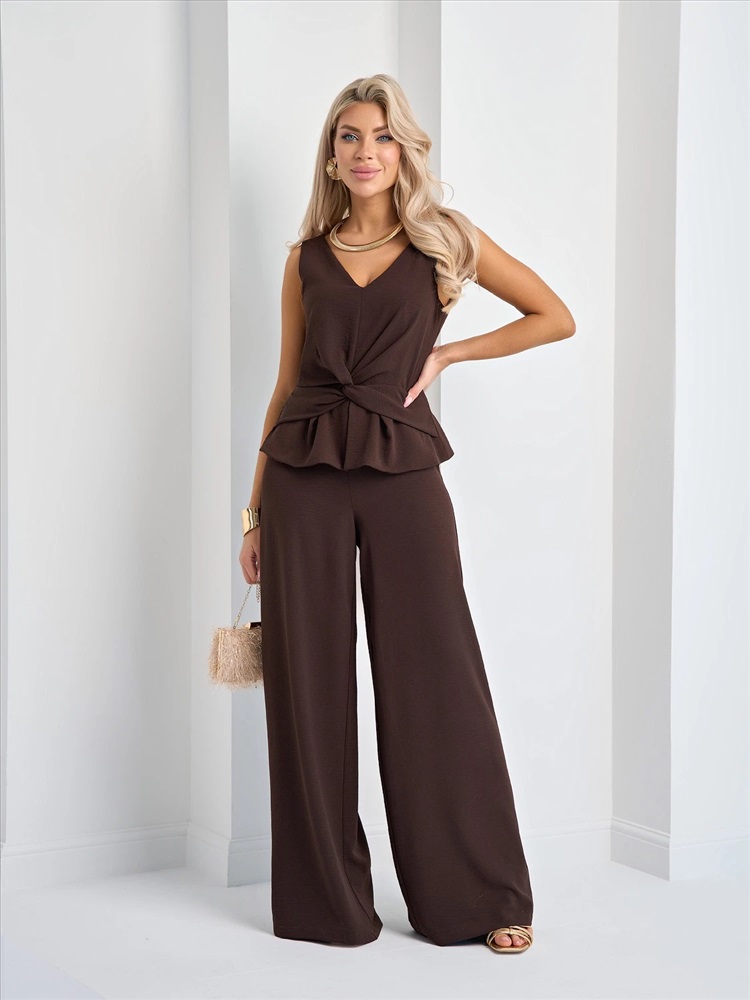 Изделие отрезное по линии талии. Пояс декорирован баской. Брюки широкие. V-образный вырез по спинке и по переду. Потайная застежка молния расположена в среднем шве спинки. Комментарии к товару