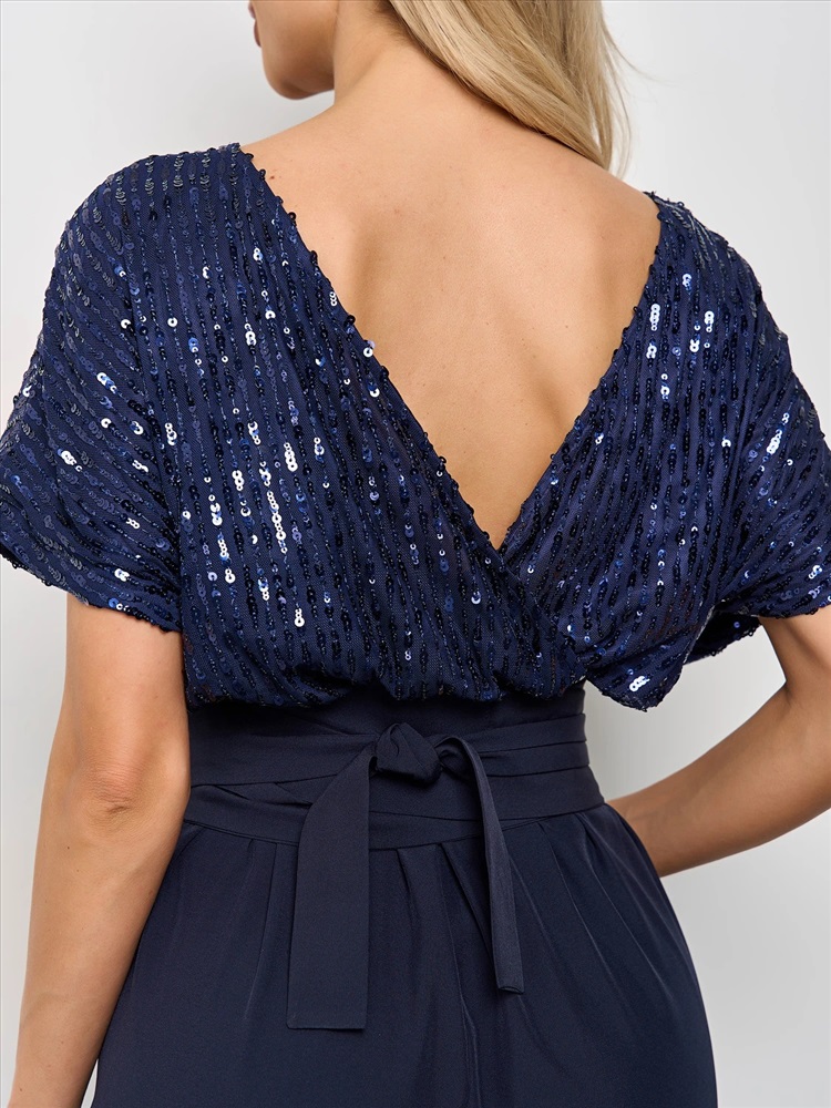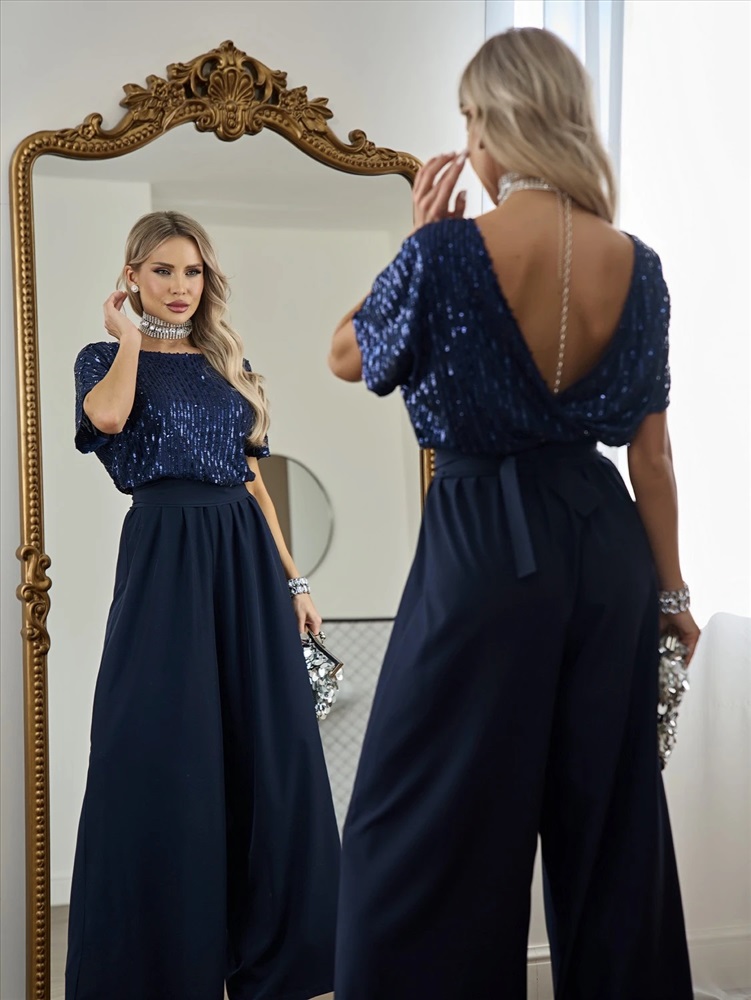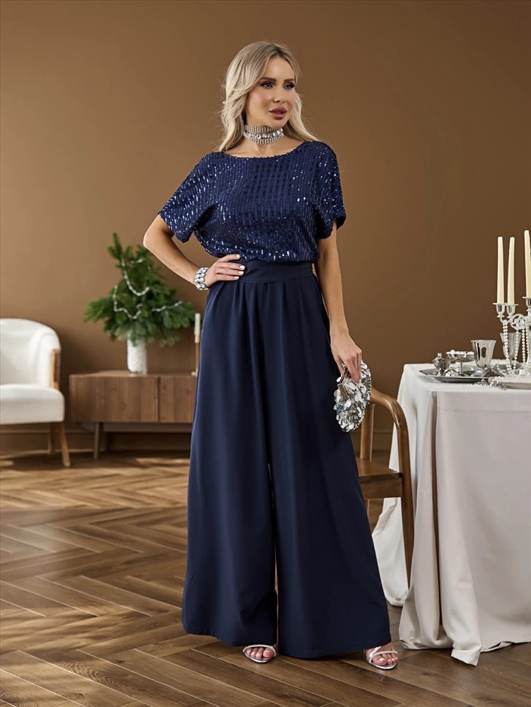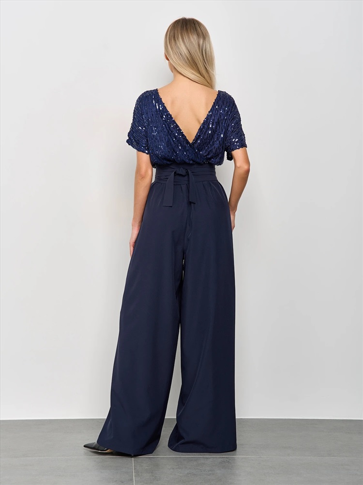 Верх выполнен из трикотажа с пайетками. Низ изделия из плательной ткани. Изделие отрезное по линии талии, на внутренней резине. Брюки широкие. V-образный вырез по спинке. Пояс в комплекте. Уточнение по замерам: длина изделия по спинке указана от плеча Комментарии к товару