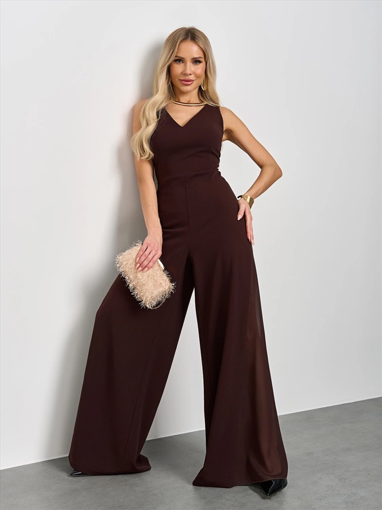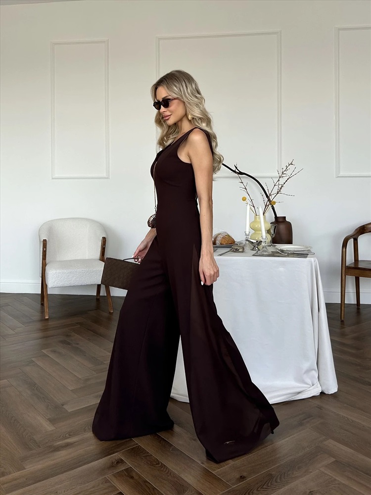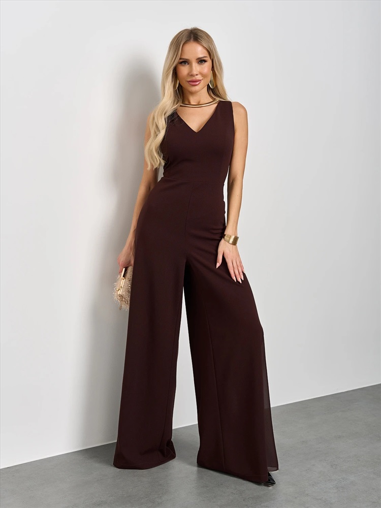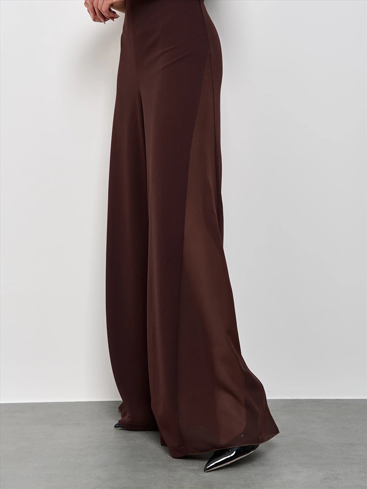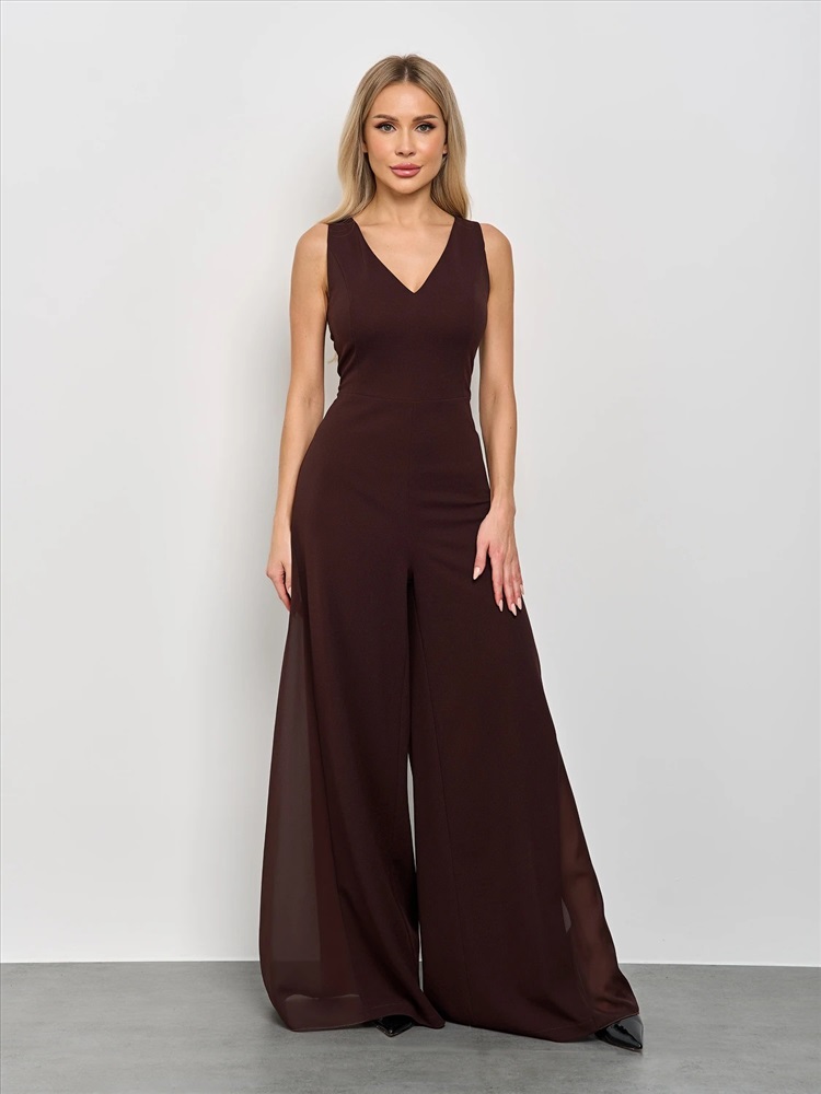 Изделие отрезное по линии талии. Брюки широкие со вставками по бокам из шифона. V-образный вырез по переду и по спинке. Потайная застежка молния расположена в среднем шве спинки. Уточнение по замерам: длина по спинке указана от плеча до низа изделия. Комментарии к товару