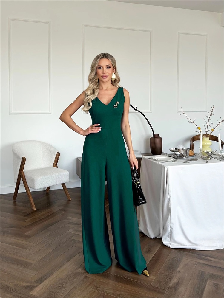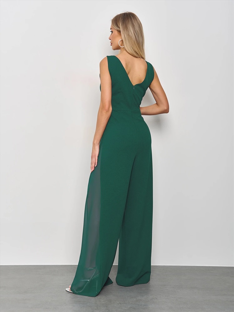 Изделие отрезное по линии талии. Брюки широкие со вставками по бокам из шифона. V-образный вырез по переду и по спинке. Потайная застежка молния расположена в среднем шве спинки. Уточнение по замерам: длина по спинке указана от плеча до низа изделия. Комментарии к товару