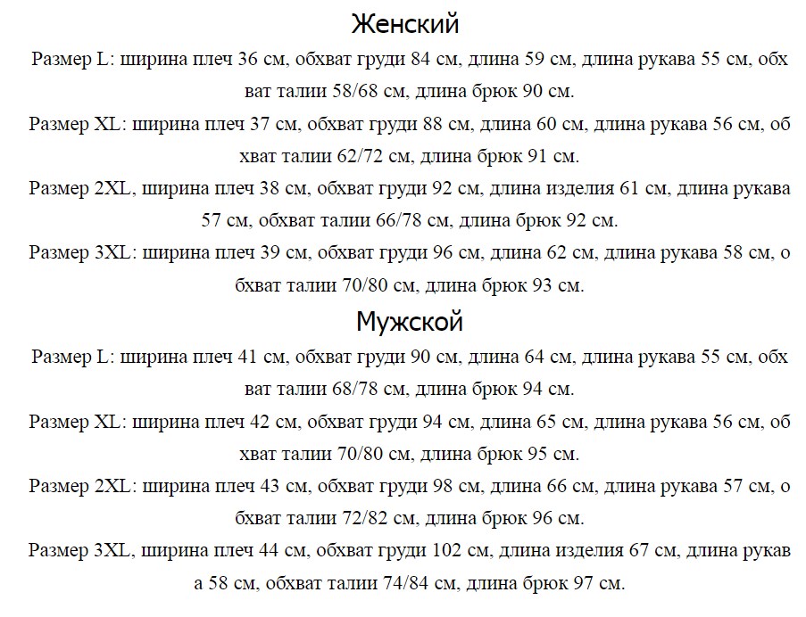 Цвет: Фиолетовый (женский), Красный арбуз (женский), Черные (женские), Хаки (мужской костюм), Темно-серый (мужской костюм), Темно-синий (мужской костюм)