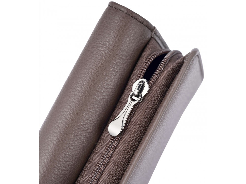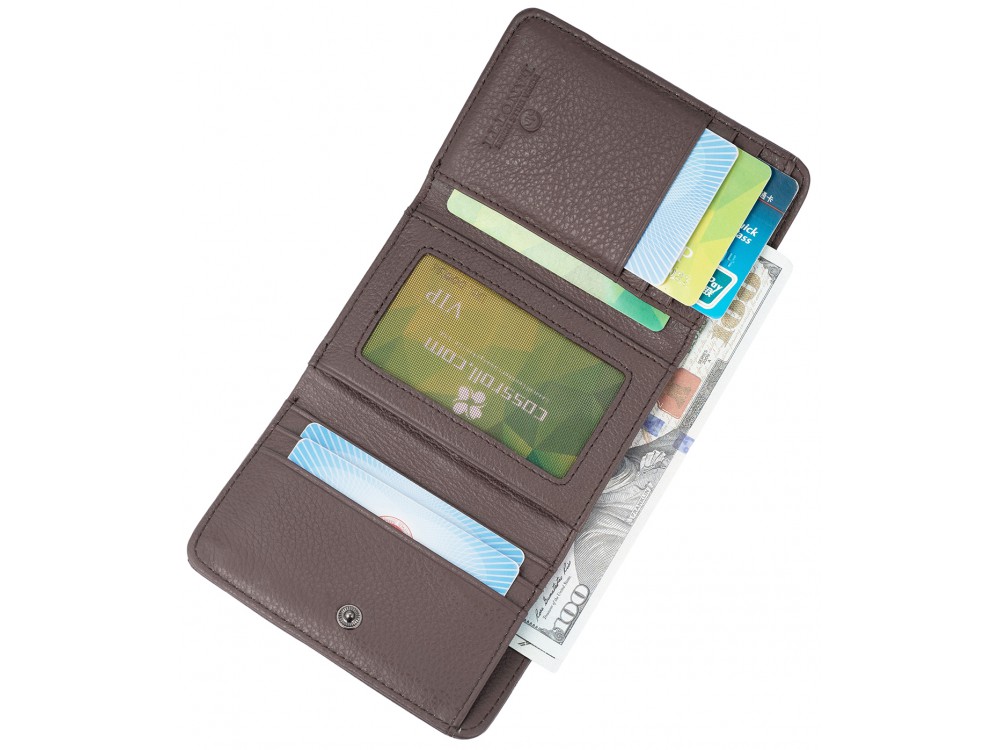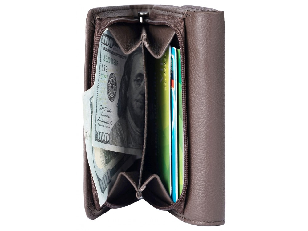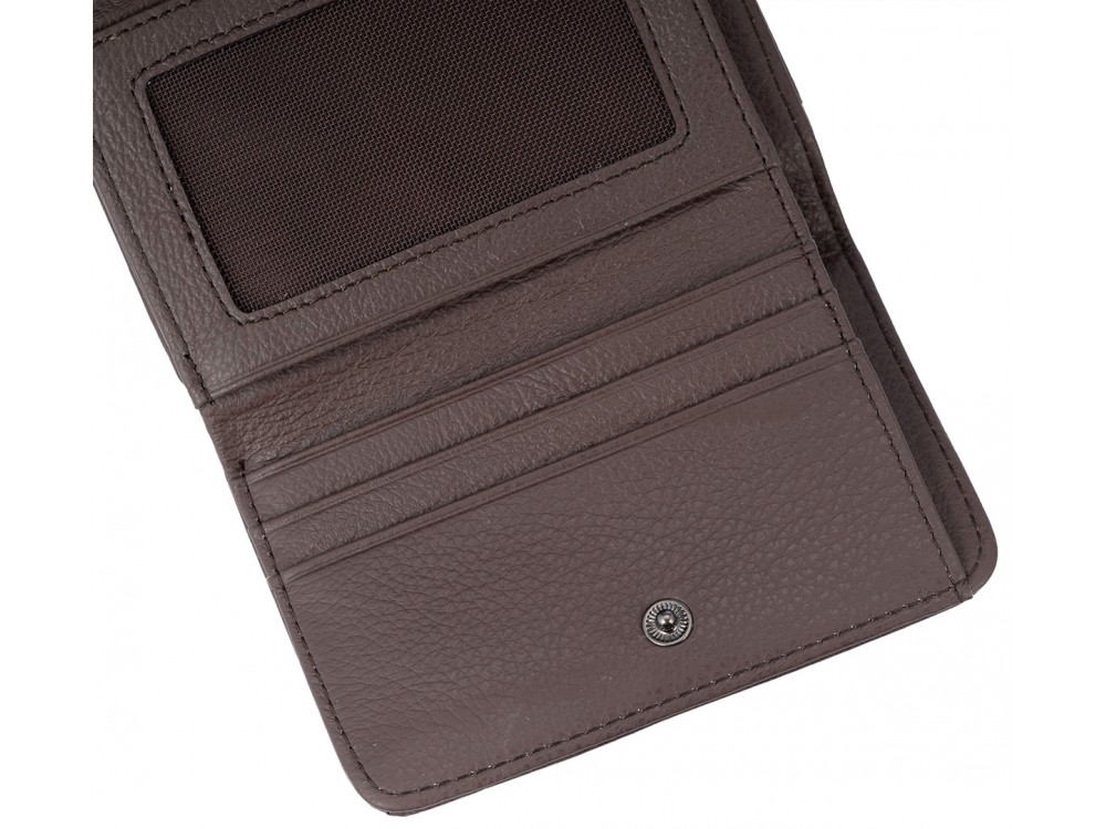 Большое количество отделений, поможет держать все содержимое в порядке: купюры, банковские, дисконтные карты, монеты.