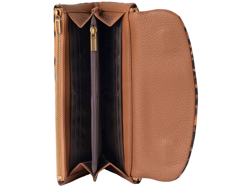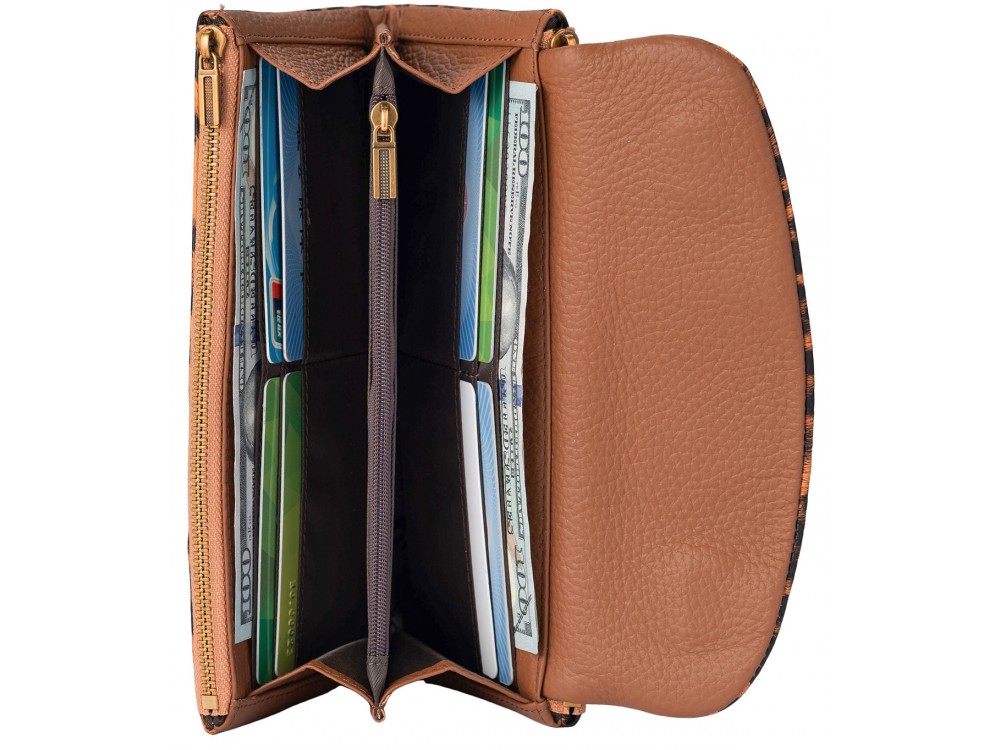 Большое количество отделений, поможет держать все содержимое в порядке: купюры, банковские, дисконтные карты, монеты.