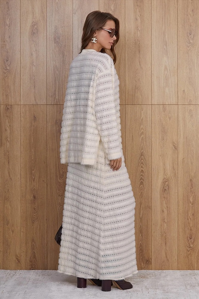 Костюм состоит из кардигана и юбки. Выполнен из кружевного вискозного трикотажного полотна.