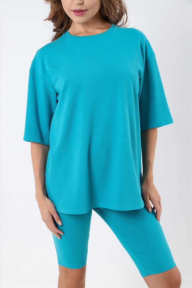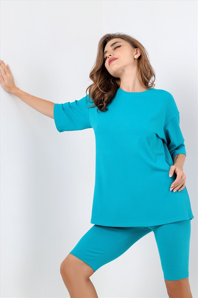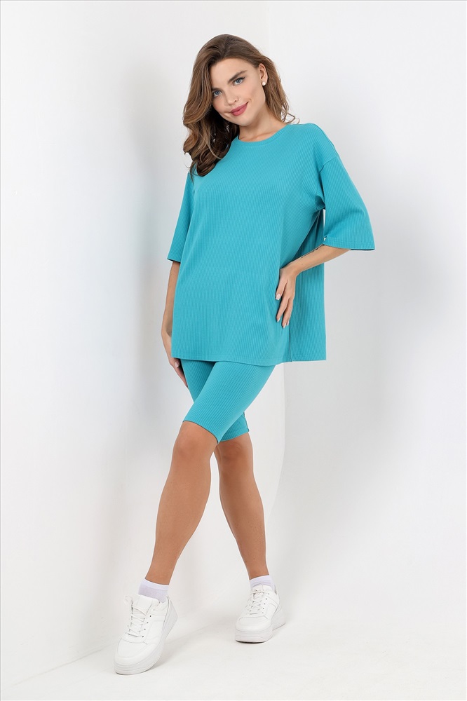 Костюм женский из гладкокрашенного трикотажного полотна в рубчик («лапша»), состоящий из футболки и леггинсов. Футболка – удлиненная, свободного покроя, со спущенной, линией плеча, короткими втачными рукавами, горловиной овальной формы, обработанной втачной планкой.Леггинсы – длиной до колен, с эластичной тесьмой по талии.