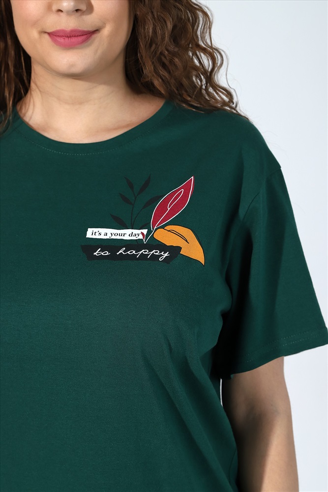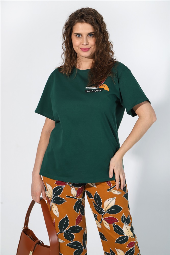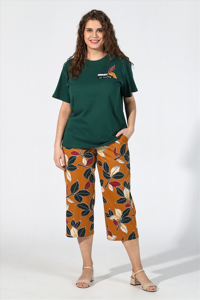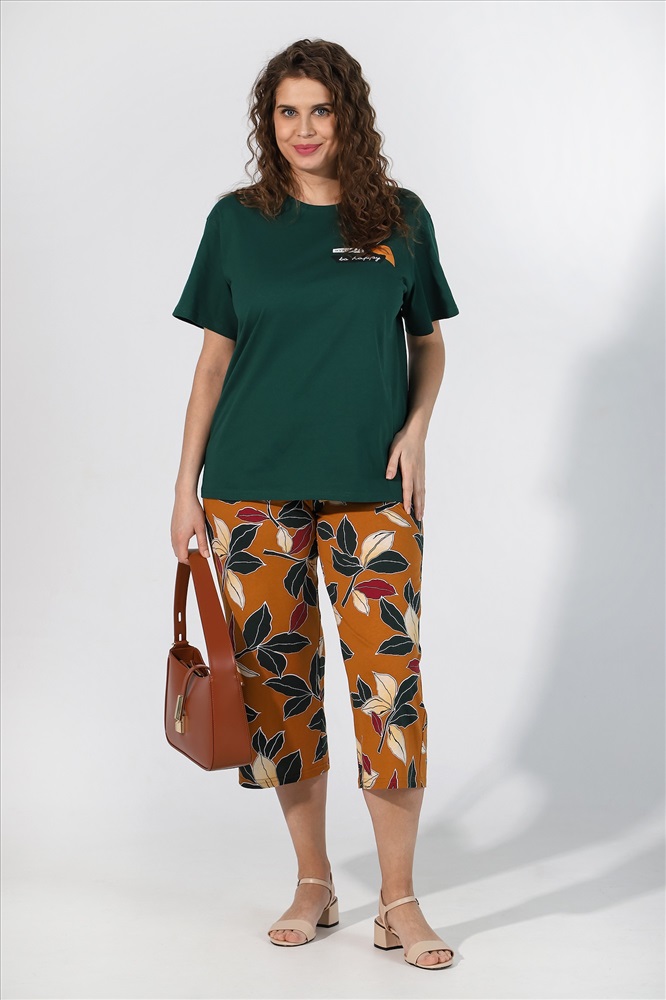 Костюм женский из трикотажного полотна, состоящий из футболки и бриджей.Футболка женская из гладкокрашеного трикотажного полотна «кулирка» классического покроя, с короткими втачными рукавами, горловиной овальной формы, обработанной втачной планкой, и принтом на полочке, выполненным в технике шелкографии.