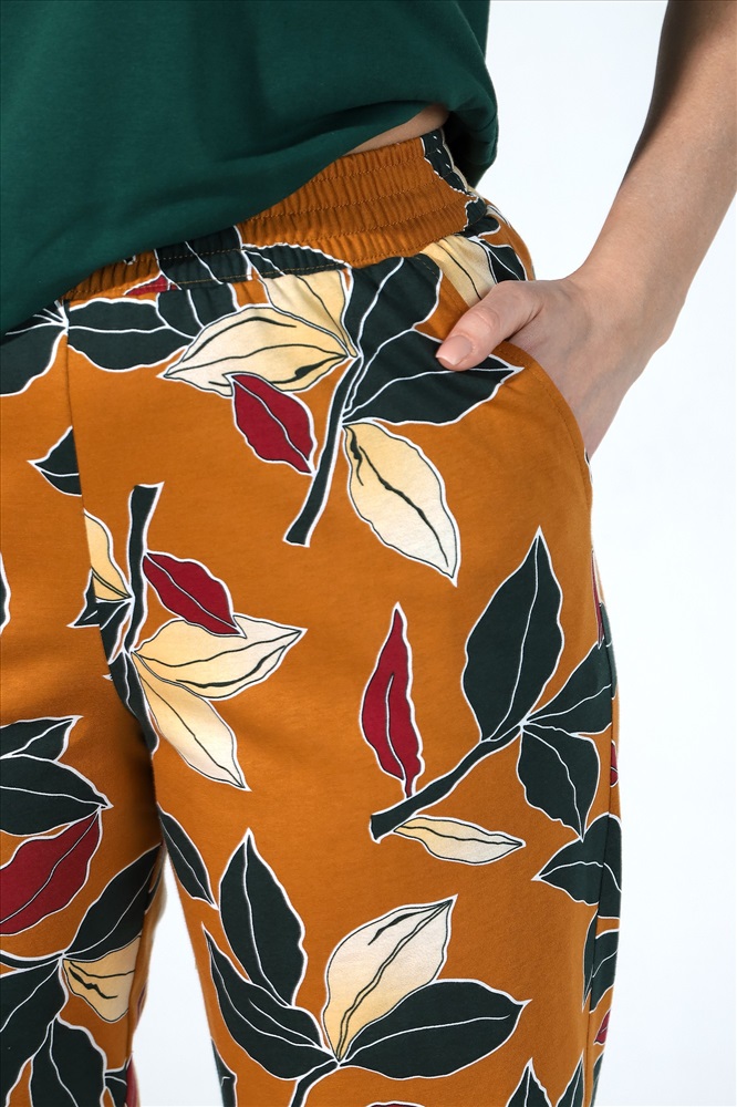 Бриджи из полотна «кулирка» с набивным рисунком, на притачном поясе с эластичной тесьмой внутри и карманами в боковых швах.