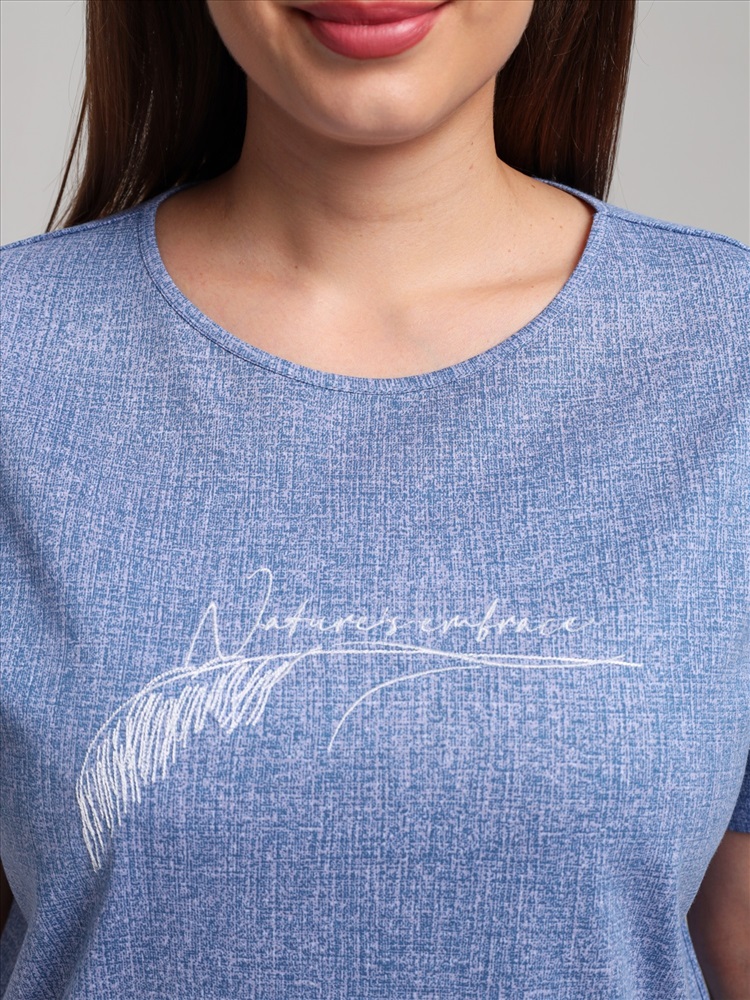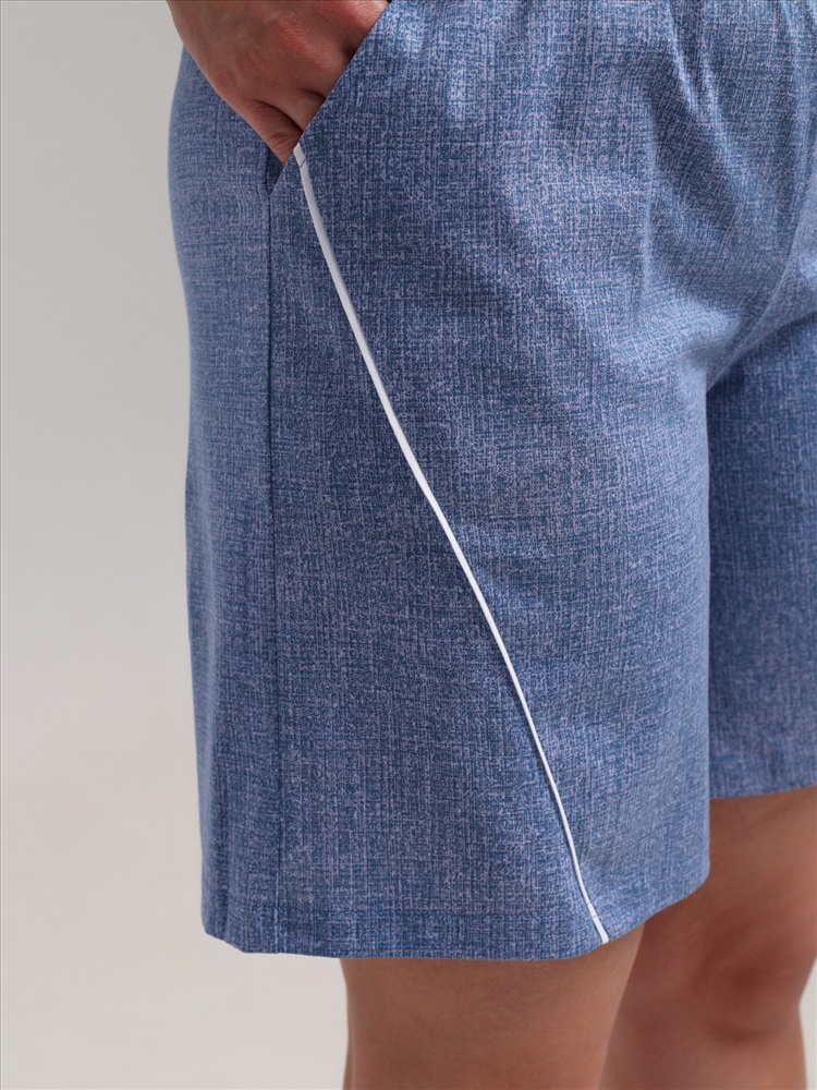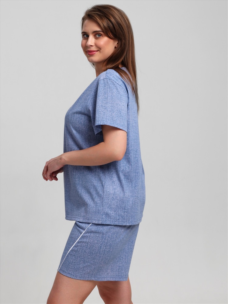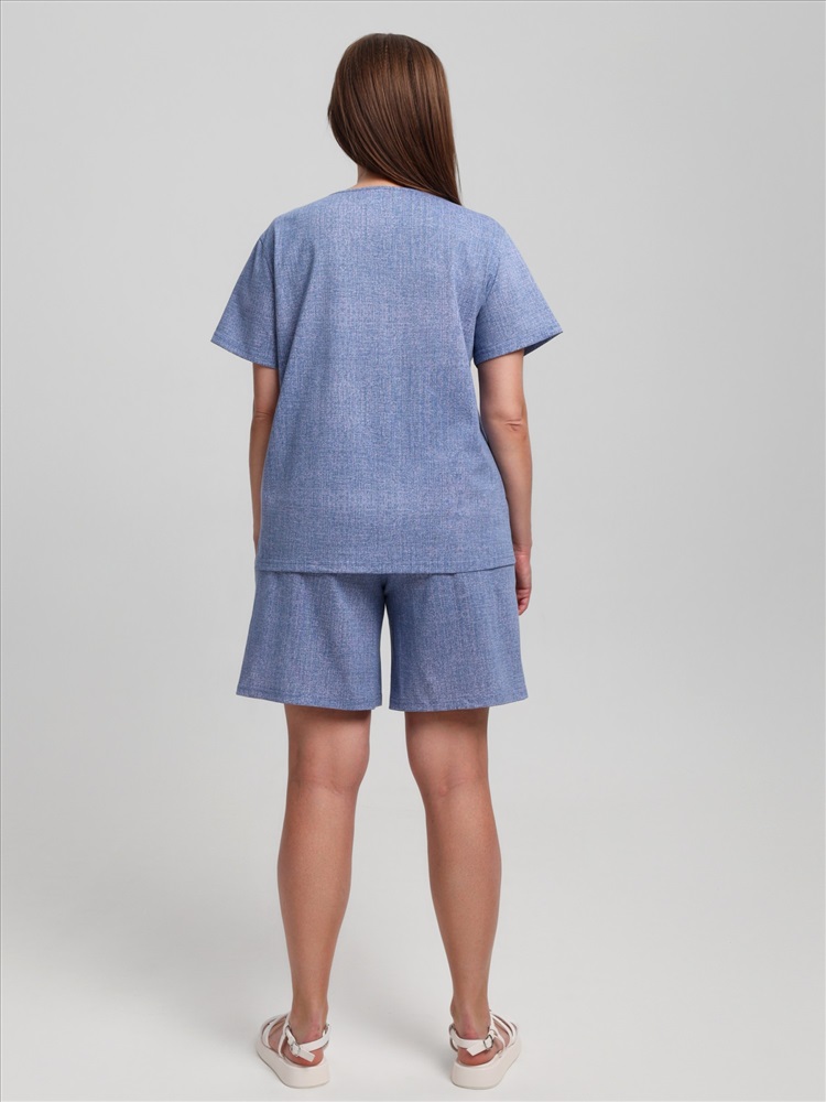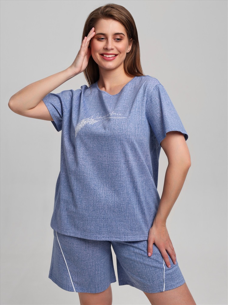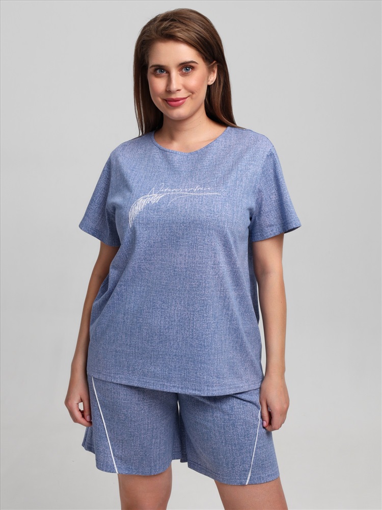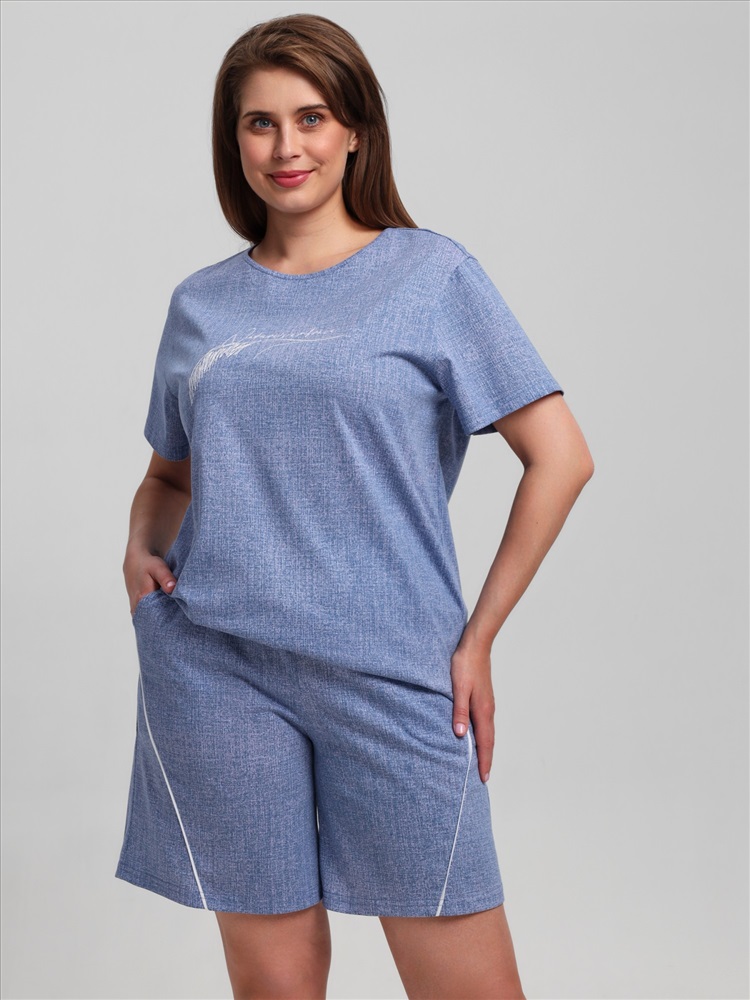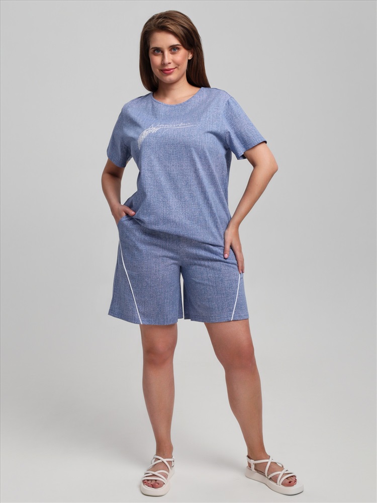 Костюм женский из трикотажного полотна «кулирка» с набивным рисунком, состоящий Футболка – из полотна с набивным рисунком, свободного покроя, с короткими втачными рукавами, горловиной овальной формы, окантованной основным материалом. На полочке выполнена вышивка.Шорты - из полотна с набивным рисунком, свободные, с карманами в боковых швах, на притачном поясе с эластичной тесьмой внутри. Детали передних половин разрезаны по косой, в шве соединения кант контрастного цвета.