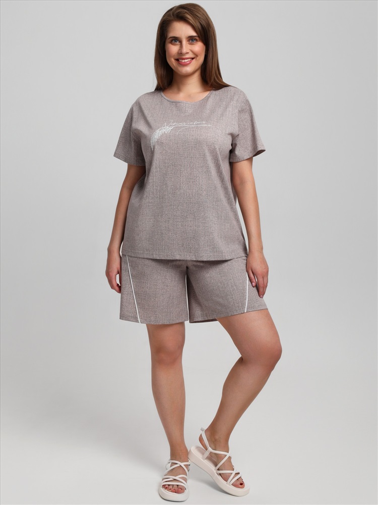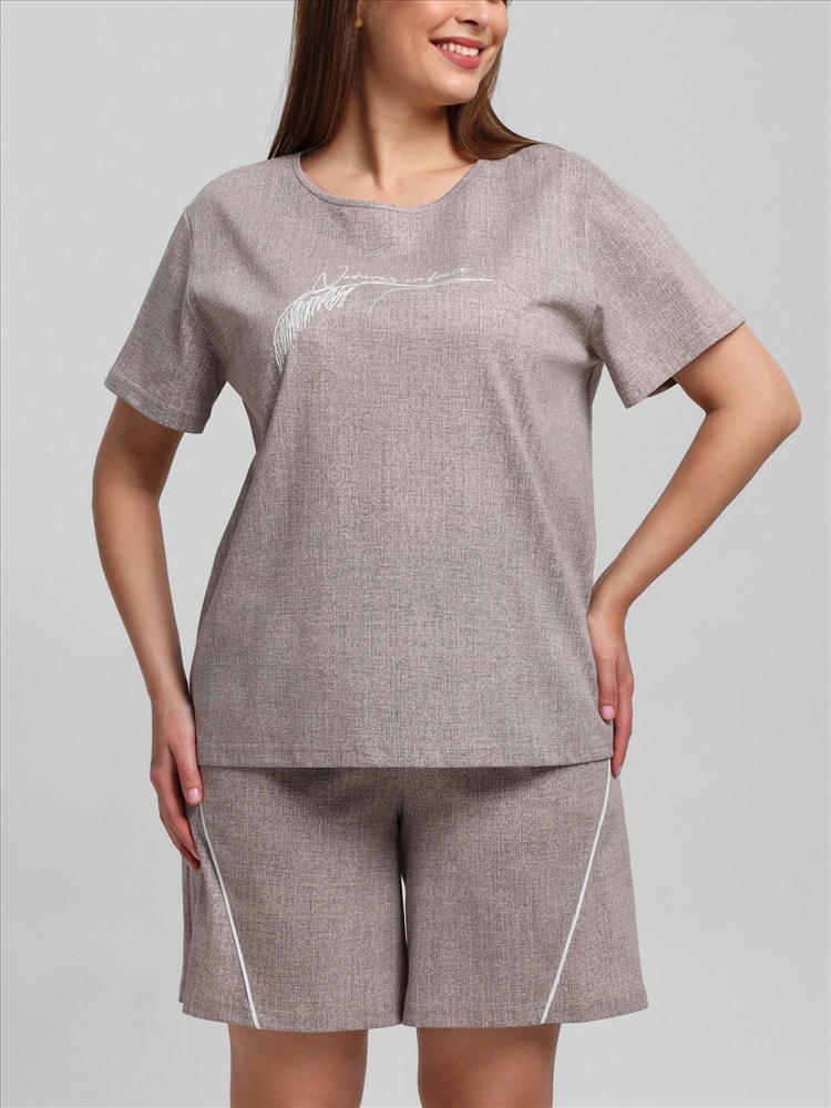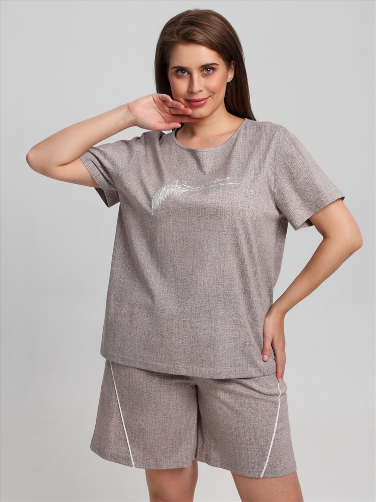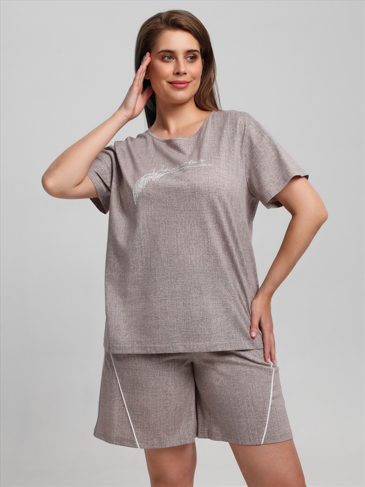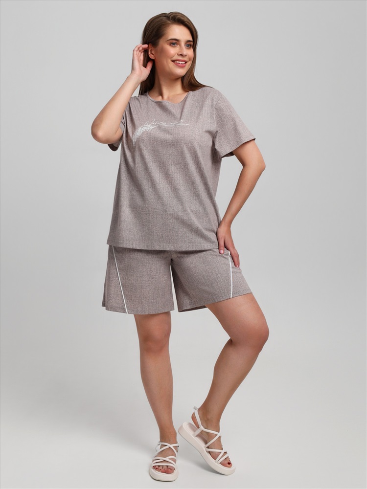 Ткань: Кулирка (пенье) Костюм женский из трикотажного полотна «кулирка» с набивным рисунком, состоящий Футболка – из полотна с набивным рисунком, свободного покроя, с короткими втачными рукавами, горловиной овальной формы, окантованной основным материалом. На полочке выполнена вышивка.Шорты - из полотна с набивным рисунком, свободные, с карманами в боковых швах, на притачном поясе с эластичной тесьмой внутри. Детали передних половин разрезаны по косой, в шве соединения кант контрастного цвета.