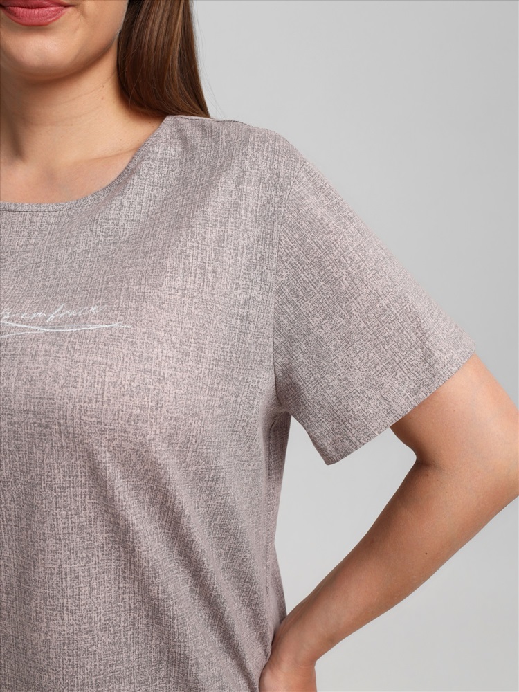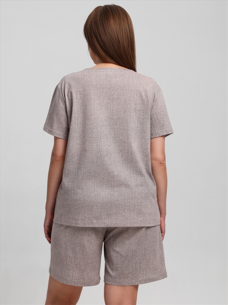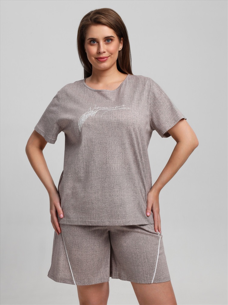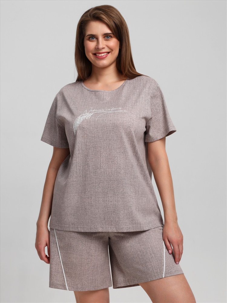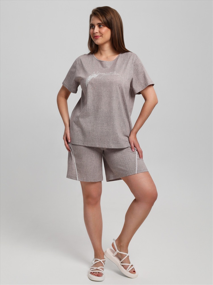 Ткань: Кулирка (пенье) Костюм женский из трикотажного полотна «кулирка» с набивным рисунком, состоящий Футболка – из полотна с набивным рисунком, свободного покроя, с короткими втачными рукавами, горловиной овальной формы, окантованной основным материалом. На полочке выполнена вышивка.Шорты - из полотна с набивным рисунком, свободные, с карманами в боковых швах, на притачном поясе с эластичной тесьмой внутри. Детали передних половин разрезаны по косой, в шве соединения кант контрастного цвета.