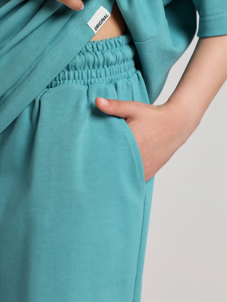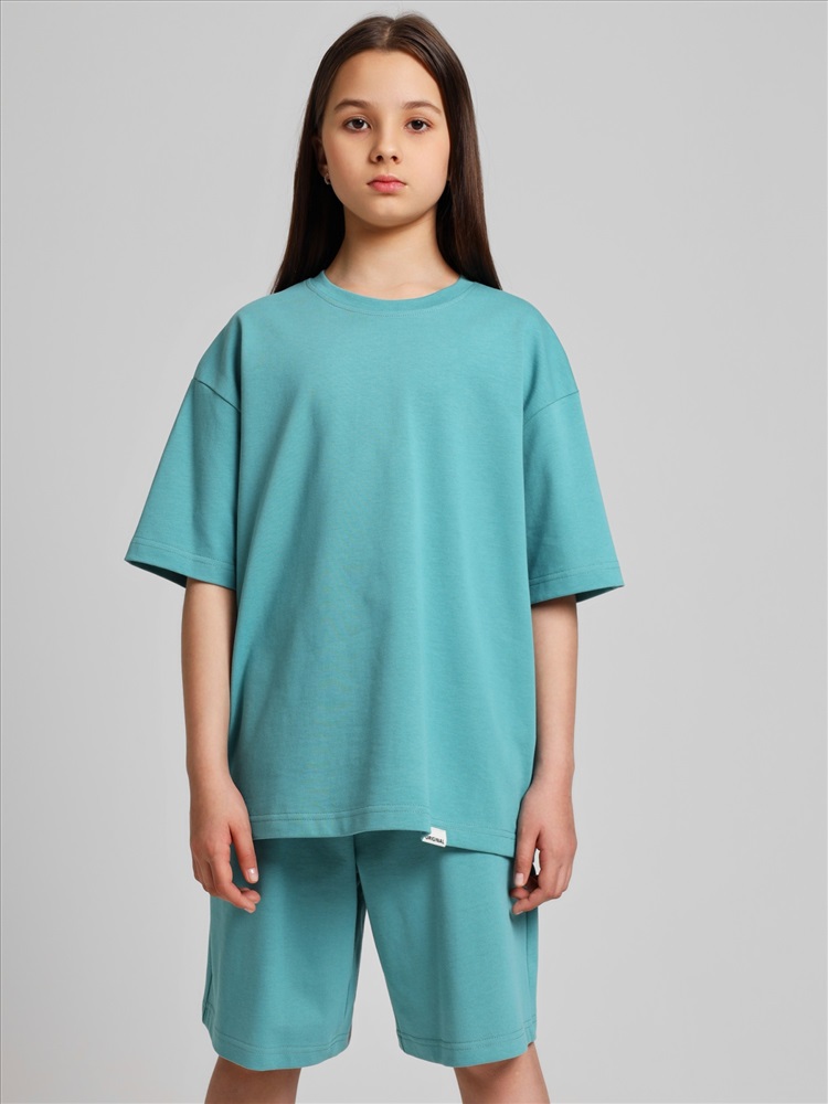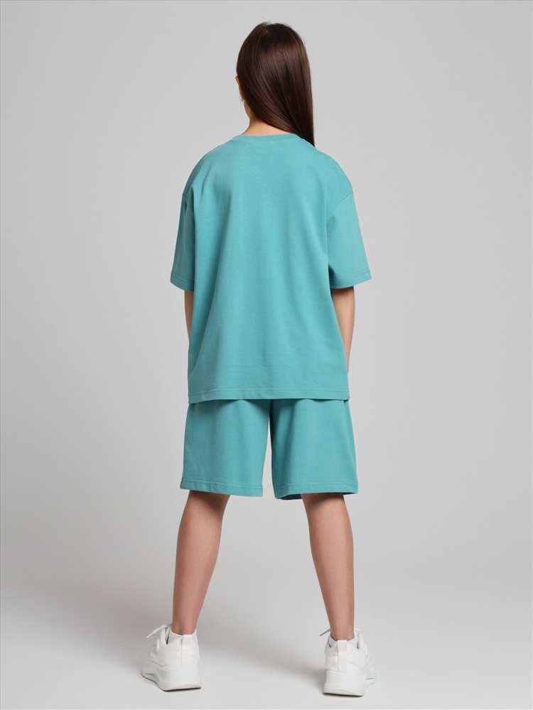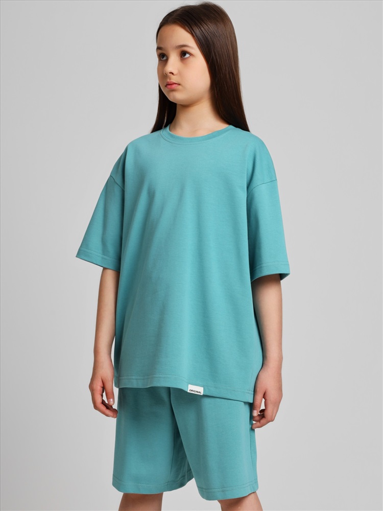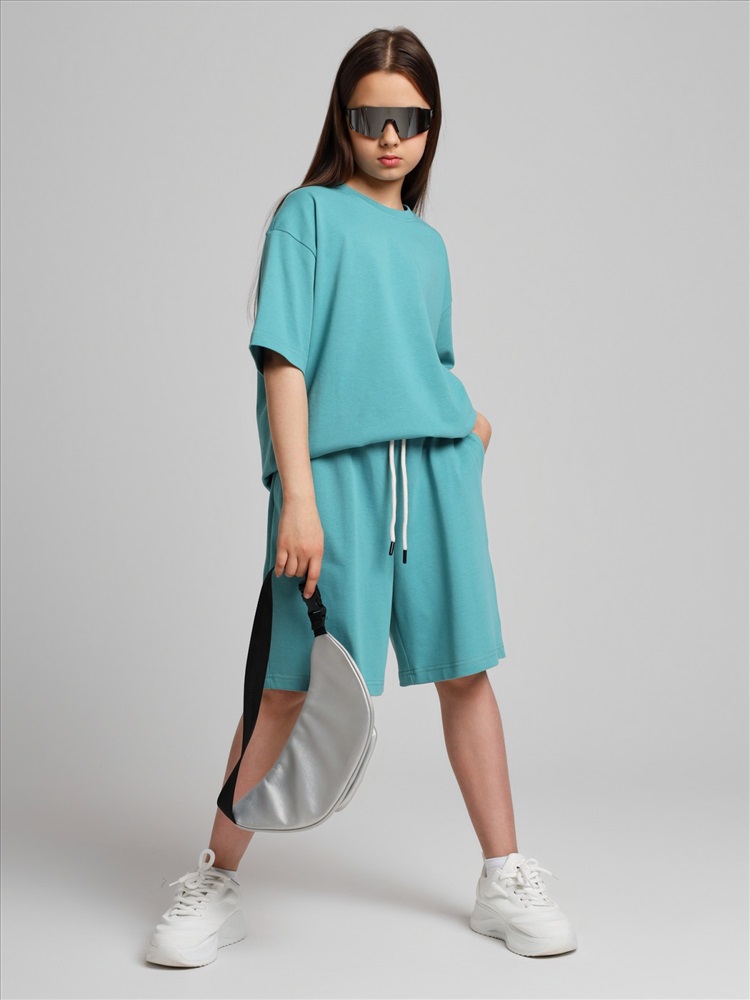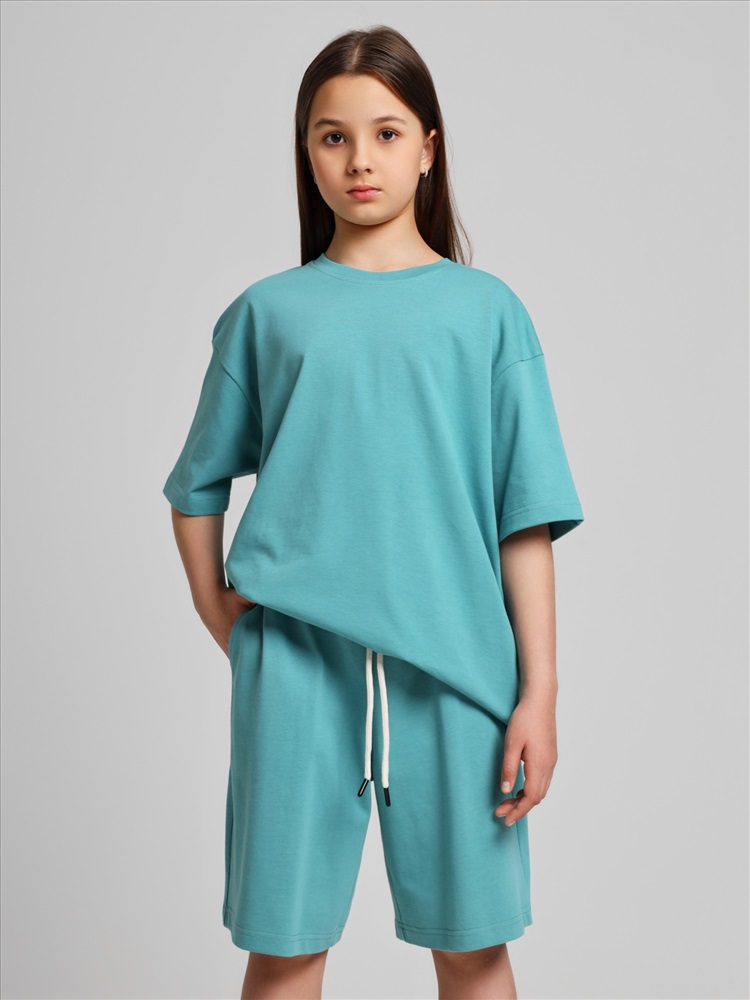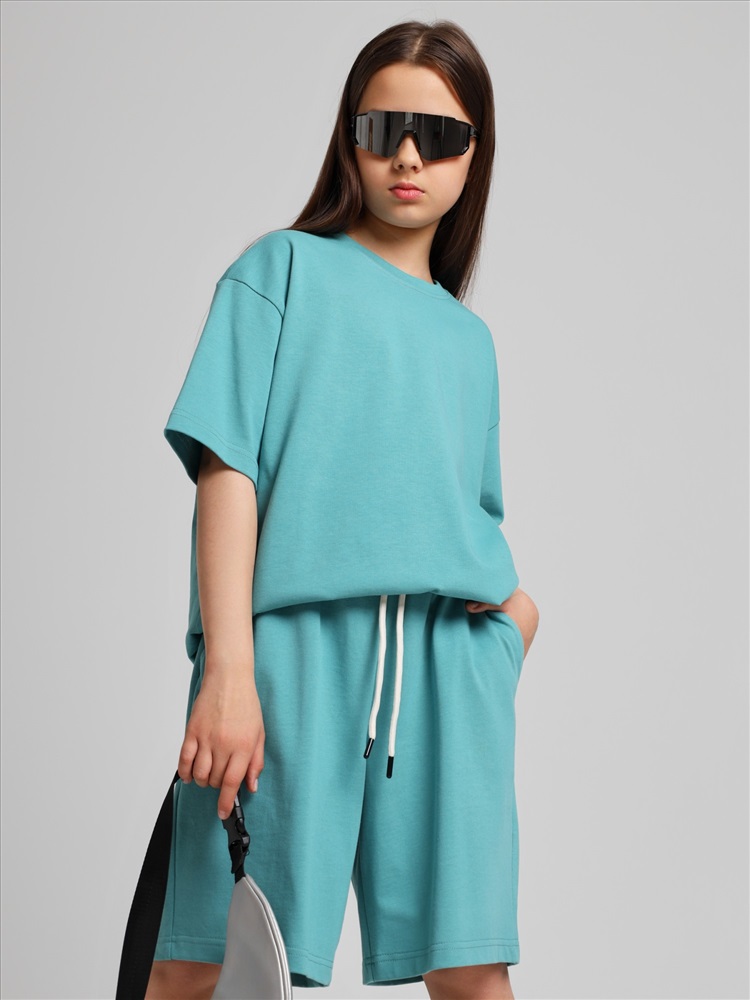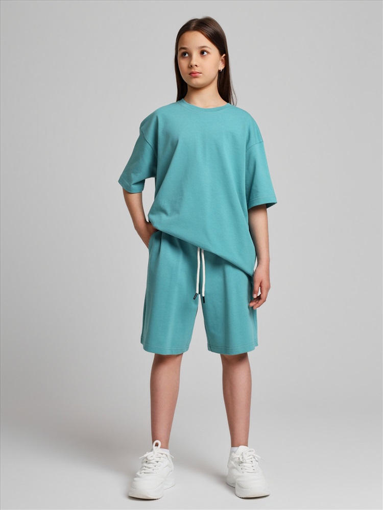 Костюм для девочки из плотного гладкокрашеного трикотажного полотна "кулирка", состоящий из футболки и шорт. Футболка - свободного покроя, с удлиненными плечевым и швами, короткими втачными рукавами и горловиной овальной формы, обработанной втачной планкой. В нижней части переда слева настрочен декоративный элемент прямоугольной формы. По горловине проложена отделочная строчка. Шорты - классического покроя, на притачном поясе с эластичной тесьмой внутри и карманами в боковых швах. Для регулирования степени прилегания шорт по талии в пояс вставлен шнурок, продетый через два отверстия в соединительных швах в центре пояса.