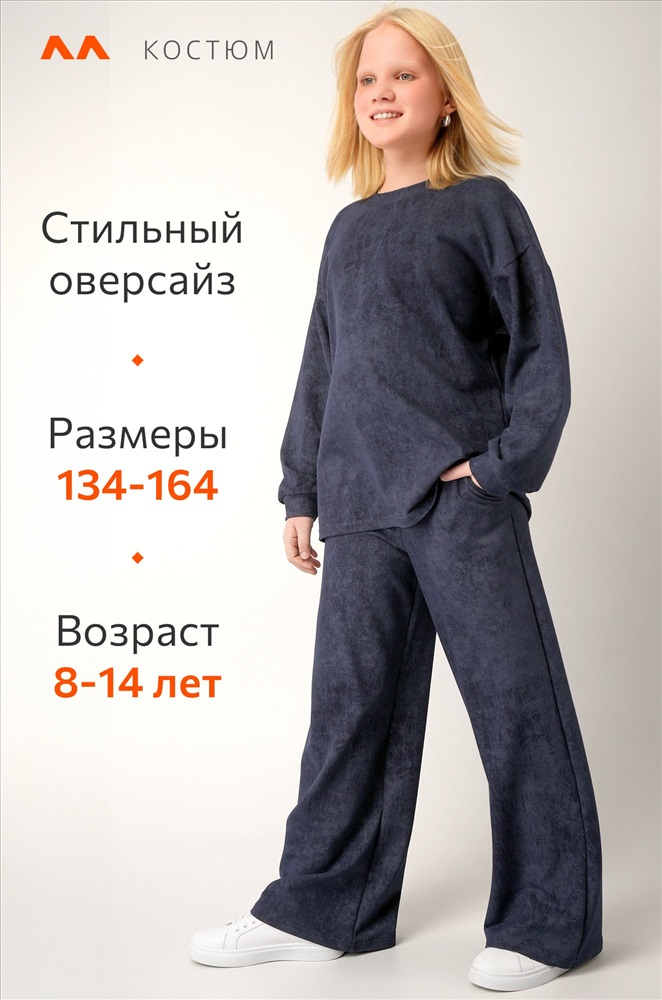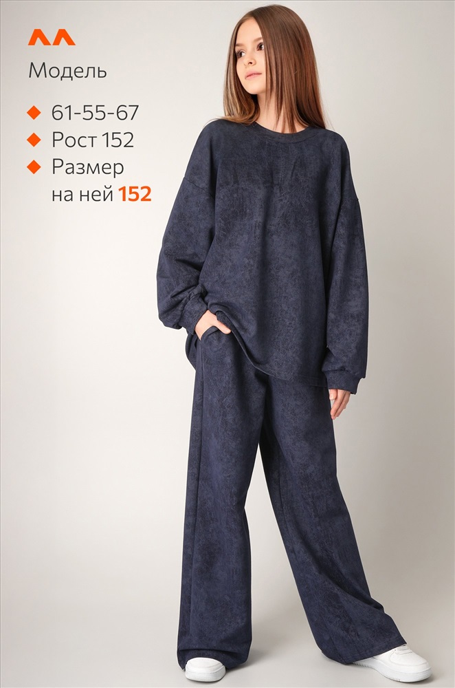 Преимущества: — футер двухнитка (240 г/м²) — плотный и мягкий; — хлопок с добавлением полиэстера — износостойкость + комфорт; — удлинённая толстовка оверсайз со спущенным плечом визуально вытягивает силуэт; — брюки палаццо дарят максимальный комфорт и свободу движений; — ткань с эффектом варёнки — стильная текстура; — костюм подходит для демисезонной погоды. Трикотажный костюм двойка подойдёт девочкам и подросткам для активных будней, прогулок или встреч с друзьями. Хлопковый костюм с широкими штанами — отличный выбор в спортивном и кэжуал стилях. Модель Настя, ее рост 152, параметры: 61-55-67. На ней размер 152. Размер 134: джемпер: длина:55 см; ширина:51 см; длина рукава внешняя: 39 см; длина рукава внутренняя: 37 см; брюки: длина внеш.шва:85 см; длина внутр.шва:61 см; ширина по бедрам:39 см. Размер 140: джемпер: длина:57 см; ширина:53 см; длина рукава внешняя: 41 см; длина рукава внутренняя: 39 см; брюки: длина внеш.шва:89 см; длина внутр.шва:64 см; ширина по бедрам:40 см. Размер 146: джемпер: длина:60 см; ширина:55 см; длина рукава внешняя: 43 см; длина рукава внутренняя: 40 см; брюки: длина внеш.шва:93 см; длина внутр.шва:67 см; ширина по бедрам:41 см. Размер 152: джемпер: длина:63 см; ширина:56 см; длина рукава внешняя: 45 см; длина рукава внутренняя: 42 см; брюки: длина внеш.шва:97 см; длина внутр.шва:70 см; ширина по бедрам:43 см. Размер 158: джемпер: длина:66 см; ширина:57 см; длина рукава внешняя: 47 см; длина рукава внутренняя: 44 см; брюки: длина внеш.шва:100 см; длина внутр.шва:72 см; ширина по бедрам:45 см. Размер 164: джемпер: длина:69 см; ширина:59 см; длина рукава внешняя: 49 см; длина рукава внутренняя: 46 см; брюки: длина внеш.шва:104 см; длина внутр.шва:75 см; ширина по бедрам:47 см. *замеры выборочные, могут незначительно отличаться. Комментарии к товару