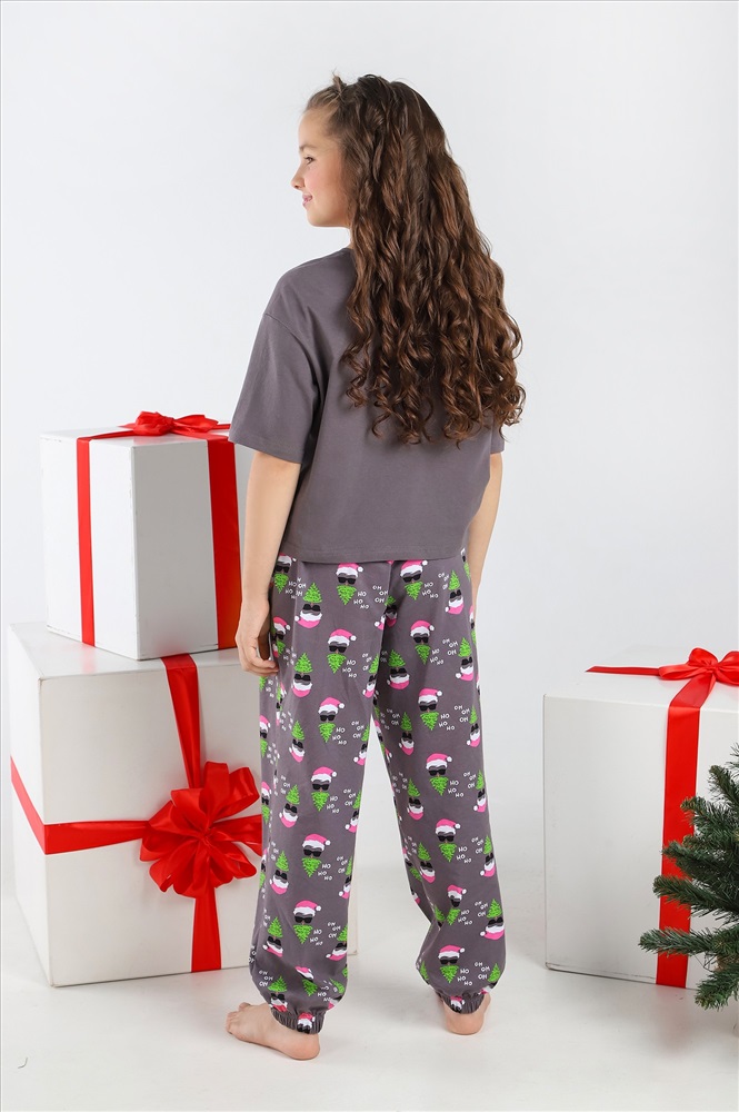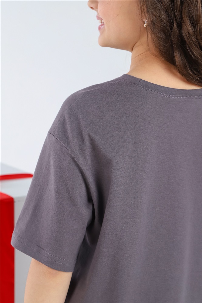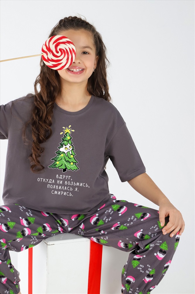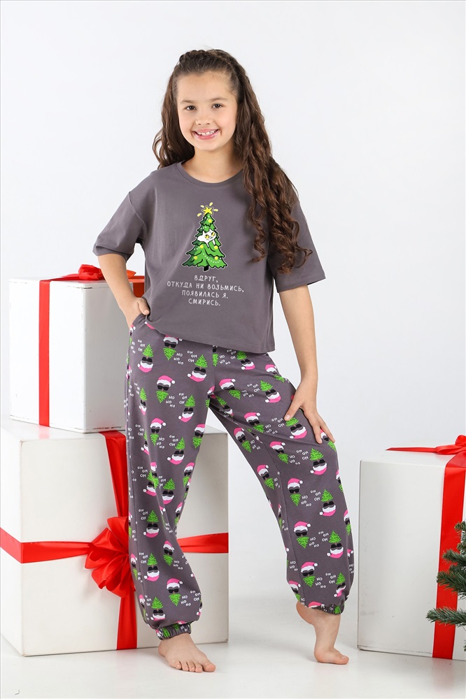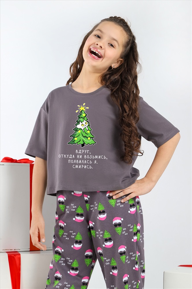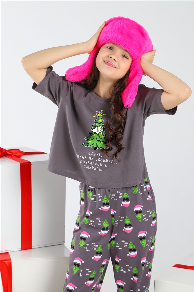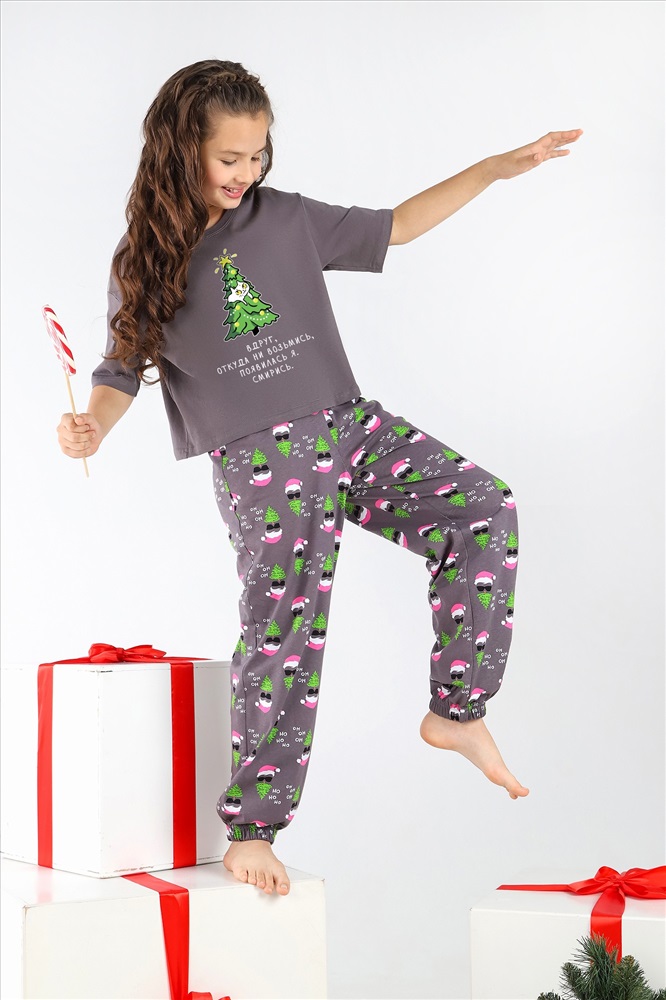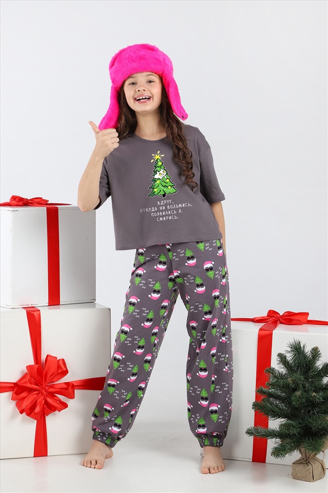 Костюм для девочки из трикотажного полотна "кулирка" в комбинации двух видов: гладкокрашеного и с набивным рисунком, состоящий из футболки и брюк.Футболка - из гладкокрашеного полотна с принтом на детали переда, короткими втачными рукавами, удлиненными плечевыми швами и горловиной овальной формы, обработанной втачной планкой. По шву втачивания планки в горловину настрочена отделочная строчка. Нижние срезы рукавов и изделия обработаны швом вподгибку. Брюки - из полотна с набивным рисунком, на притачном поясе с эластичной тесьмой внутри, карманами в боковых швах. Нижние срезы обработаны швом вподгибку с эластичной тесьмой