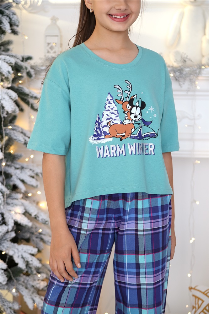 Костюм для девочки из трикотажного полотна "кулирка", состоящий из футболки и брюк. Футболка - из гладкокрашеного полотна, модного слегка расширенного силуэта и укороченная по длине, с втачными короткими рукавами, горловиной овальной формы, обработанной втачной планкой и принтом на полочке, выполненным методом шелкографии. Брюки - из полотна в клетку, широкие, прямые, на притачном поясе с эластичной тесьмой внутри и карманами в боковых швах .