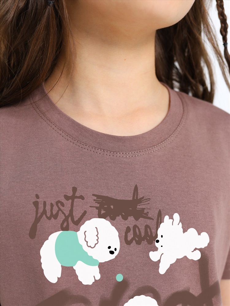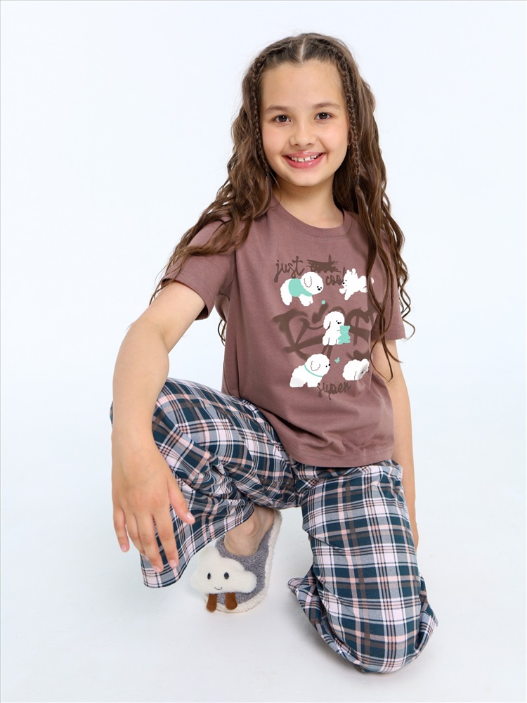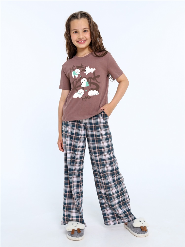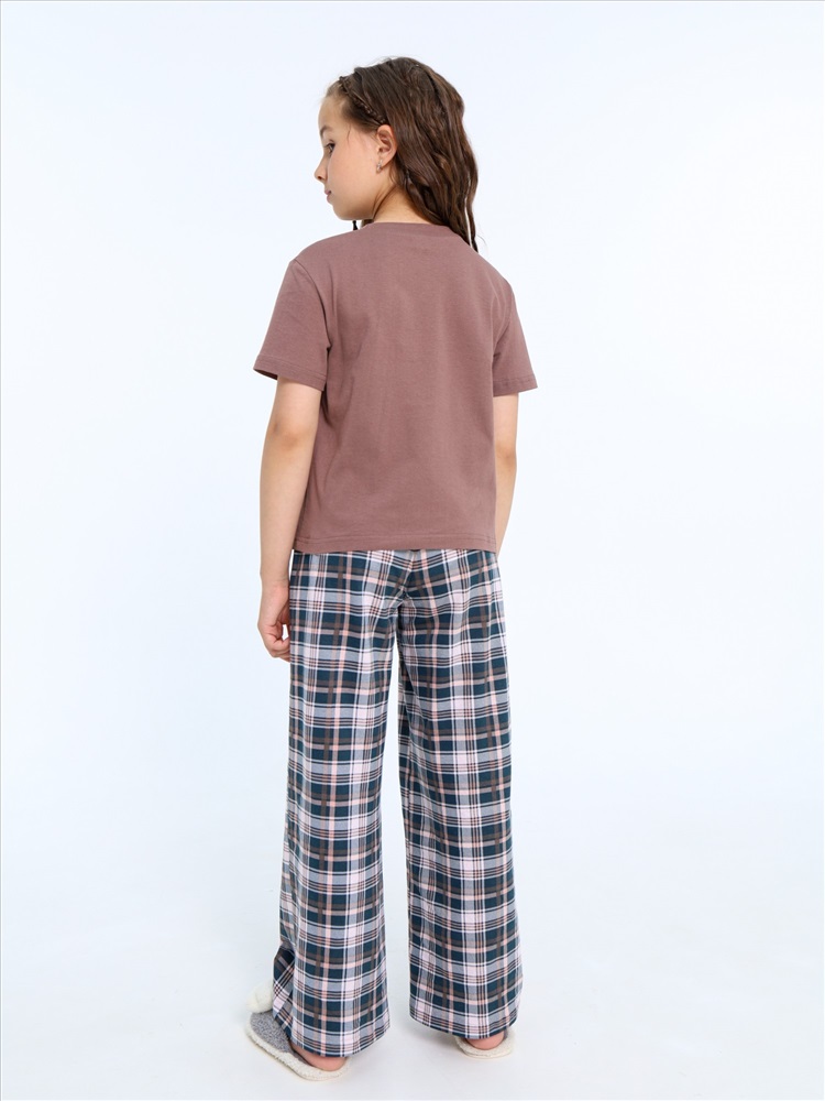 Костюм для девочки. Футболка базового покроя, с принтом. Брюки из полотна в клетку, расширенные к низу, с боковыми карманами, на притачном поясе с отстроченной эластичной тесьмой.