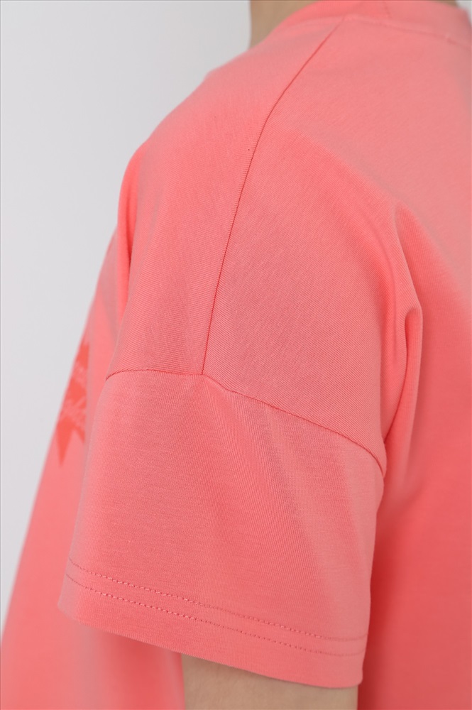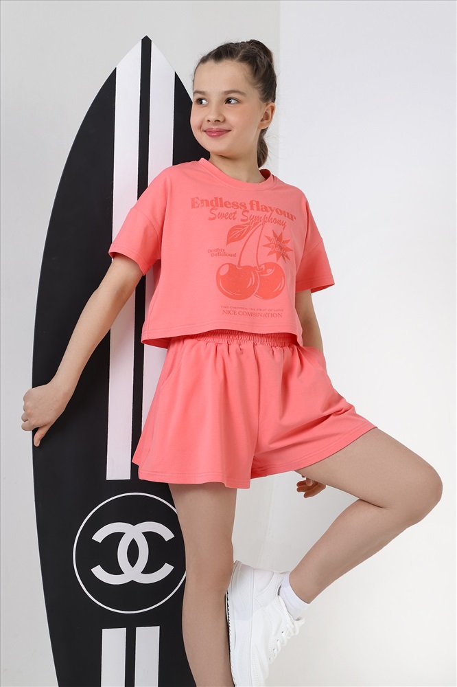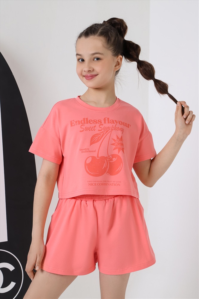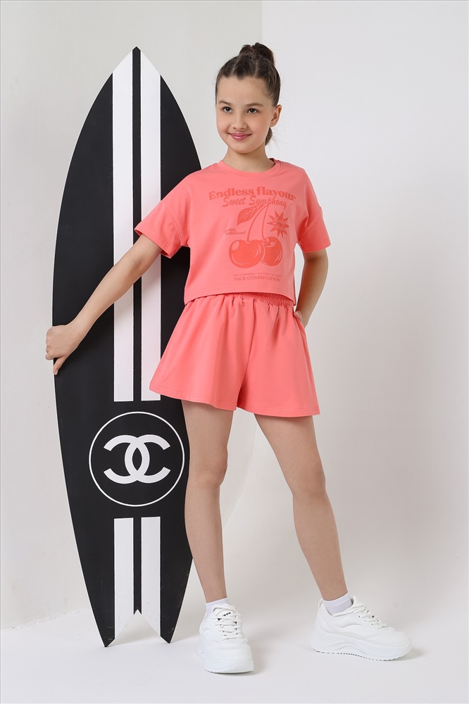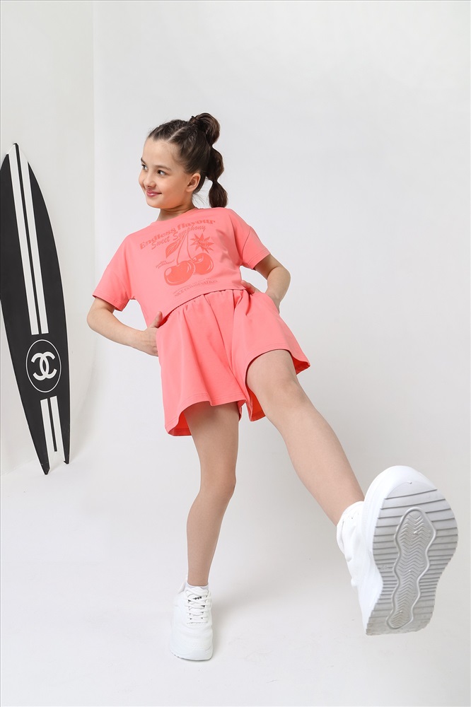Ткань: Кулирка с лайкрой Эффектный костюм для девочки из хлопкового полотна с лайкрой. Футболка с принтом в модной стилистике, свободная, со спущенной линией плеч, округлым вырезом горловины, короткими рукавами. Шорты-юбка с боковыми карманами, на притачном поясе с отстроченной эластичной тесьмой.