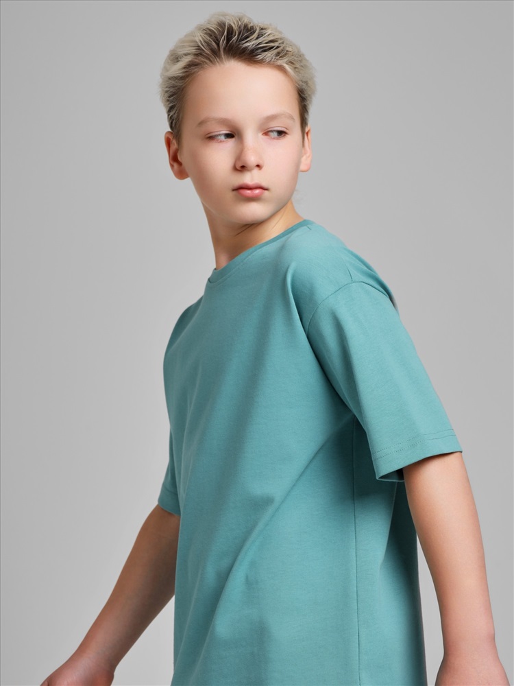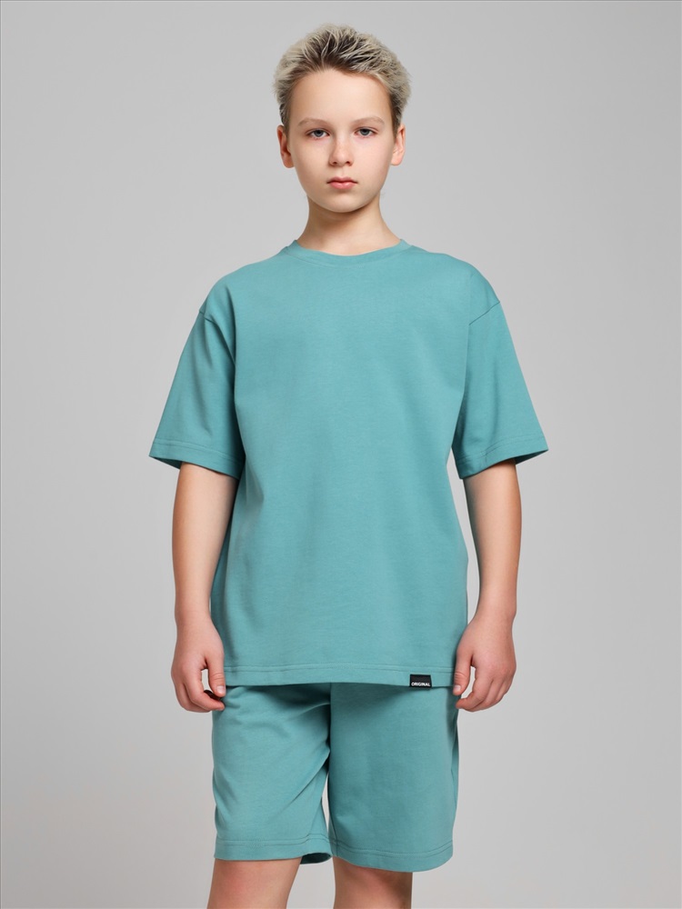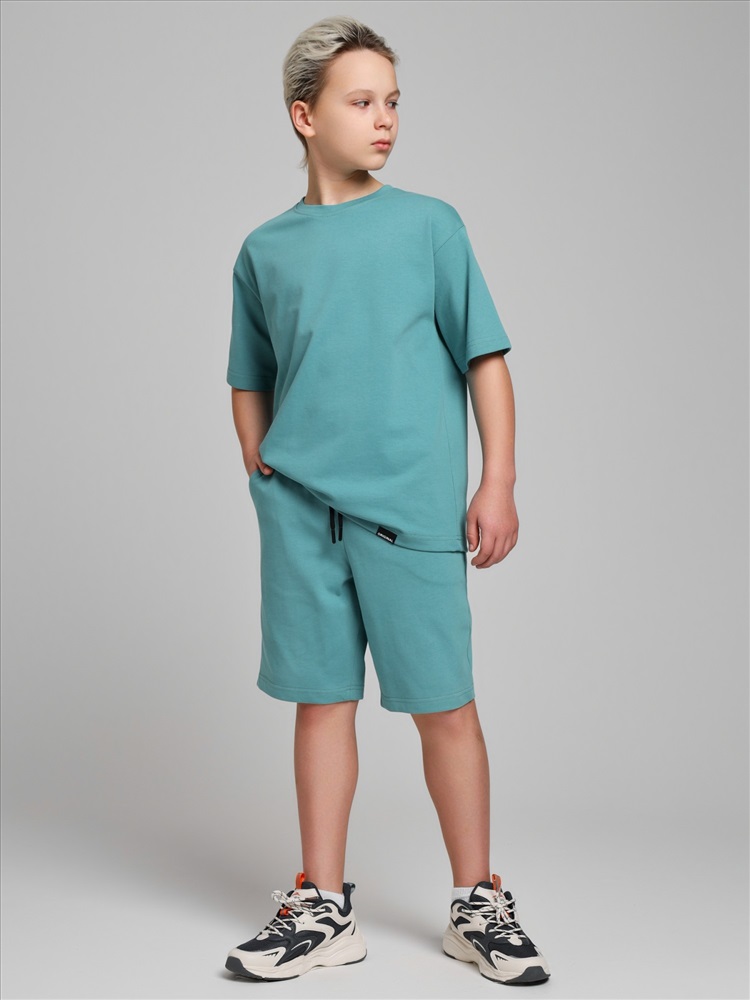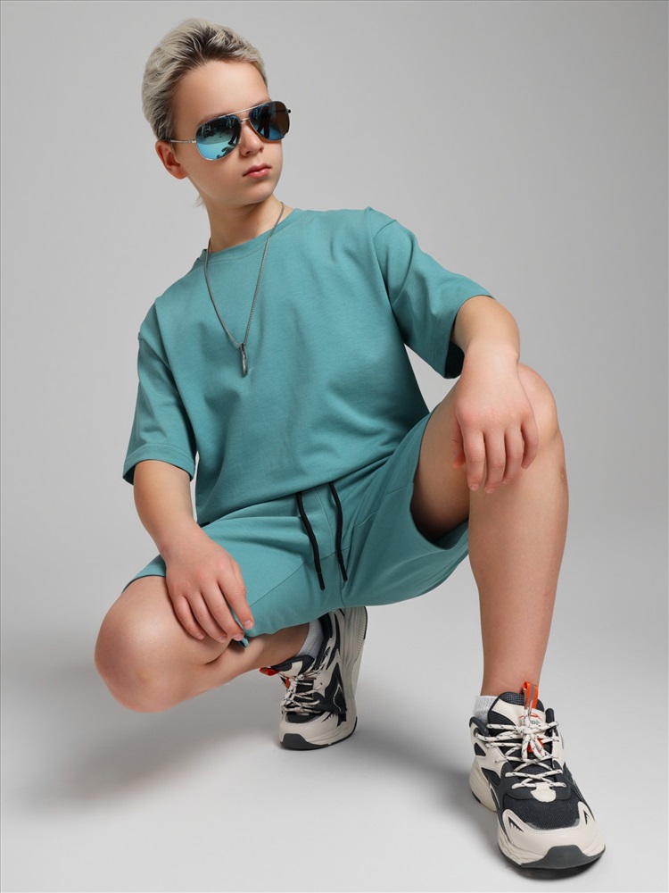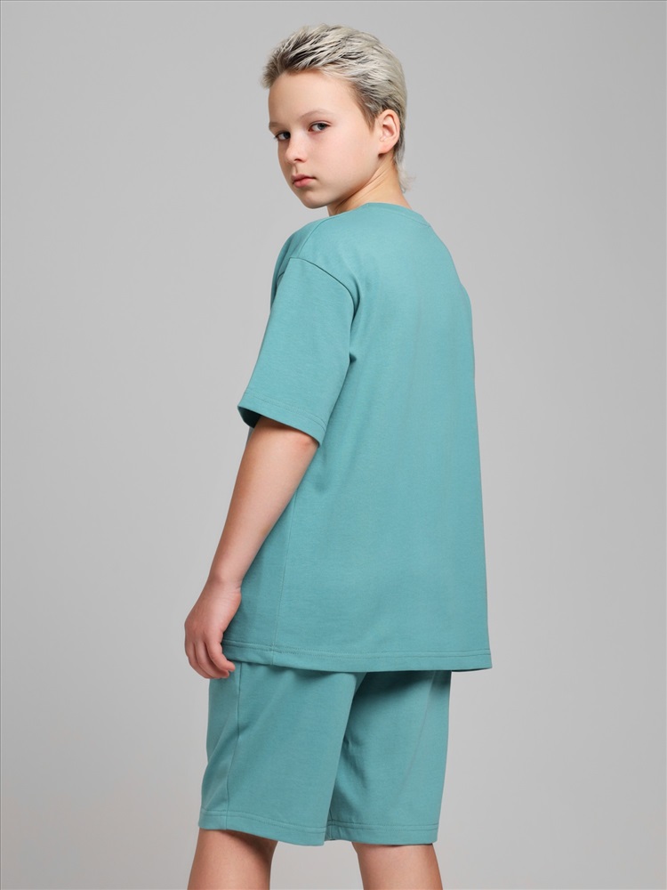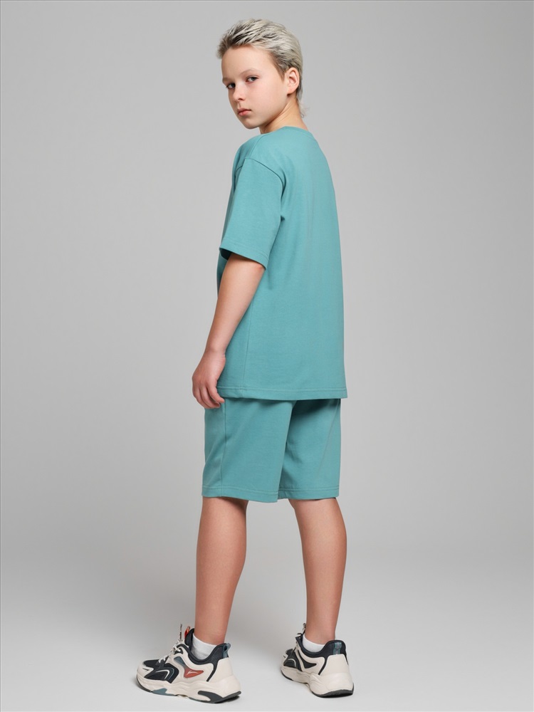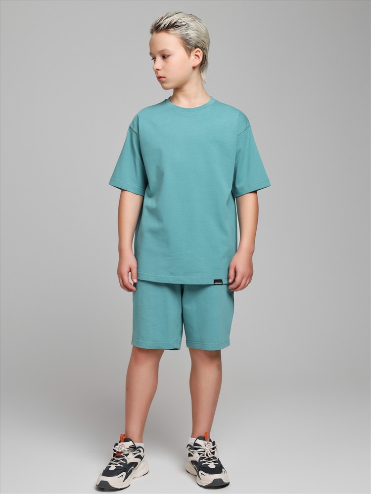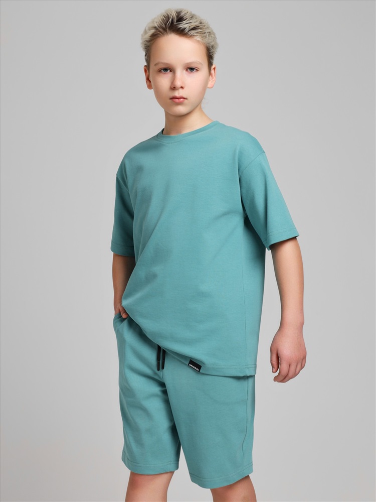 Костюмдля мальчика из плотного гладкокрашеного трикотажного полотна "кулирка", состоящий из футболки и шорт. Футболка - свободного покроя, с удлиненными плечевым и швами, короткими втачными рукавами и горловиной овальной формы, обработанной втачной планкой. В нижней части переда слева настрочен декоративный элемент прямоугольной формы. По горловине проложена отделочная строчка. Шорты - классического покроя, на притачном поясе с эластичной тесьмой внутри и карманами в боковых швах. Для регулирования степени прилегания шорт по талии в пояс вставлен шнурок, продетый через две петли в центре пояса.
