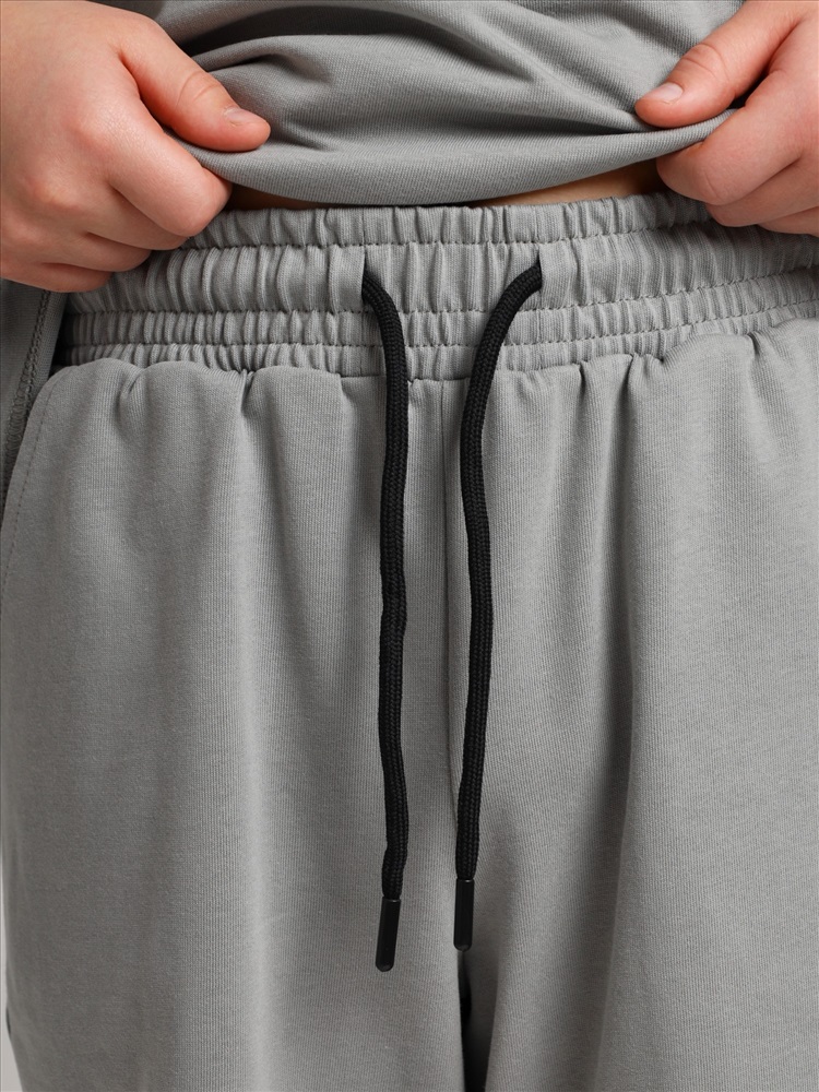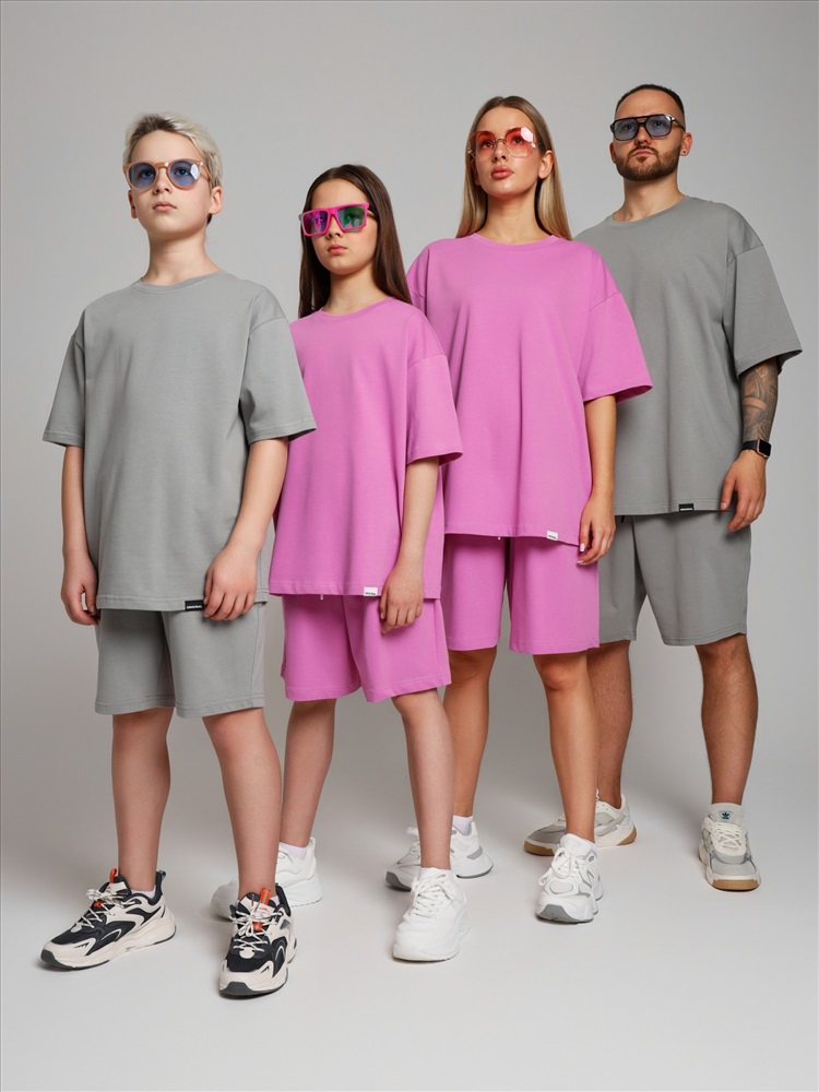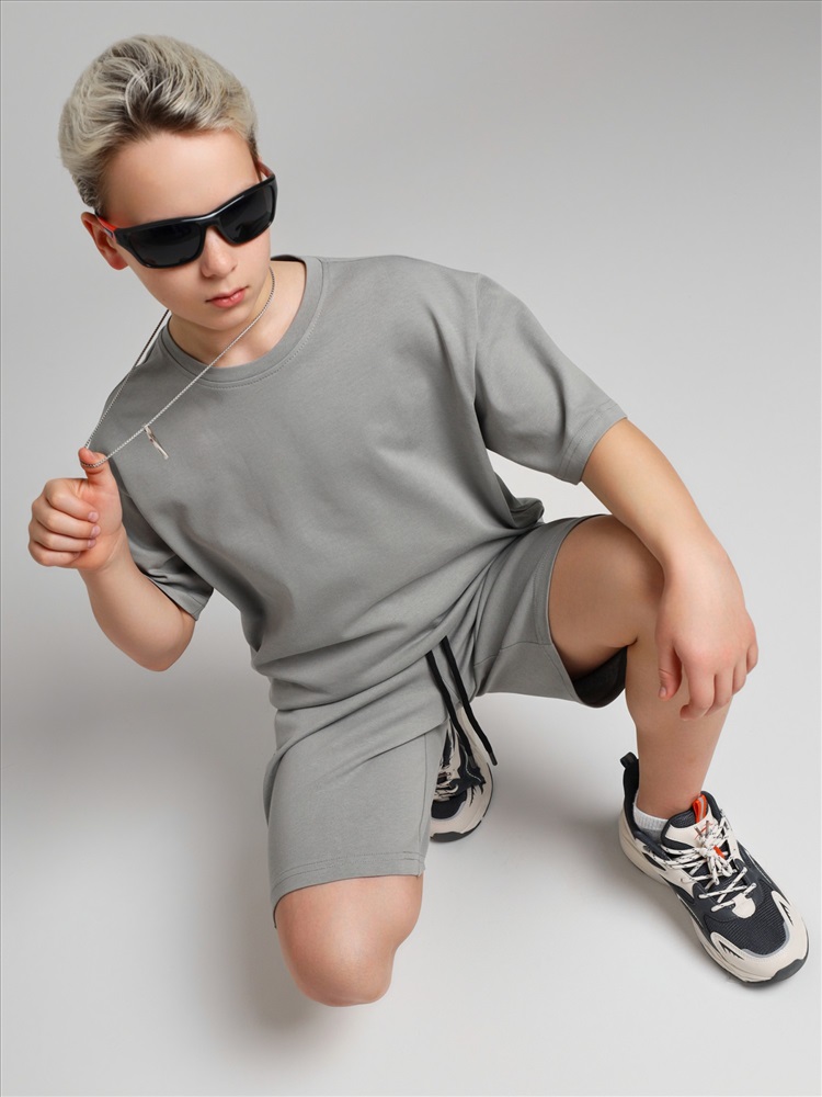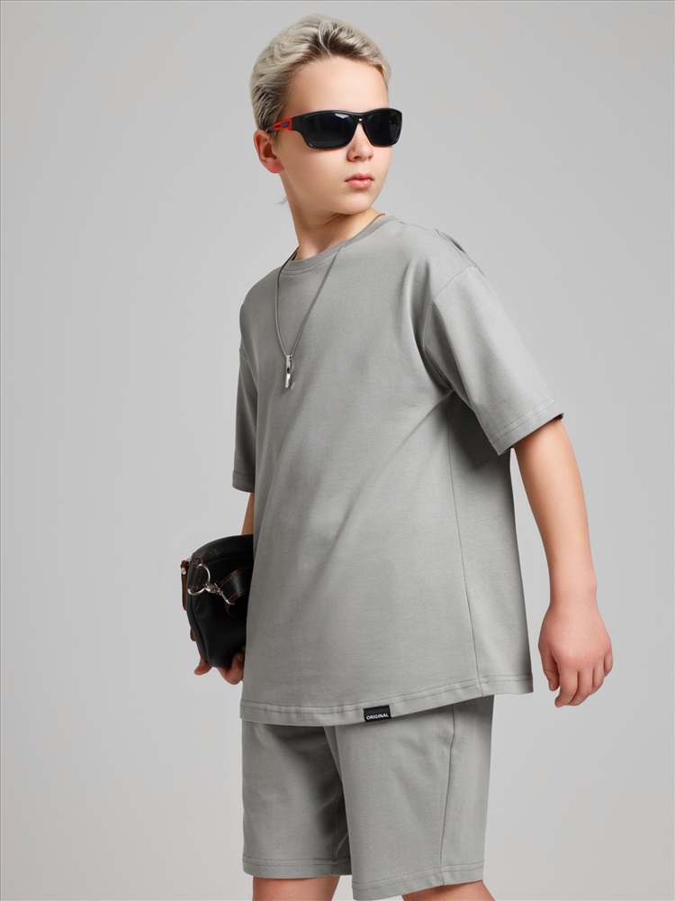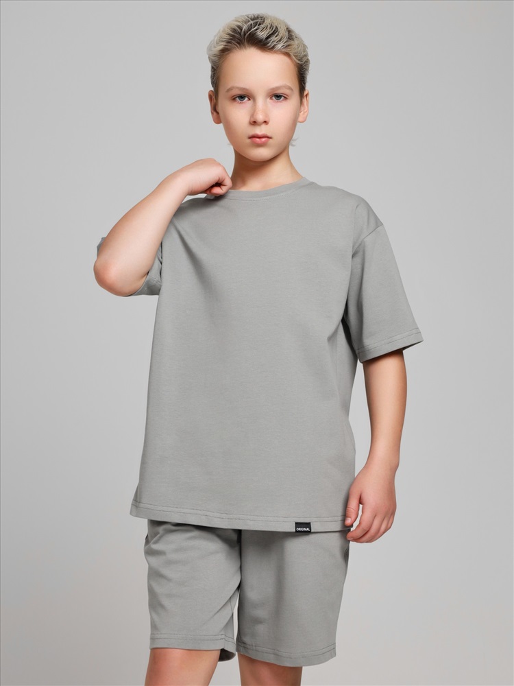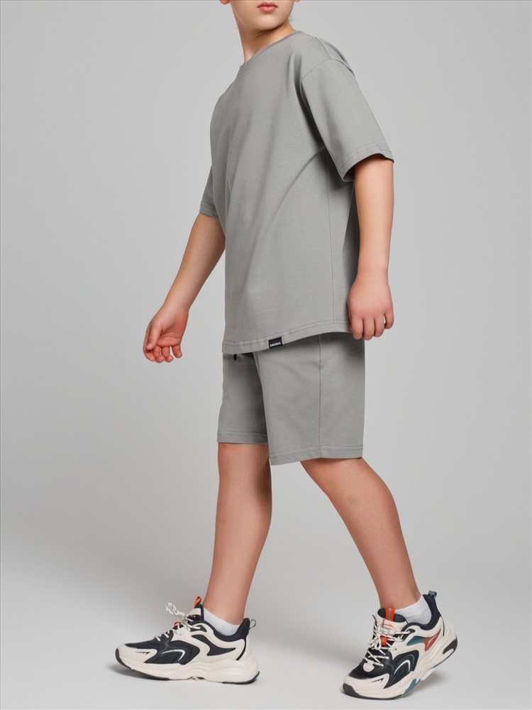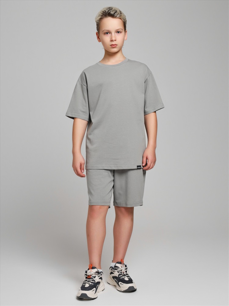 Костюмдля мальчика из плотного гладкокрашеного трикотажного полотна "кулирка", состоящий из футболки и шорт. Футболка - свободного покроя, с удлиненными плечевым и швами, короткими втачными рукавами и горловиной овальной формы, обработанной втачной планкой. В нижней части переда слева настрочен декоративный элемент прямоугольной формы. По горловине проложена отделочная строчка. Шорты - классического покроя, на притачном поясе с эластичной тесьмой внутри и карманами в боковых швах. Для регулирования степени прилегания шорт по талии в пояс вставлен шнурок, продетый через две петли в центре пояса.