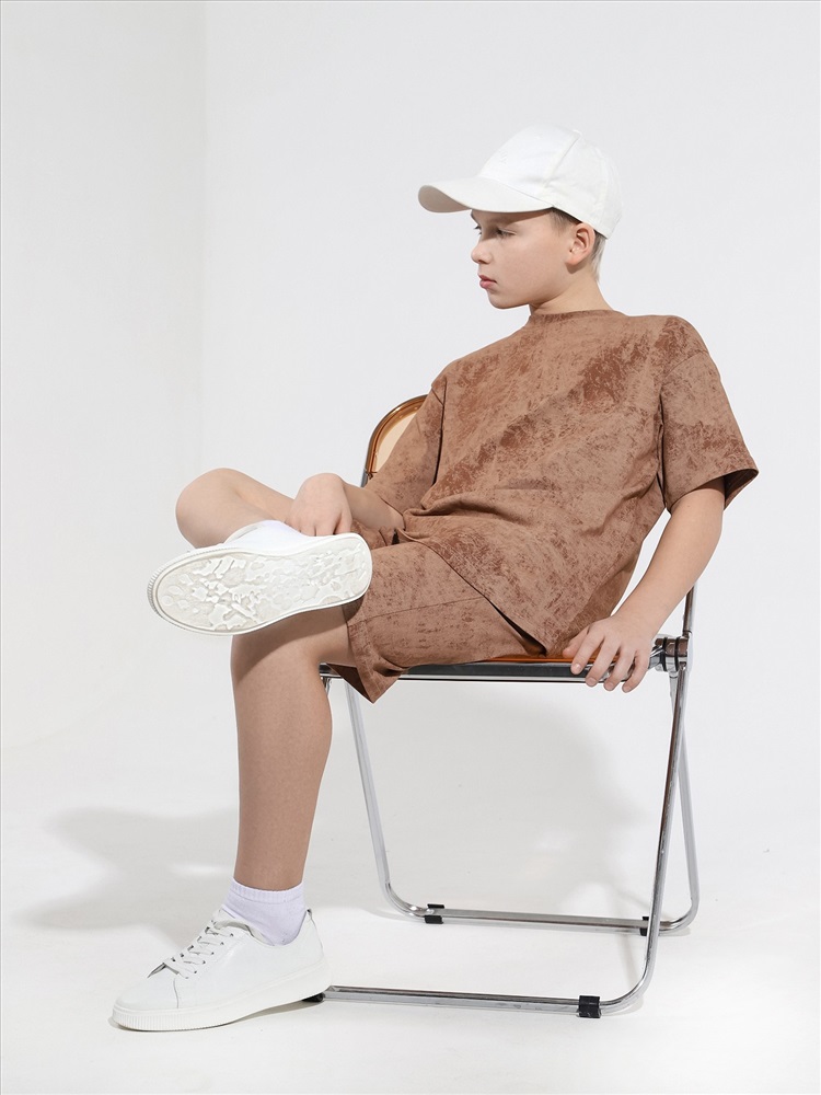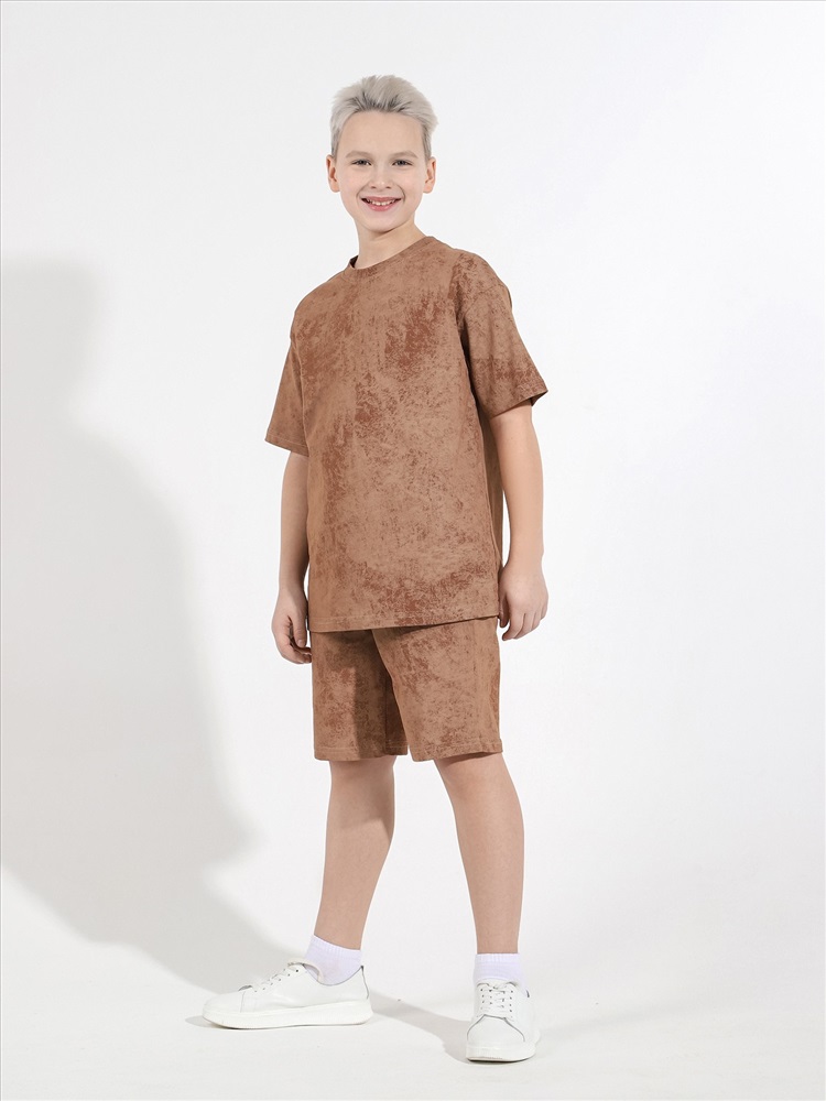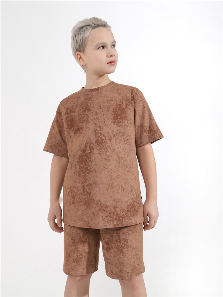 Костюм для мальчика, состоящий из футболки и шорт. Футболка - свободного покроя, короткими втачными рукавами и горловиной овальной формы, обработанной втачной планкой. По шву втачивания планки настрочена двойная отделочная строчка. Шорты - удлиненные, с карманами в боковых швах, на притачном поясе с эластичной тесьмой внутри.