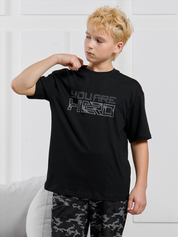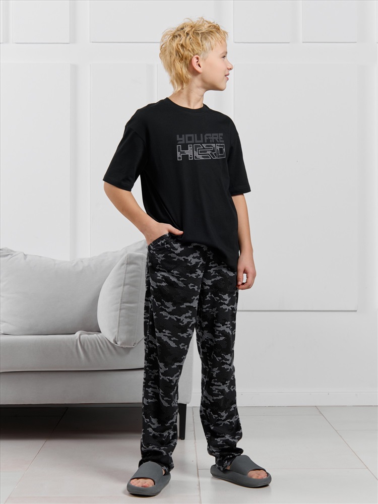 Ткань: Кулирка Кулирка - это самое гладкое и тонкое трикотажное полотно из чистого хлопка. С лицевой стороны ткань «кулирка» выглядит как «вертикальные косички», орнамент изнаночной стороны напоминает «кирпичную кладку». Свойства кулирного трикотажа- воздухопроницаемость, гигроскопичность, не теряя своей формы, практически не тянется в длину и хорошо растягивается в ширину, не образует складки. Костюмдля мальчика, состоящий из футболки и брюк. Футболка однотонная с принтом на груди; модель свободная, со спущенной линией плеч, овальным вырезом горловины. Брюки из полотна с набивным рисунком эксклюзивного дизайна, прямые, с боковыми карманами с обтачными входами, на притачном поясе с отстроченной эластичной тесьмой.