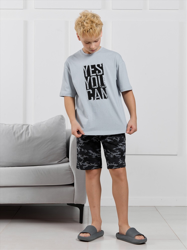 Костюм для мальчика, состоящий из футболки и шорт. Футболка однотонная с принтом на груди; модель свободная, со спущенной линией плеч. Шорты из полотна с набивным рисунком эксклюзивного дизайна, с боковыми карманами с обтачными входами, на притачном поясе с отстроченной эластичной тесьмой.