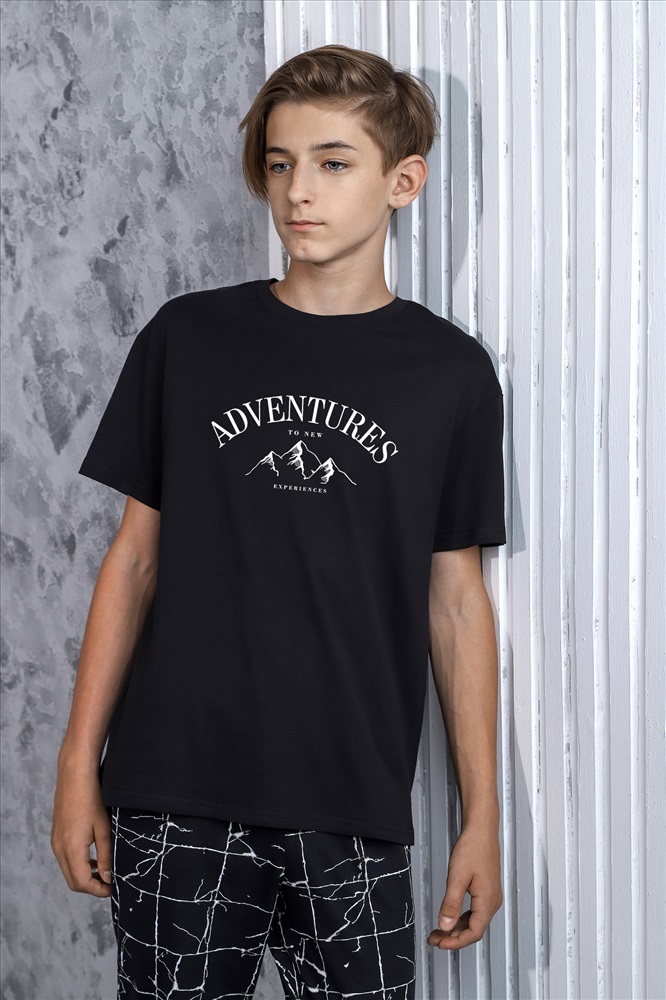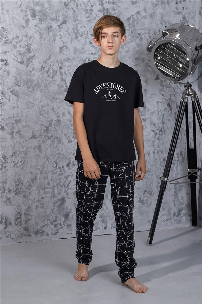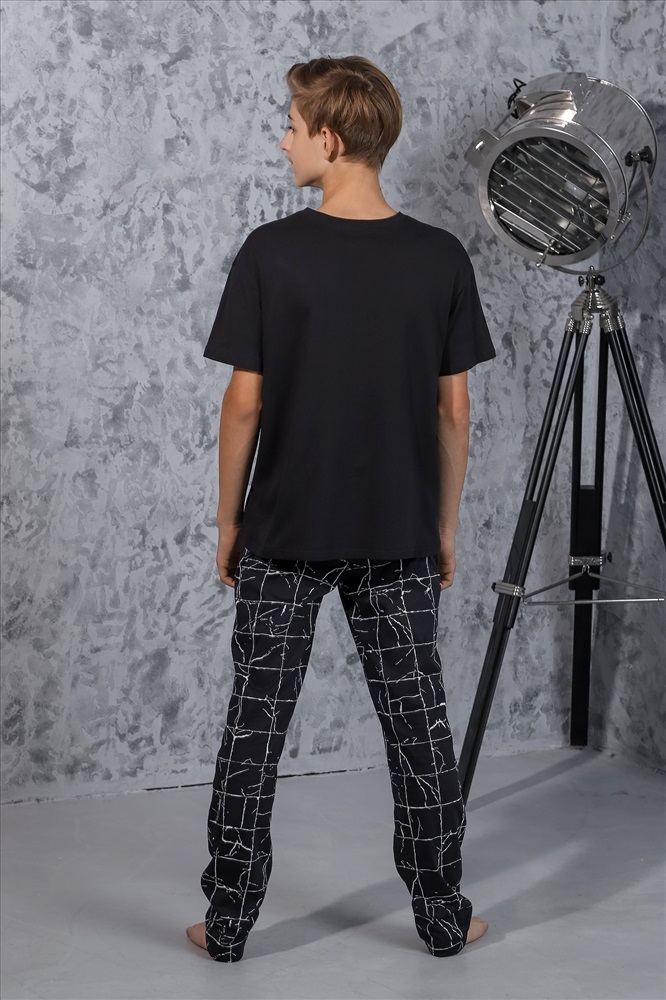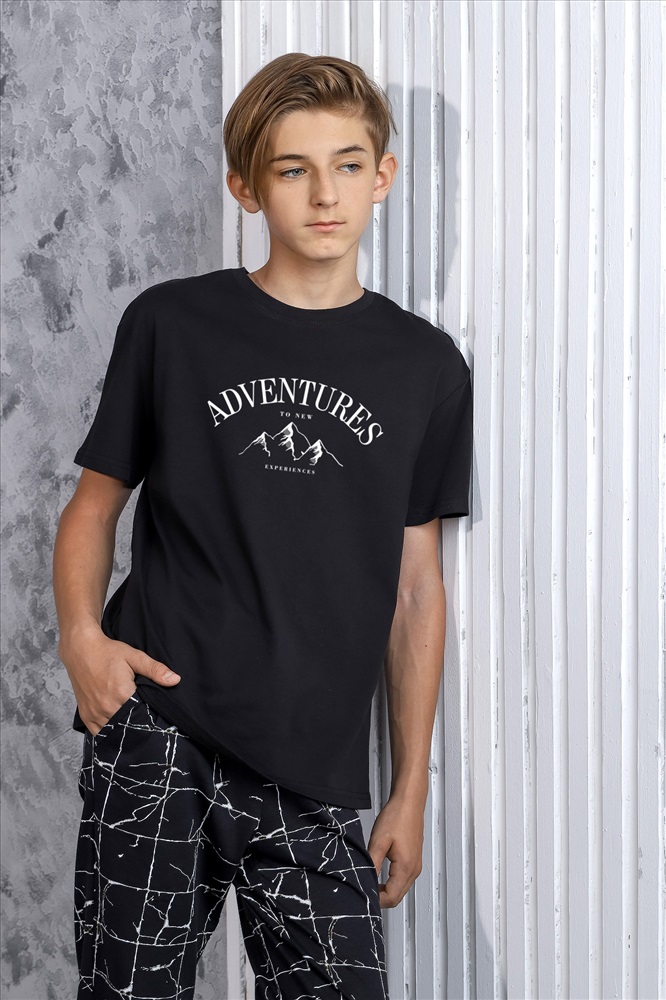 Костюм для мальчика, из хлопчатобумажных трикотажных полотен кулирного переплетения. Однотонная футболка со слегка спущенной линией плеч, округлым вырезом горловины, с принтом. Брюки из полотна с набивным рисунком эксклюзивного дизайна, прямые, на притачном поясе с отстроченной эластичной тесьмой, с боковыми карманами.