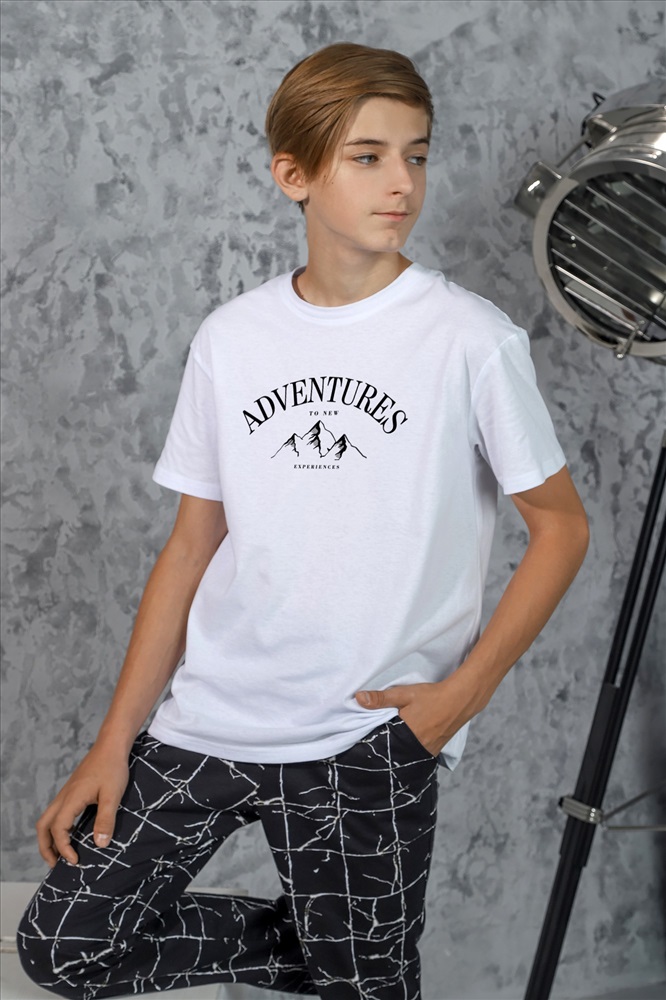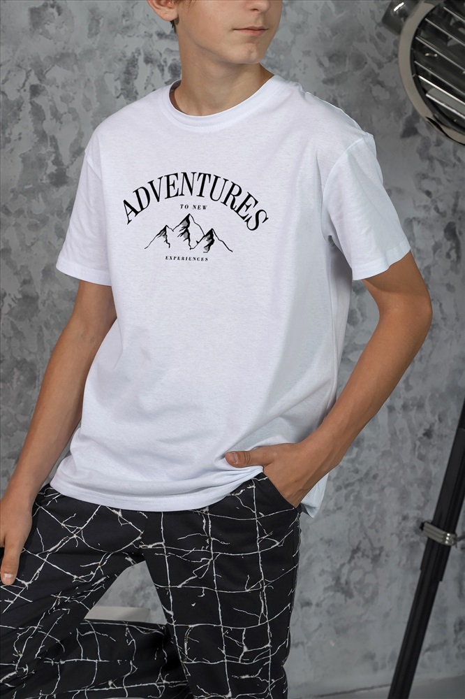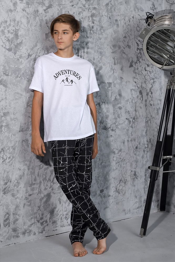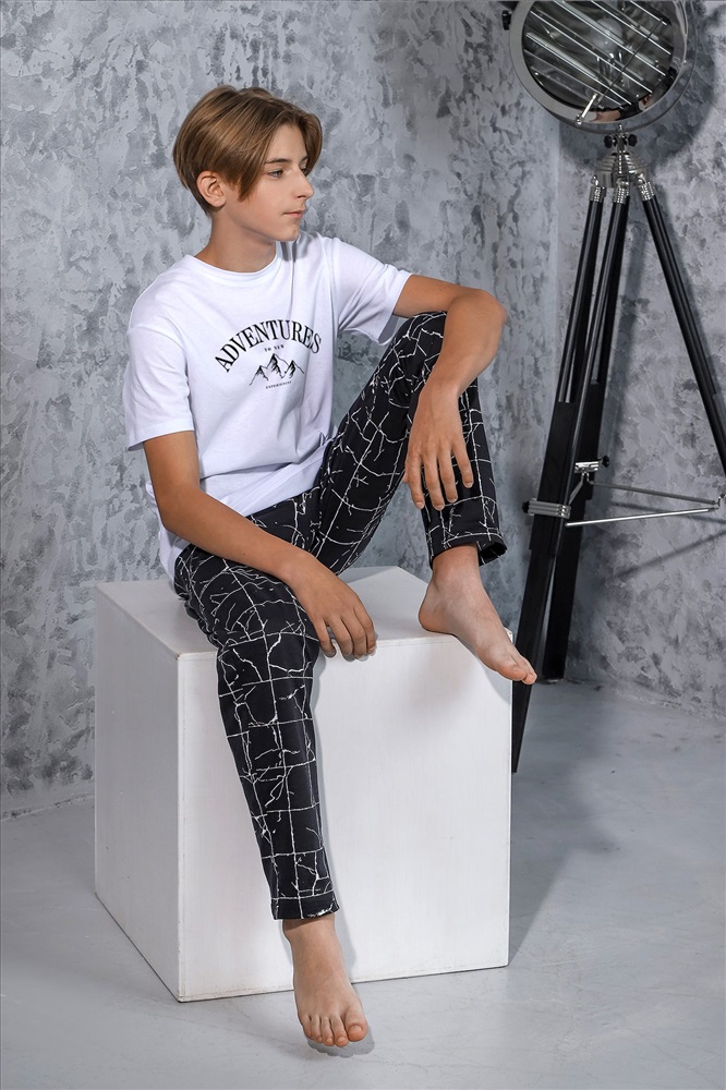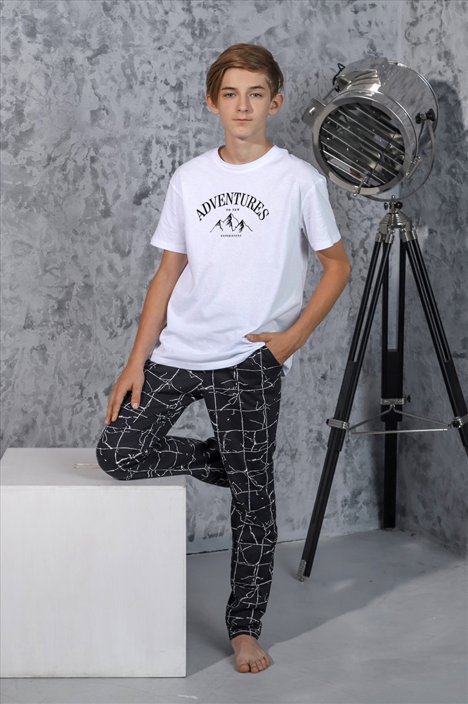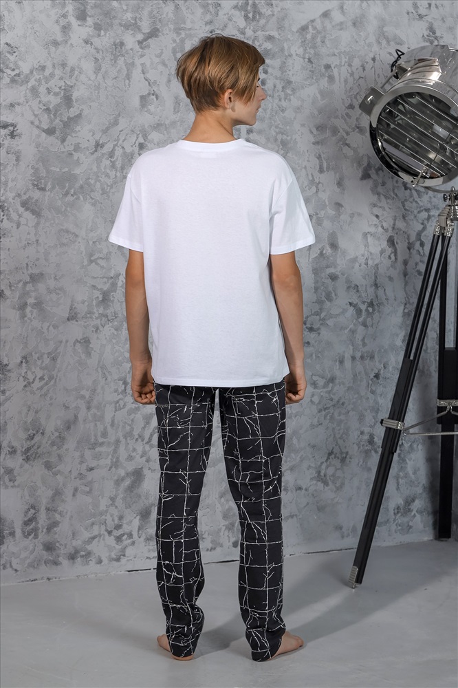 Ткань: Кулирка Кулирка - это самое гладкое и тонкое трикотажное полотно из чистого хлопка. С лицевой стороны ткань «кулирка» выглядит как «вертикальные косички», орнамент изнаночной стороны напоминает «кирпичную кладку». Свойства кулирного трикотажа- воздухопроницаемость, гигроскопичность, не теряя своей формы, практически не тянется в длину и хорошо растягивается в ширину, не образует складки. Костюм для мальчика, из хлопчатобумажных трикотажных полотен кулирного переплетения. Однотонная футболка со слегка спущенной линией плеч, округлым вырезом горловины, с принтом. Брюки из полотна с набивным рисунком эксклюзивного дизайна, прямые, на притачном поясе с отстроченной эластичной тесьмой, с боковыми карманами.