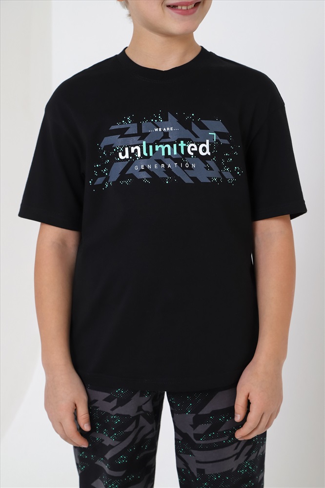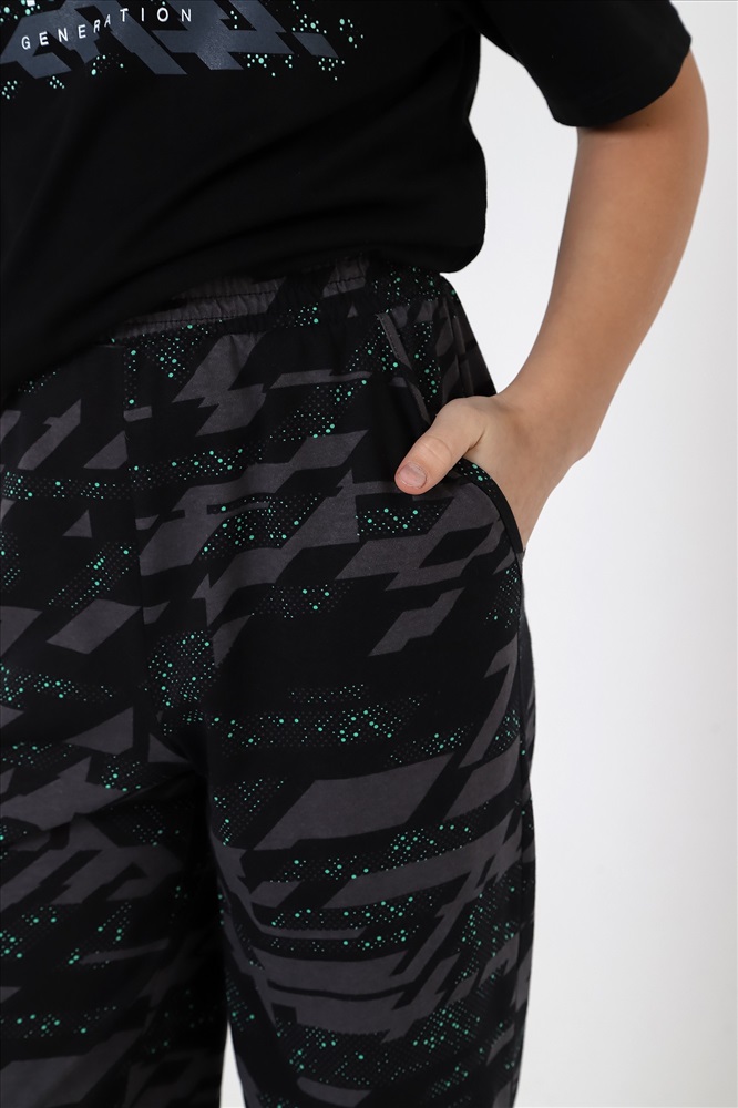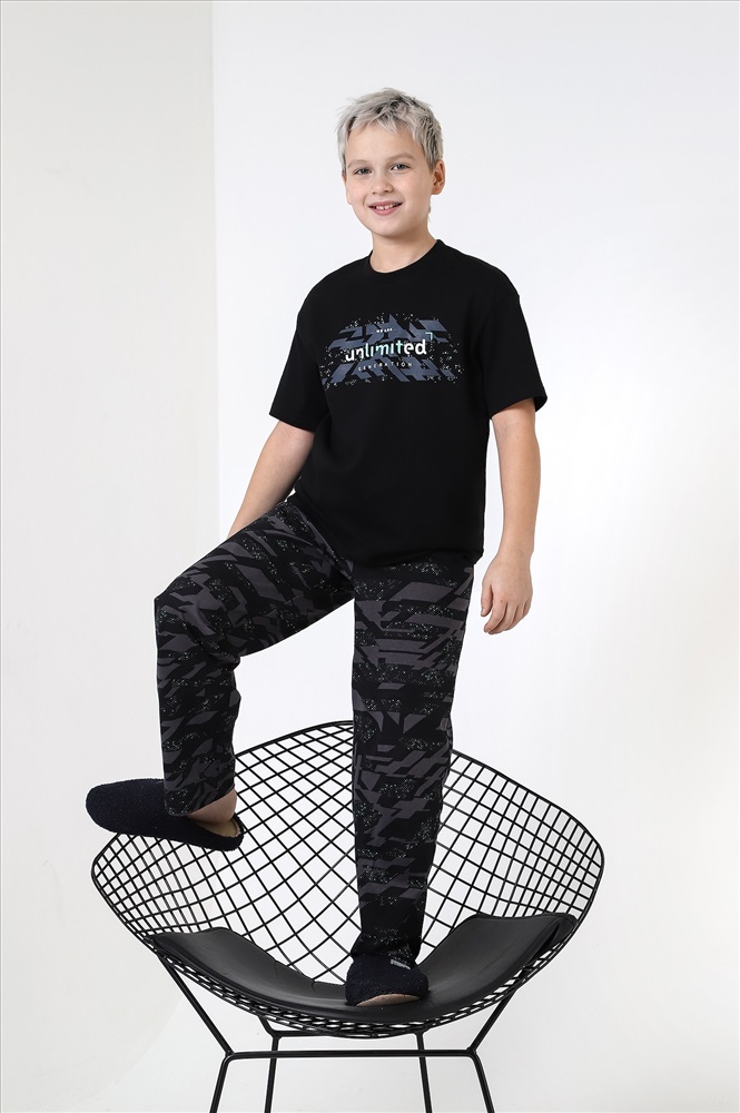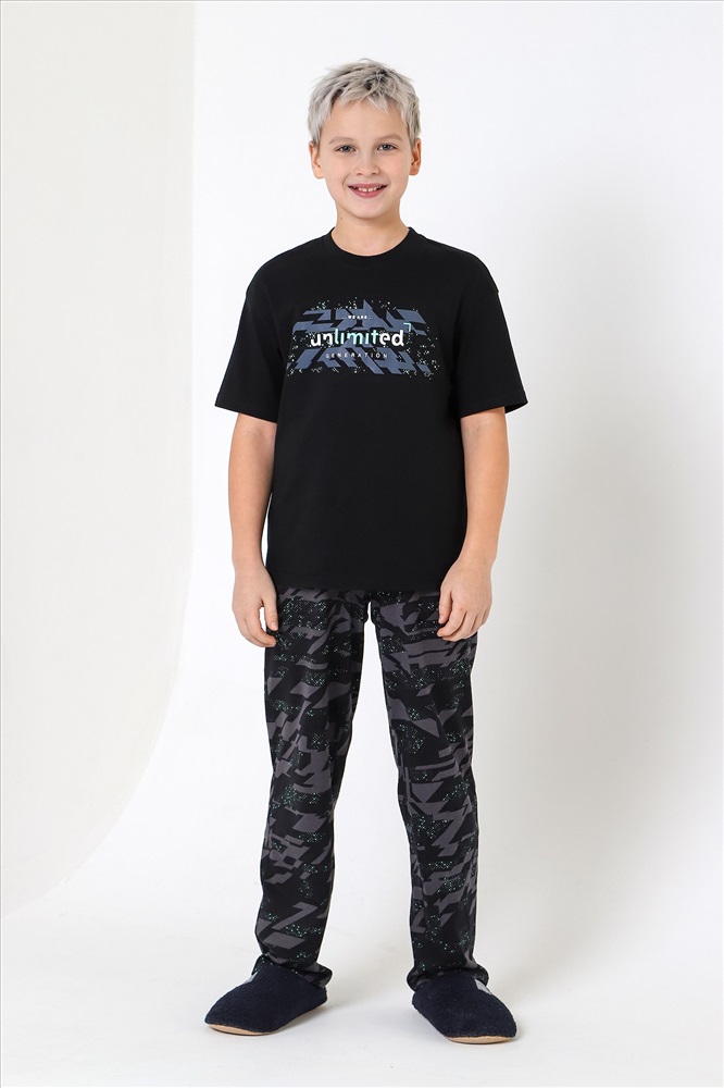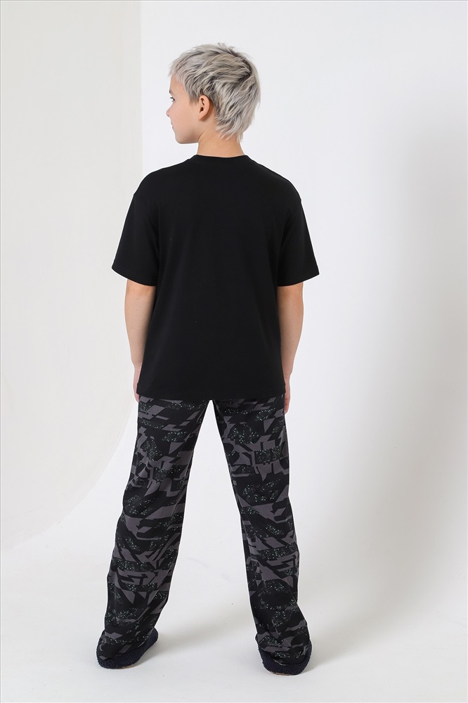 Костюм для мальчика, состоящий из футболки и брюк.Футболка - из гладкокрашеного полотна с принтом на детали переда, классического покроя, с короткими втачнвыми рукавами, удлиненными плечевыми швами и горловиной овальной формы, обработанной втачной планкой. По шву втачивания планки в горловину настрочена отделочная строчка. Нижние срезы рукавов и изделия обработаны швом вподгибку. Брюки - из полотна с набивным рисунком, длинные, на притачном поясе с эластичной тесьмой внутри и карманами в боковых швах с окантованными срезами Нижние срезы обработаны швом вподгибку.
