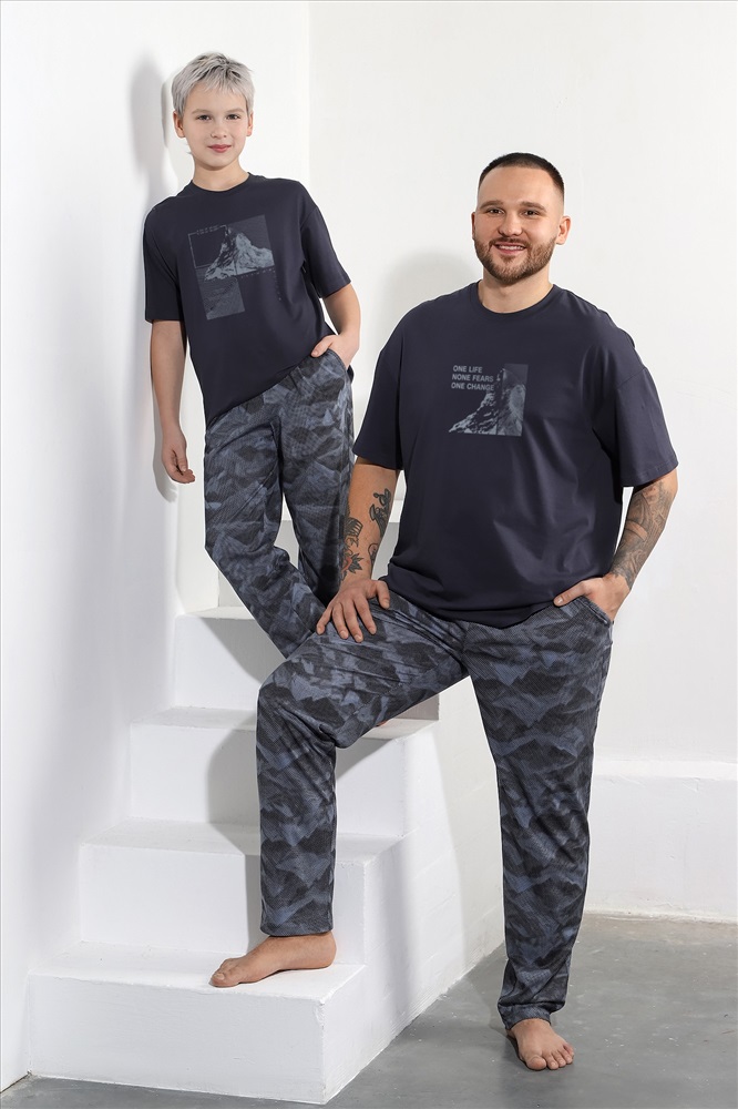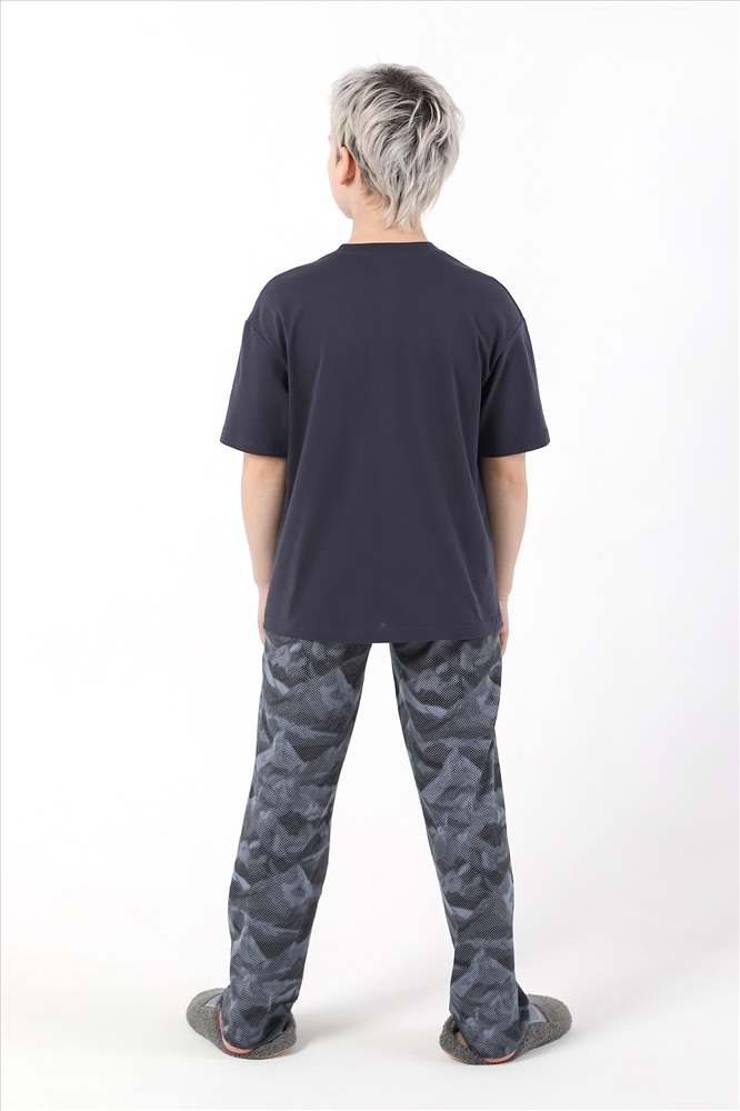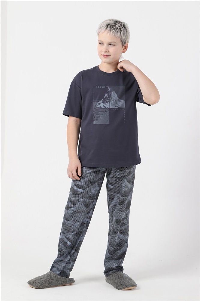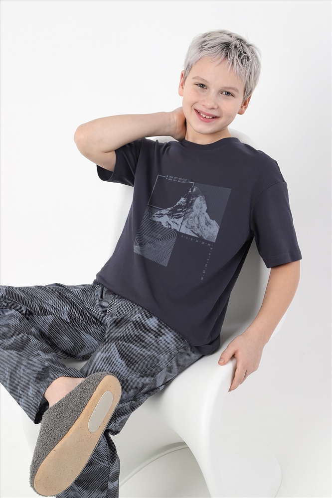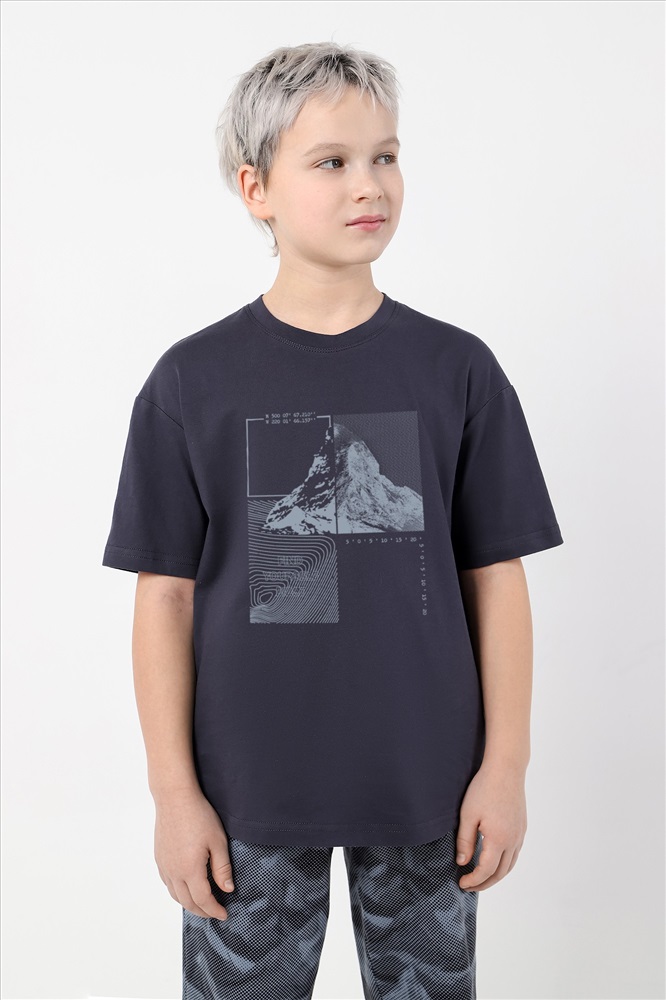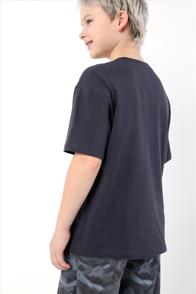 Костюм для мальчика из трикотажного полотна "кулирка" в комбинации двух видов , состоящий из футболки и брюк. Футболка - из гладкокрашеного полотна, свободного покроя, со спущенным плечом, короткими втачными рукавами, горловиной овальной формы, обработанной втачной планкой, и принтом в центре переда. По шву втачивания планки настрочена двойная отделочная строчка. Брюки - из полотна с набивным рисунком, на притачном поясе с эластичной тесьмой внутри, с карманами в боковых швах. Входы в карманы окантованы основным материалом.