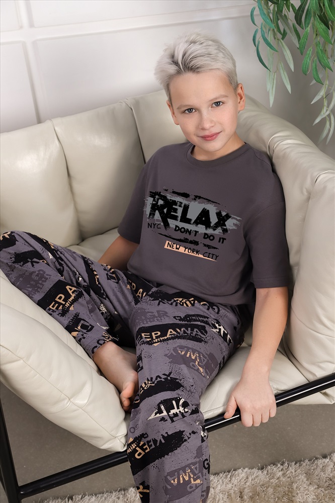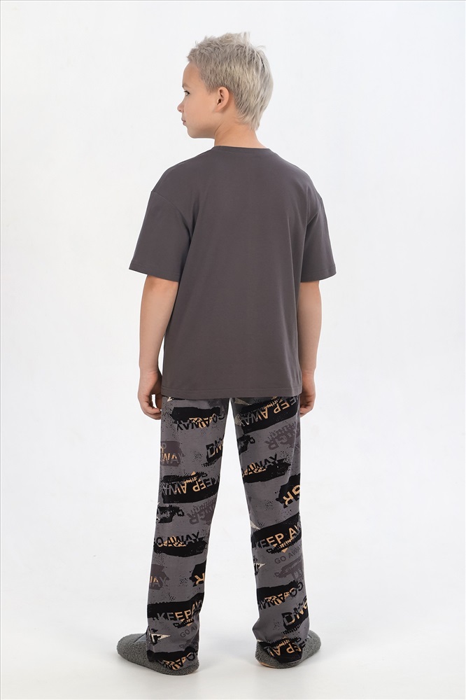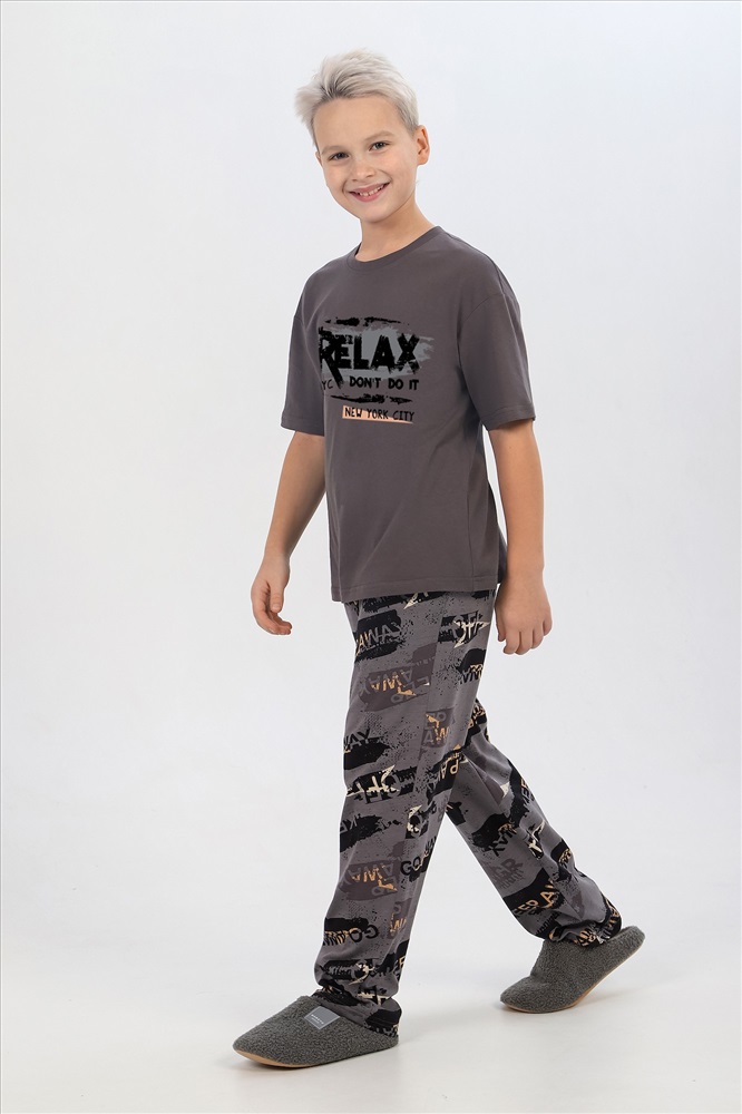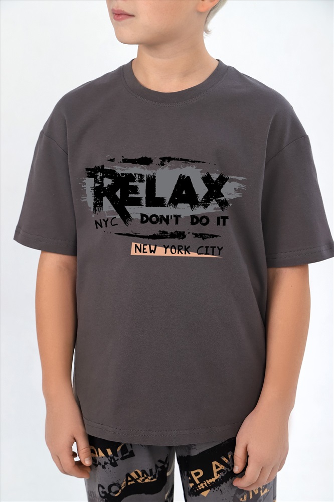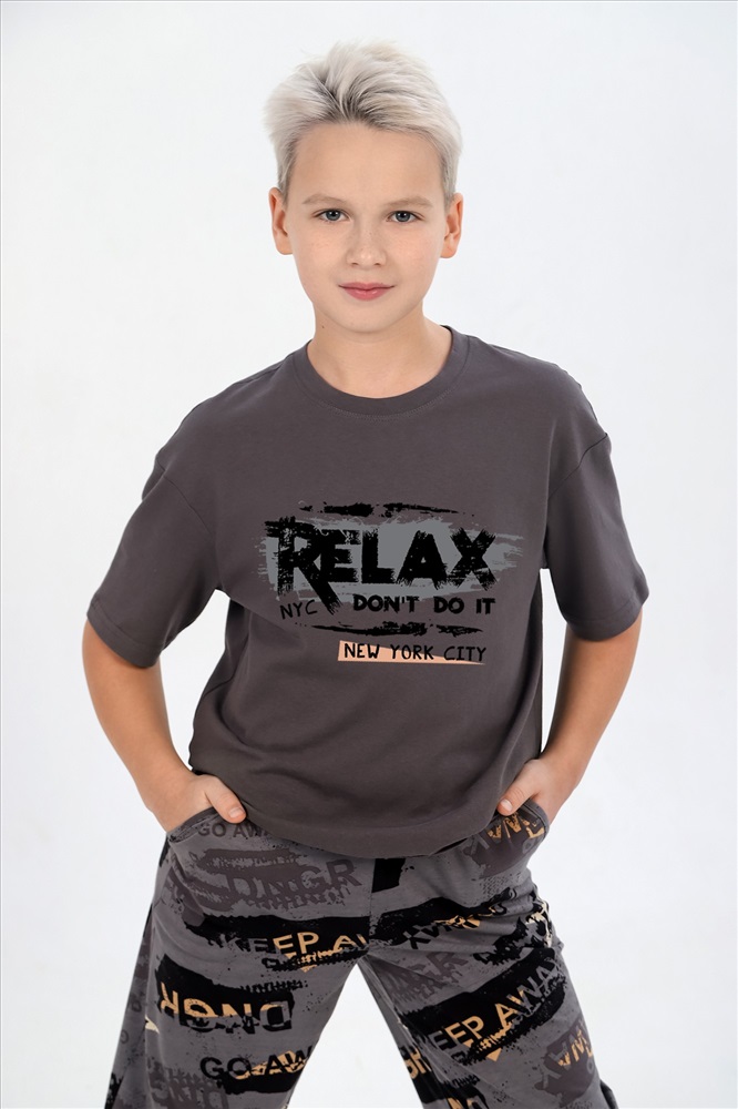 Костюм для мальчика ,состоящий из футболки и брюк. Футболка - из гладкокрашеного полотна "кулирка", классического покроя, с короткими втачными рукавами, горловиной овальной формы, обработанной втачной планкой, и принтом вцентре переда, выполненным в технике шелкографии. Брюки - из полотна с набивным рисунком, прямого силуэта, на притачном поясе с эластичнойтесьмой внутри и карманами в боковых швах, входы в которые окантованы основным материалом.