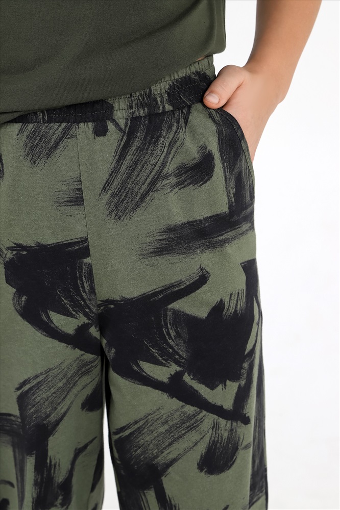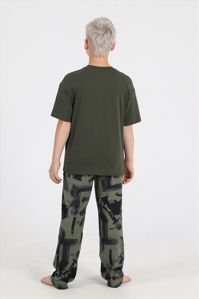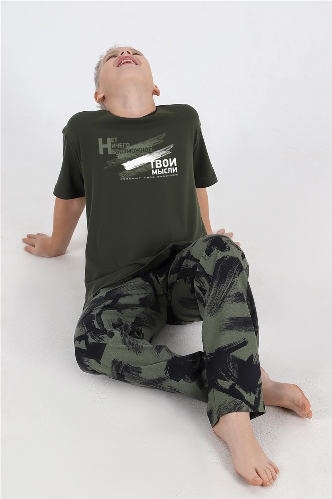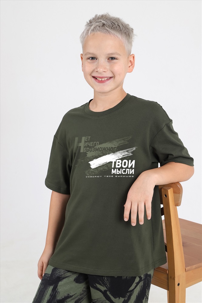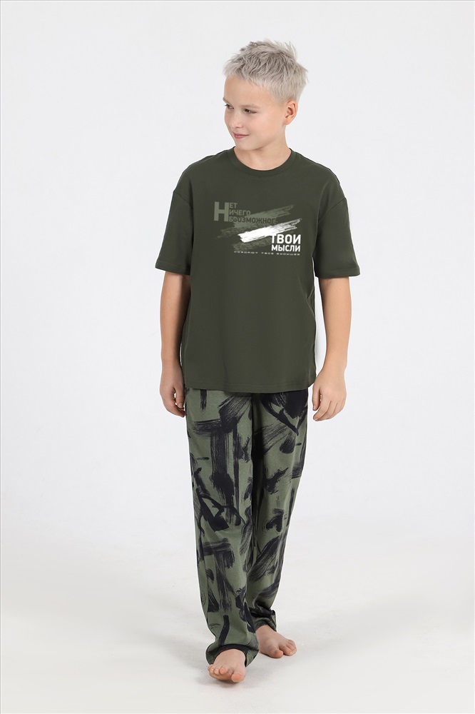 Костюм для мальчика, состоящий из футболки и брюк.Футболка - из гладкокрашеного полотна с принтом на детали переда, классического покроя, с короткими втачнвыми рукавами, удлиненными плечевыми швами и горловиной овальной формы, обработанной втачной планкой. По шву втачивания планки в горловину настрочена отделочная строчка. Нижние срезы рукавов и изделия обработаны швом вподгибку. Брюки - из полотна с набивным рисунком, длинные, на притачном поясе с эластичной тесьмой внутри и карманами в боковых швах с окантованными срезами Нижние срезы обработаны швом вподгибку.