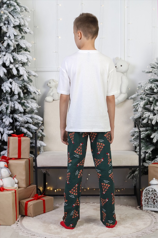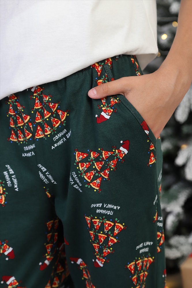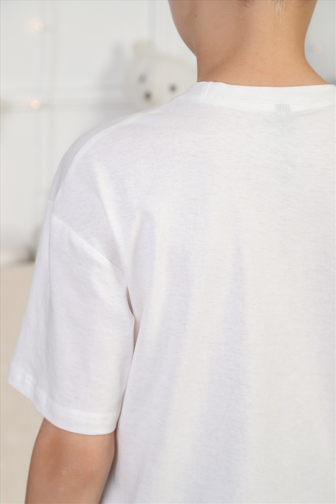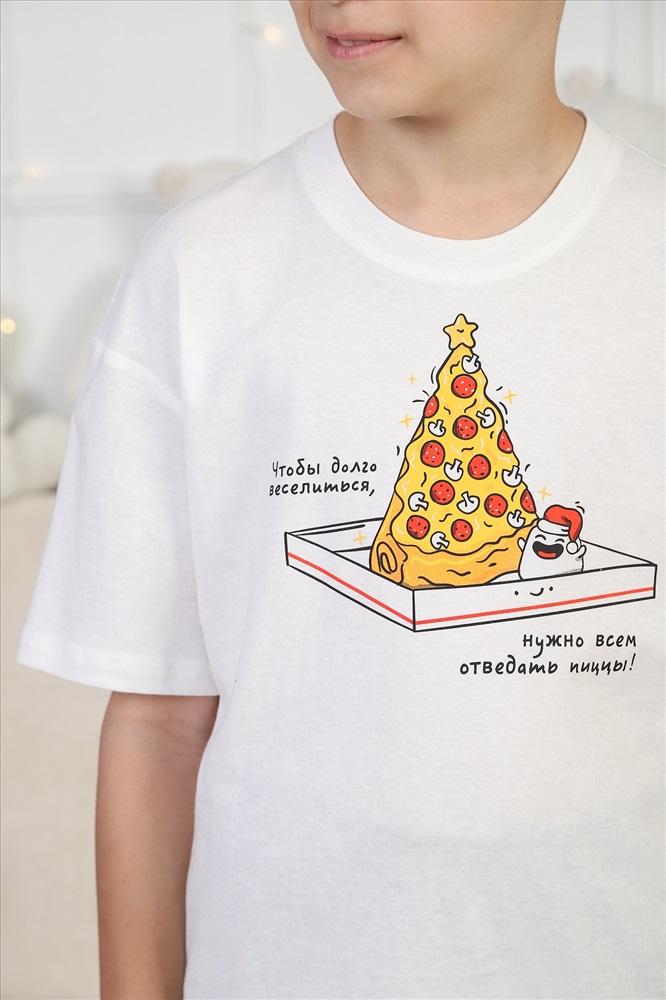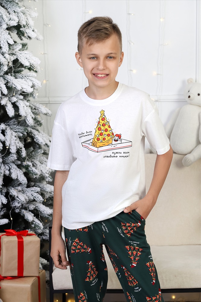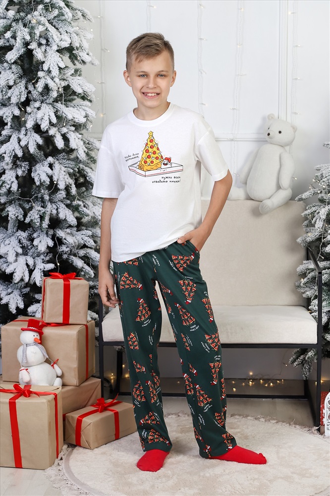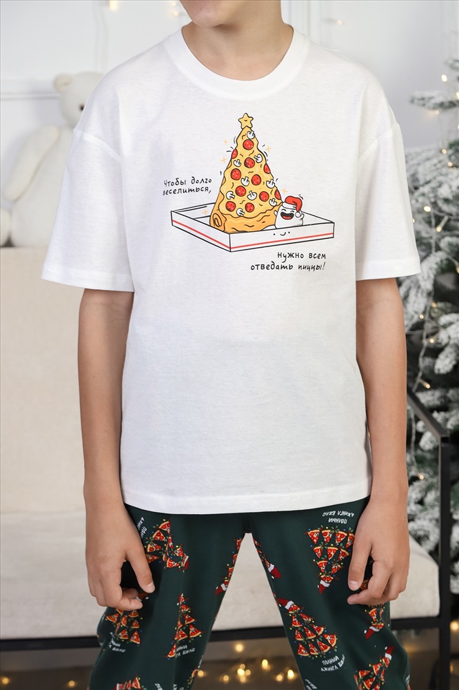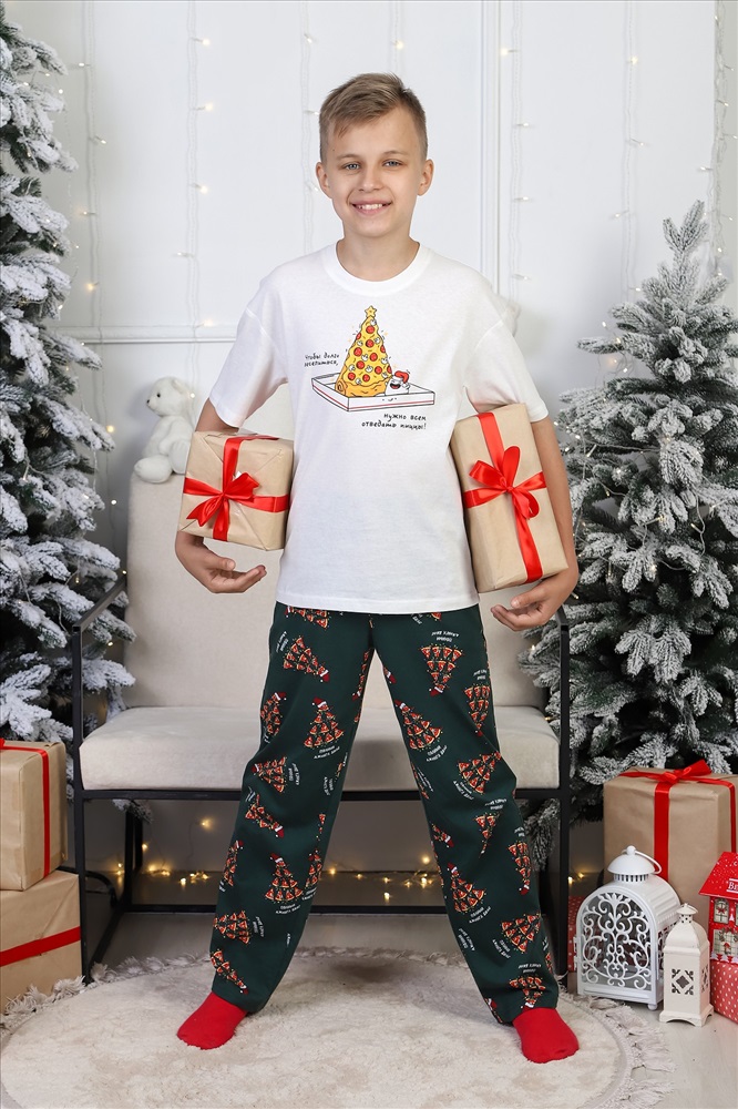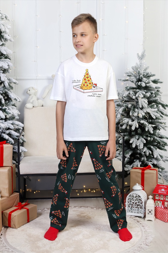 Костюм для мальчика. Футболка с принтом; модель свободная, со спущенной линией плеч. Брюки из полотна эксклюзивного дизайна, прямые, с боковыми карманами, на притачном поясе с отстроченной эластичной тесьмой.