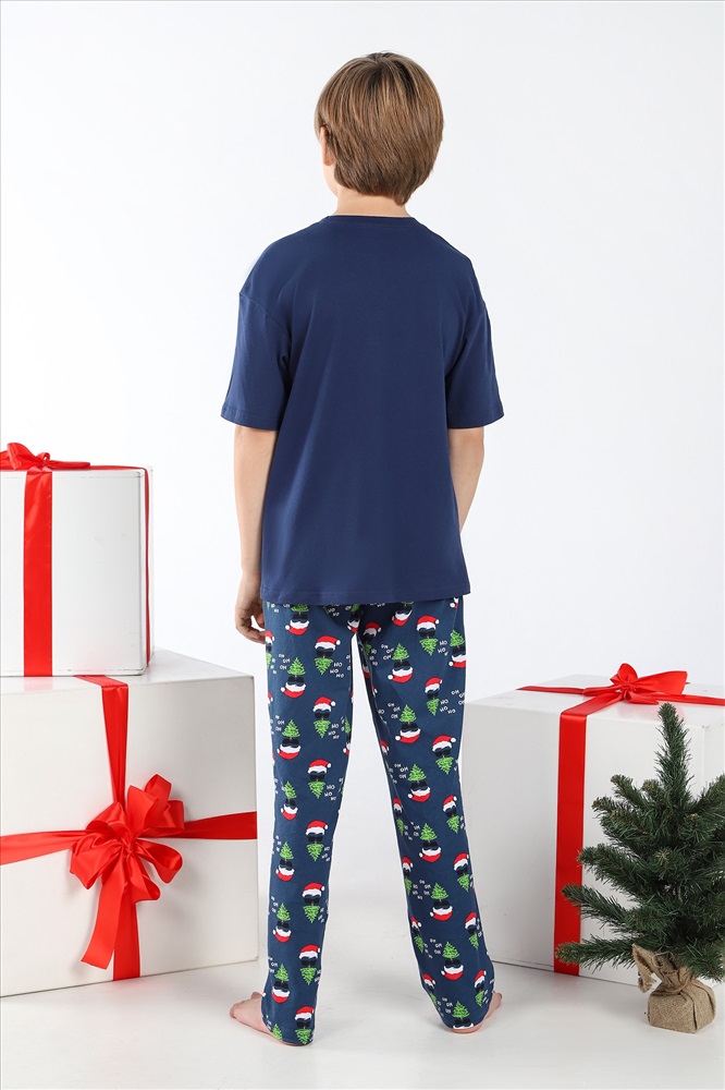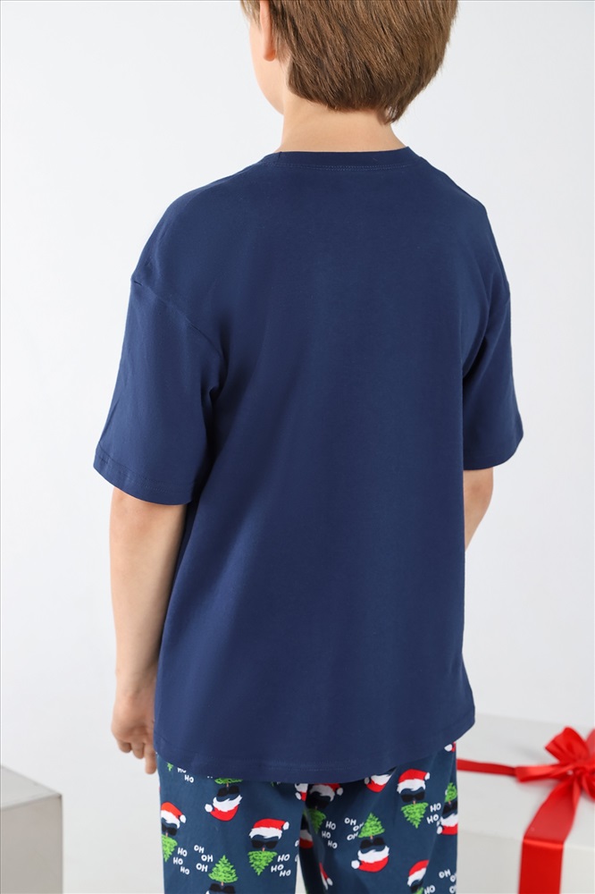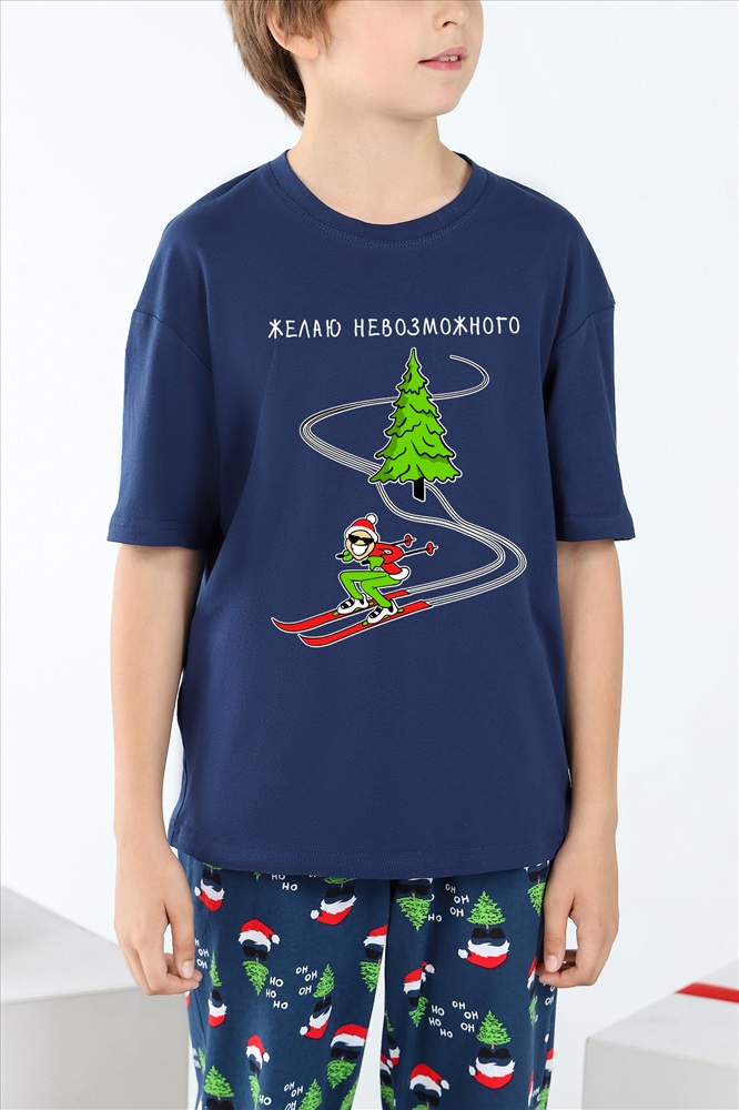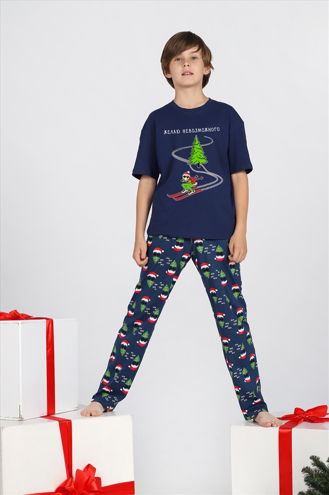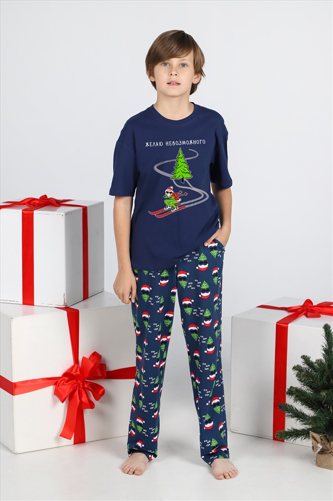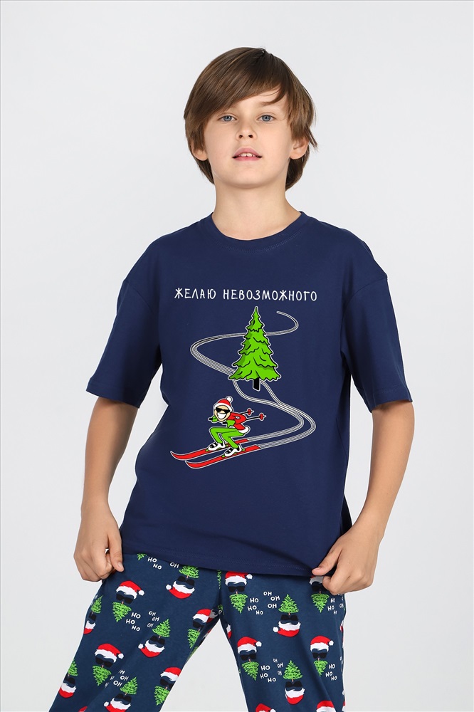Костюм для мальчика, состоящий из футболки и брюк.Футболка - из гладкокрашеного полотна с принтом на детали переда, классического покроя, с короткими втачнвыми рукавами, удлиненными плечевыми швами и горловиной овальной формы, обработанной втачной планкой. По шву втачивания планки в горловину настрочена отделочная строчка. Нижние срезы рукавов и изделия обработаны швом вподгибку. Брюки - из полотна с набивным рисунком, длинные, на притачном поясе с эластичной тесьмой внутри и карманами в боковых швах. Нижние срезы обработаны швом вподгибку.