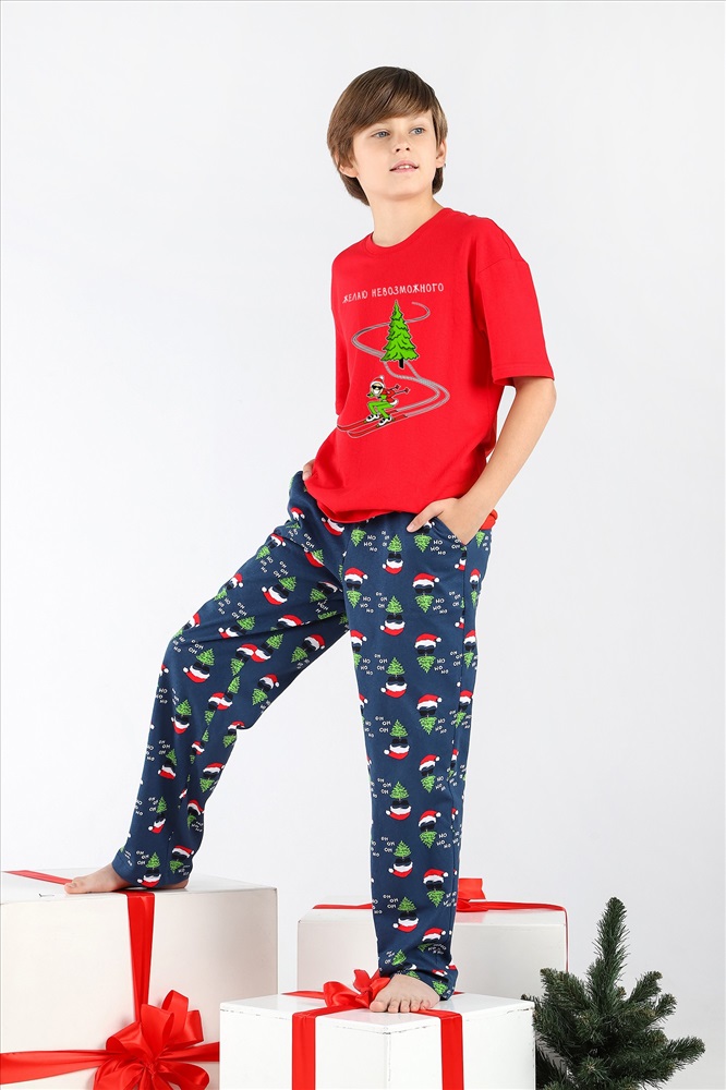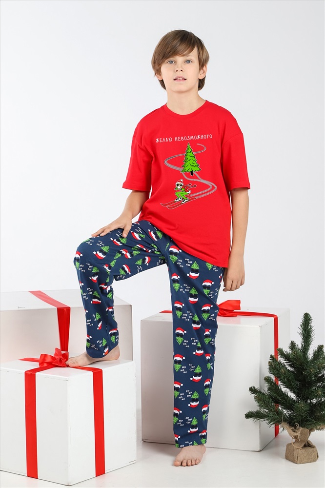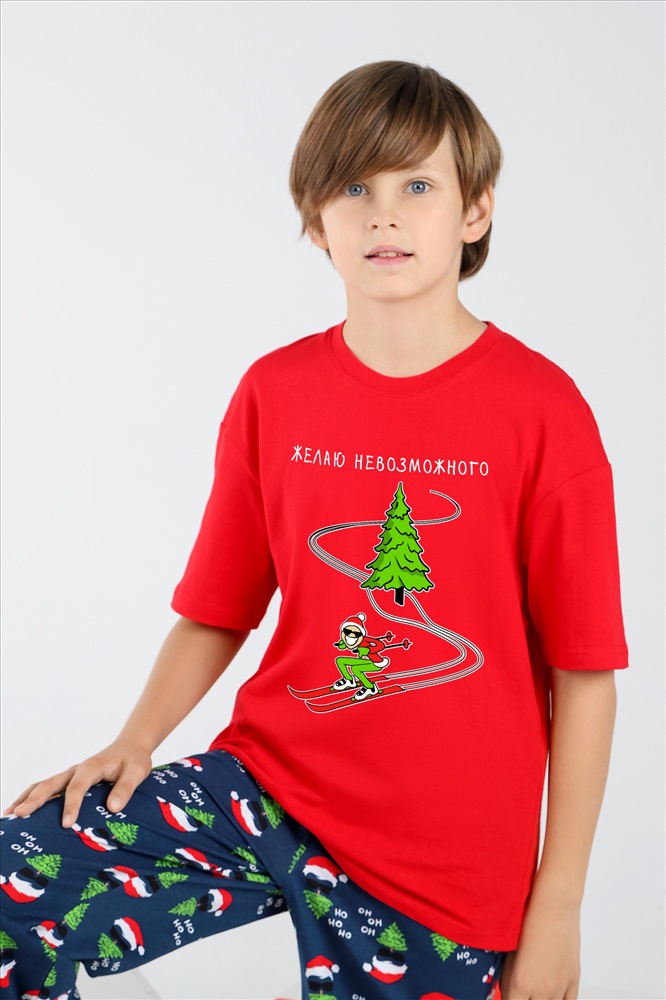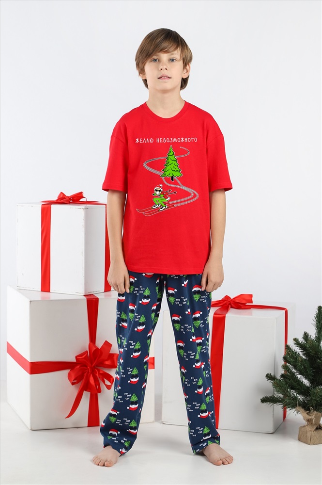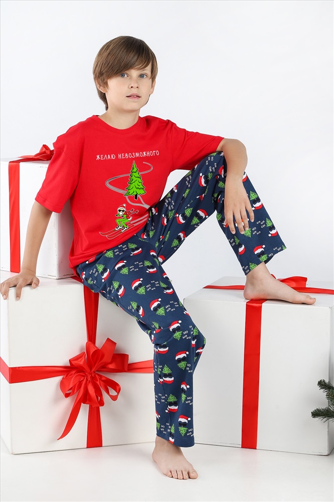 Костюм для мальчика, состоящий из футболки и брюк.Футболка - из гладкокрашеного полотна с принтом на детали переда, классического покроя, с короткими втачнвыми рукавами, удлиненными плечевыми швами и горловиной овальной формы, обработанной втачной планкой. По шву втачивания планки в горловину настрочена отделочная строчка. Нижние срезы рукавов и изделия обработаны швом вподгибку. Брюки - из полотна с набивным рисунком, длинные, на притачном поясе с эластичной тесьмой внутри и карманами в боковых швах. Нижние срезы обработаны швом вподгибку.