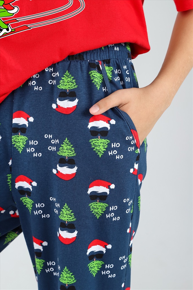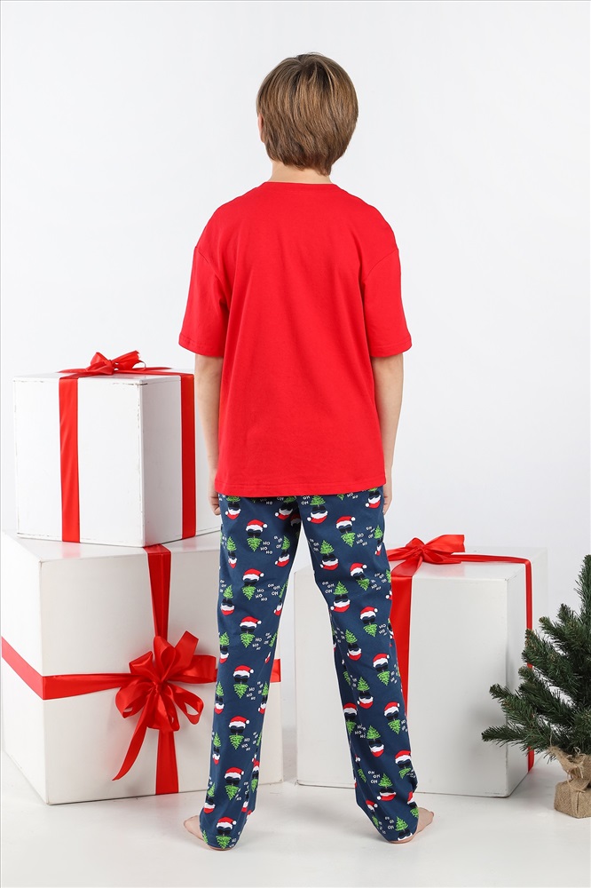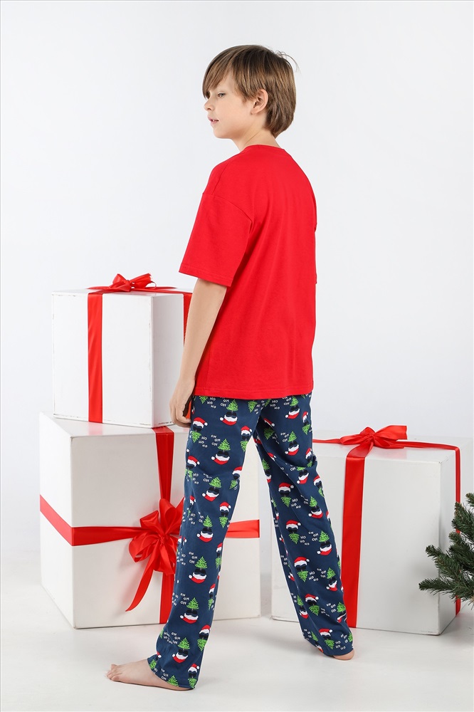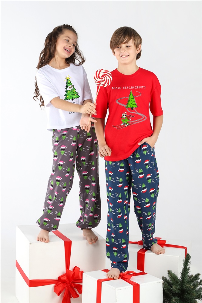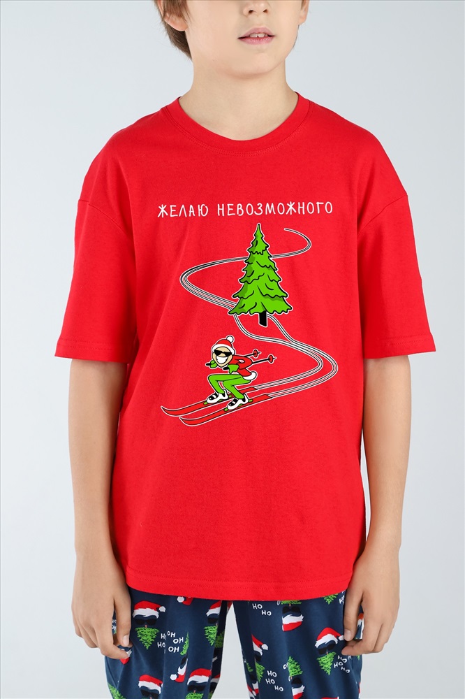 Костюм для мальчика, состоящий из футболки и брюк.Футболка - из гладкокрашеного полотна с принтом на детали переда, классического покроя, с короткими втачнвыми рукавами, удлиненными плечевыми швами и горловиной овальной формы, обработанной втачной планкой. По шву втачивания планки в горловину настрочена отделочная строчка. Нижние срезы рукавов и изделия обработаны швом вподгибку. Брюки - из полотна с набивным рисунком, длинные, на притачном поясе с эластичной тесьмой внутри и карманами в боковых швах. Нижние срезы обработаны швом вподгибку.