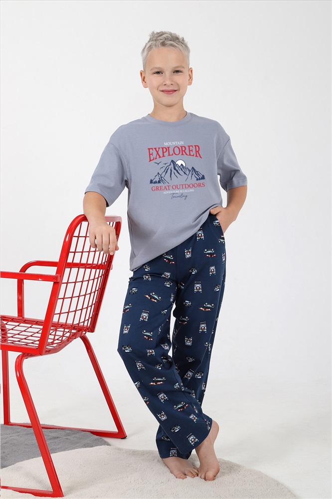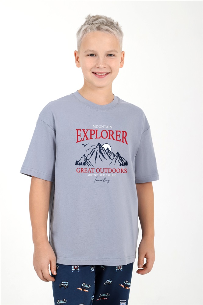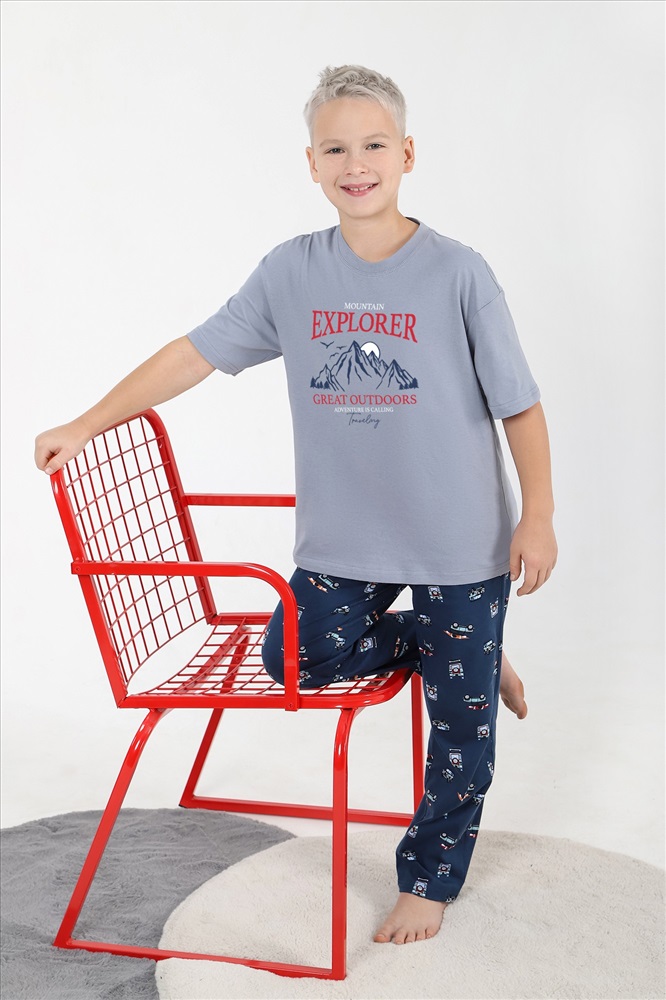 Костюм для мальчика ,состоящий из футболки и брюк. Футболка - из гладкокрашеного полотна "кулирка", классического покроя, с короткими втачными рукавами, горловиной овальной формы, обработанной втачной планкой, и принтом вцентре переда, выполненным в технике шелкографии. Брюки - из полотна с набивным рисунком, прямого силуэта, на притачном поясе с эластичнойтесьмой внутри и карманами в боковых швах, входы в которые окантованы основным материалом.
