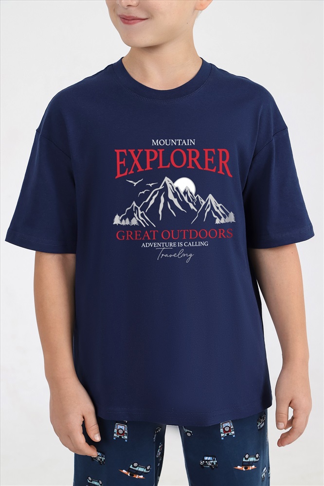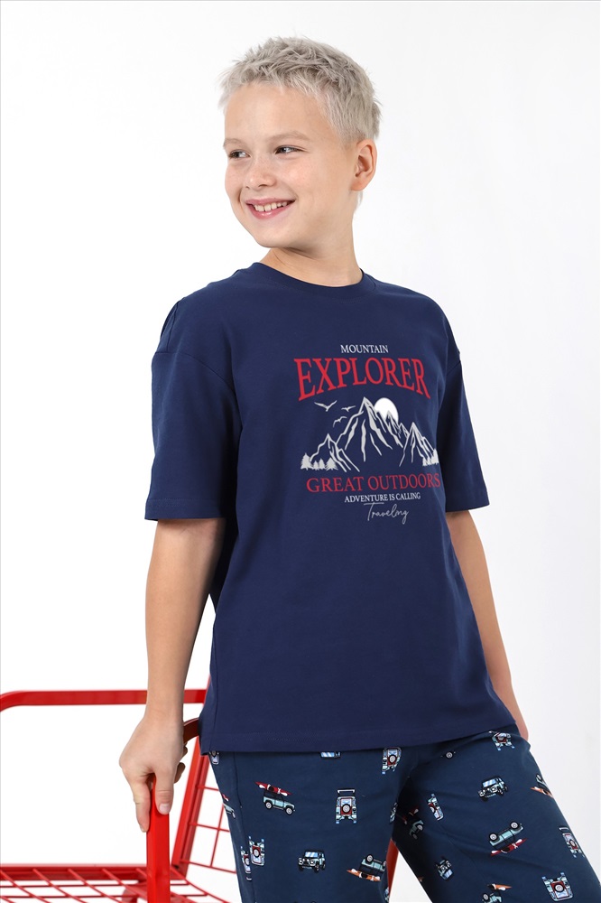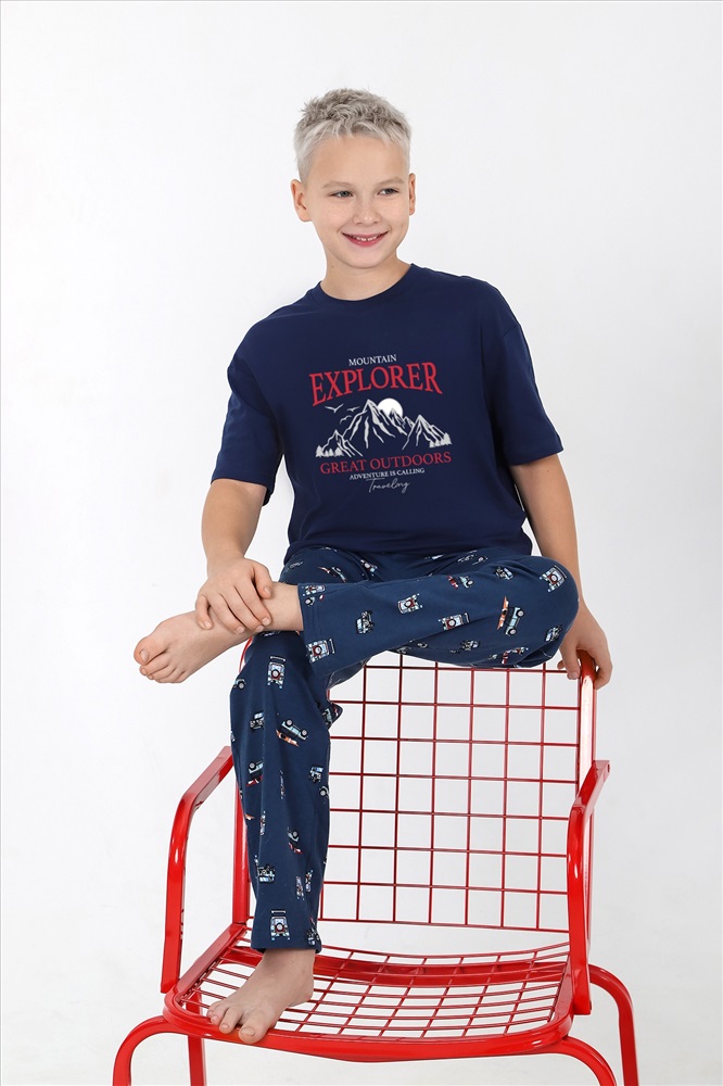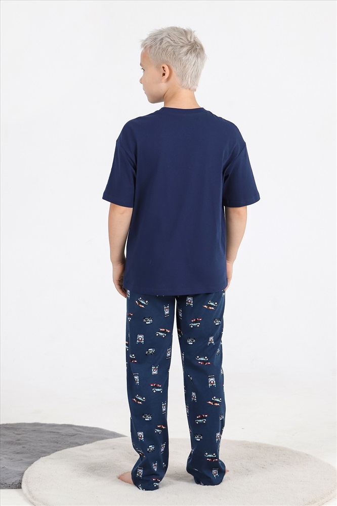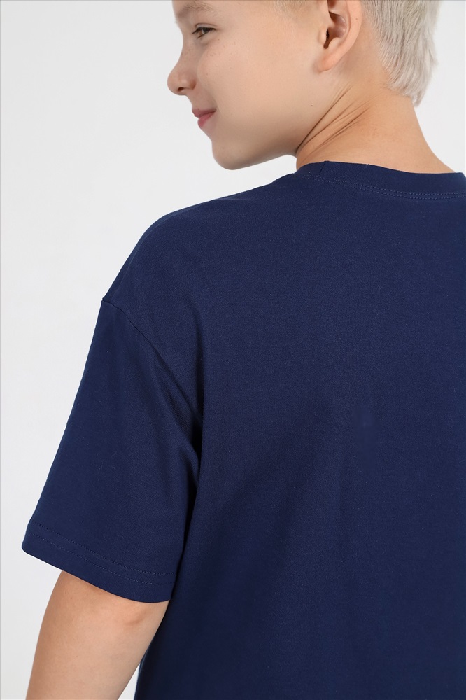 Костюм для мальчика ,состоящий из футболки и брюк. Футболка - из гладкокрашеного полотна "кулирка", классического покроя, с короткими втачными рукавами, горловиной овальной формы, обработанной втачной планкой, и принтом вцентре переда, выполненным в технике шелкографии. Брюки - из полотна с набивным рисунком, прямого силуэта, на притачном поясе с эластичнойтесьмой внутри и карманами в боковых швах, входы в которые окантованы основным материалом.