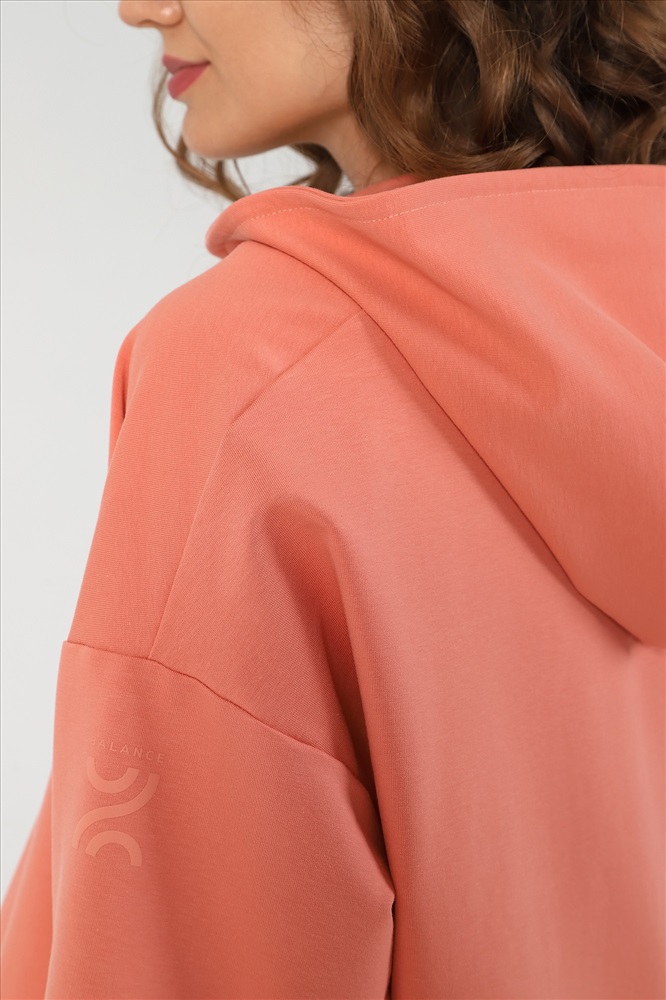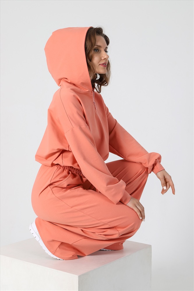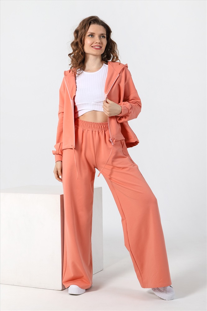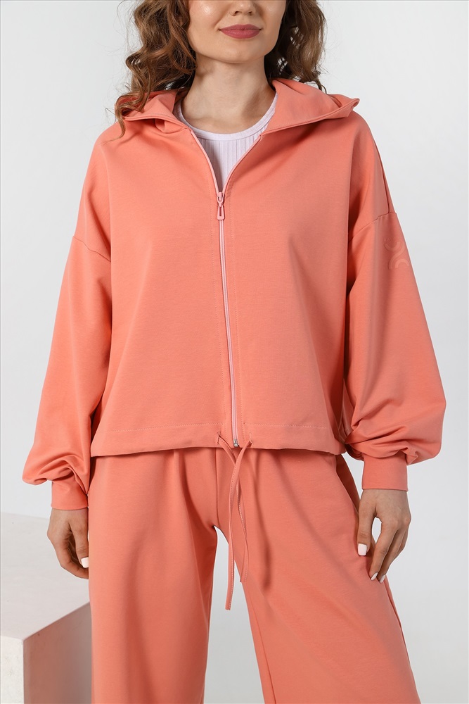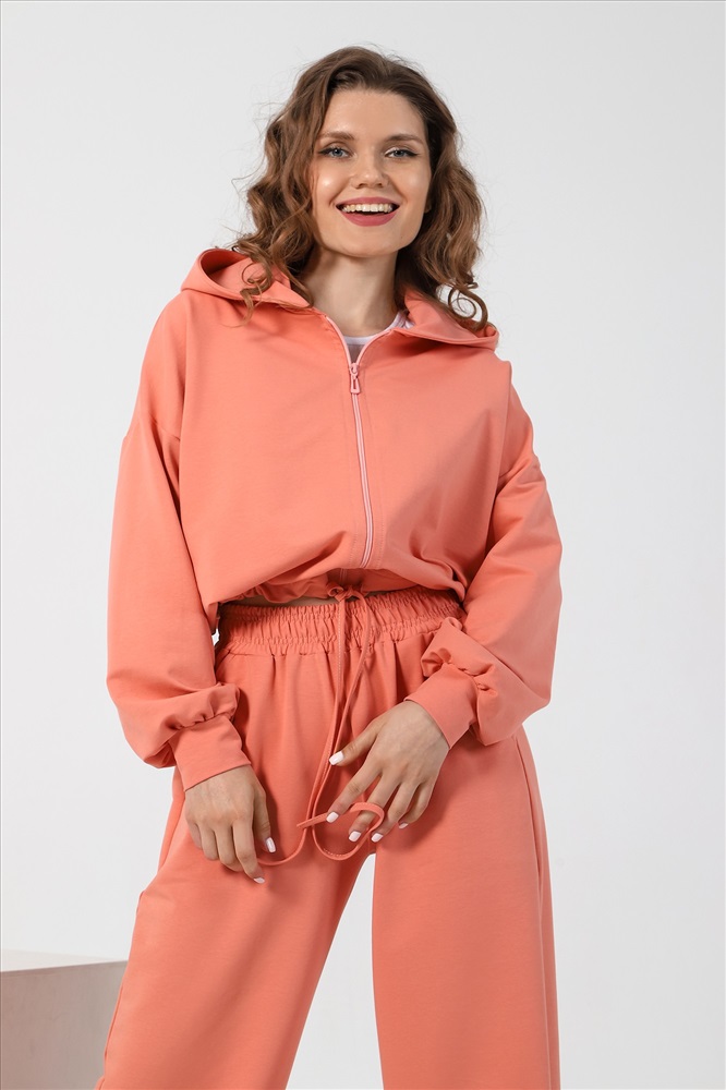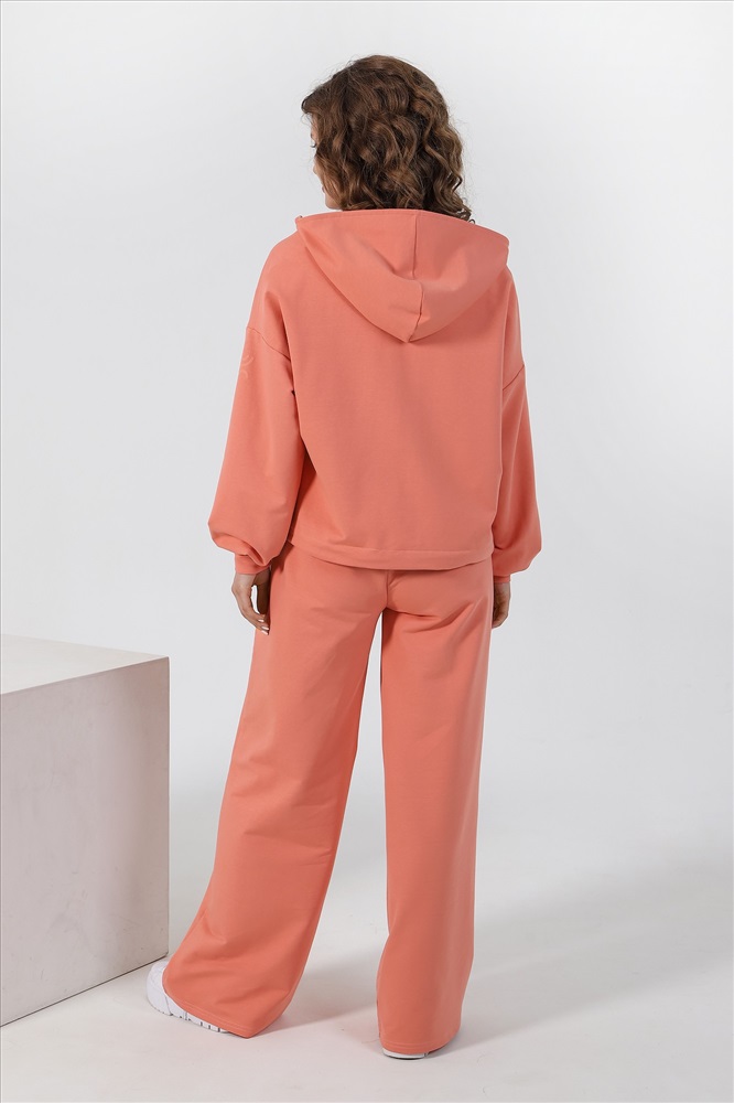 Костюм молодежный из гладкокрашенного трикотажного полотна «футер двунитка», состоящий из кофты и брюк. Куртка - свободного силуэта, с длинными втачными рукавами, с притачными манжетами, капюшоном и центральной бортовой застежкой на тесьму «молния». На рукавах по шву притачивания манжет выполнена сборка, низ изделия обработан в подгибку с вложением шнура, продернутым через две обметанные петли, на полочке принт, выполненный в технике «шелкографии». Брюки – свободного покроя расширенные книзу, на притачном поясе с эластичной тесьмой внутри и карманами в боковых швах.