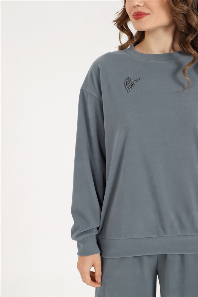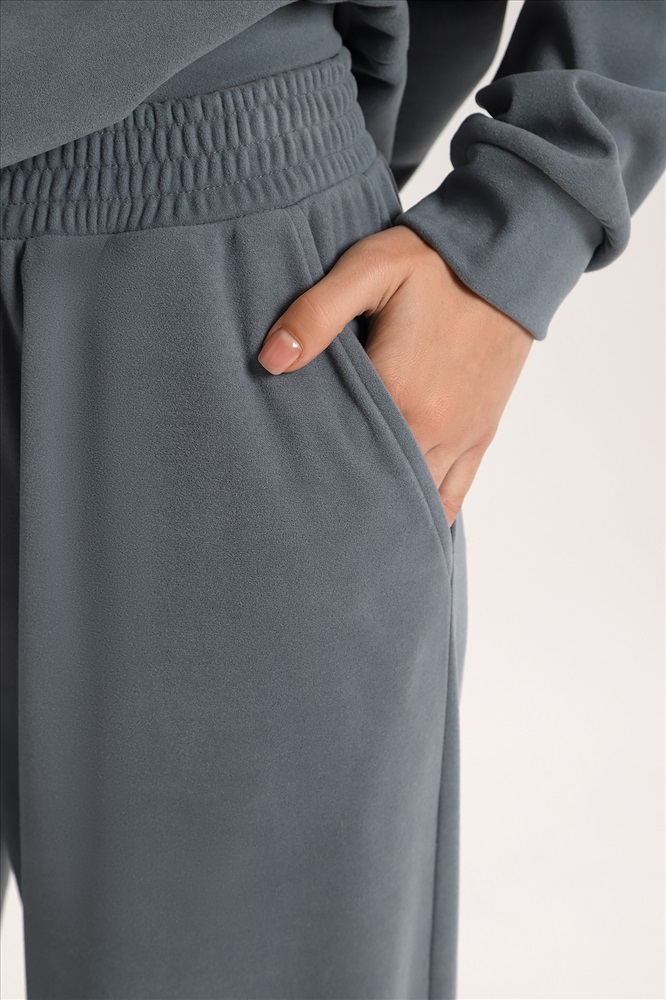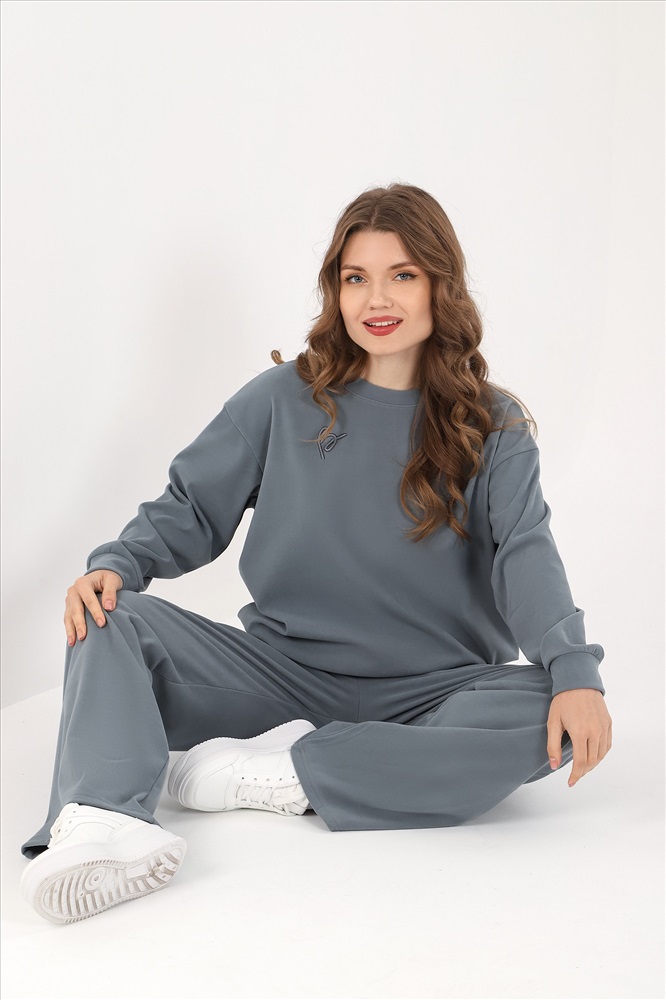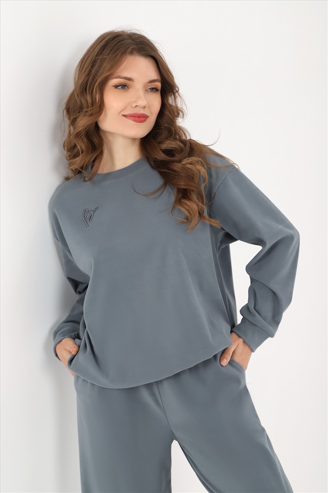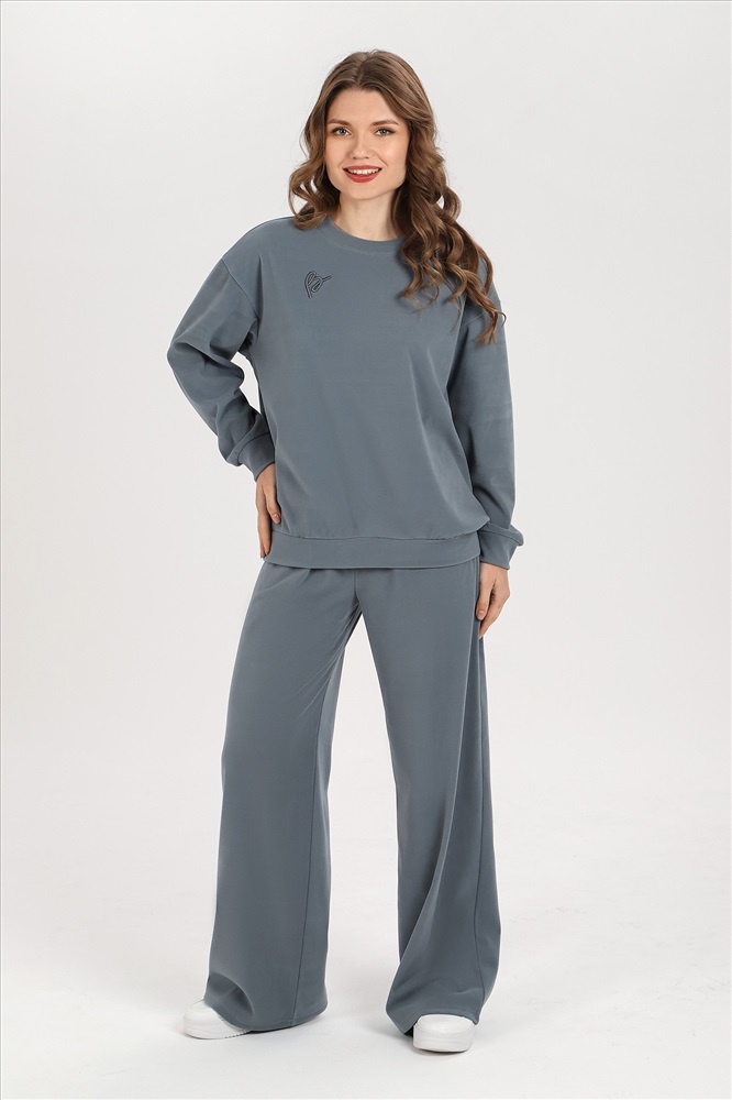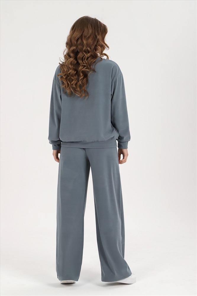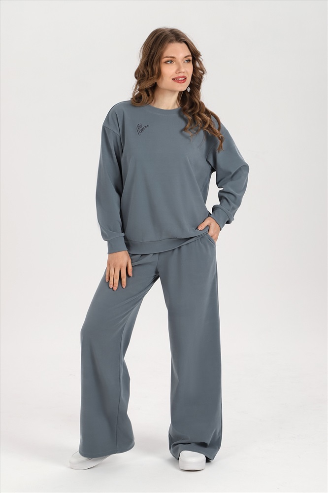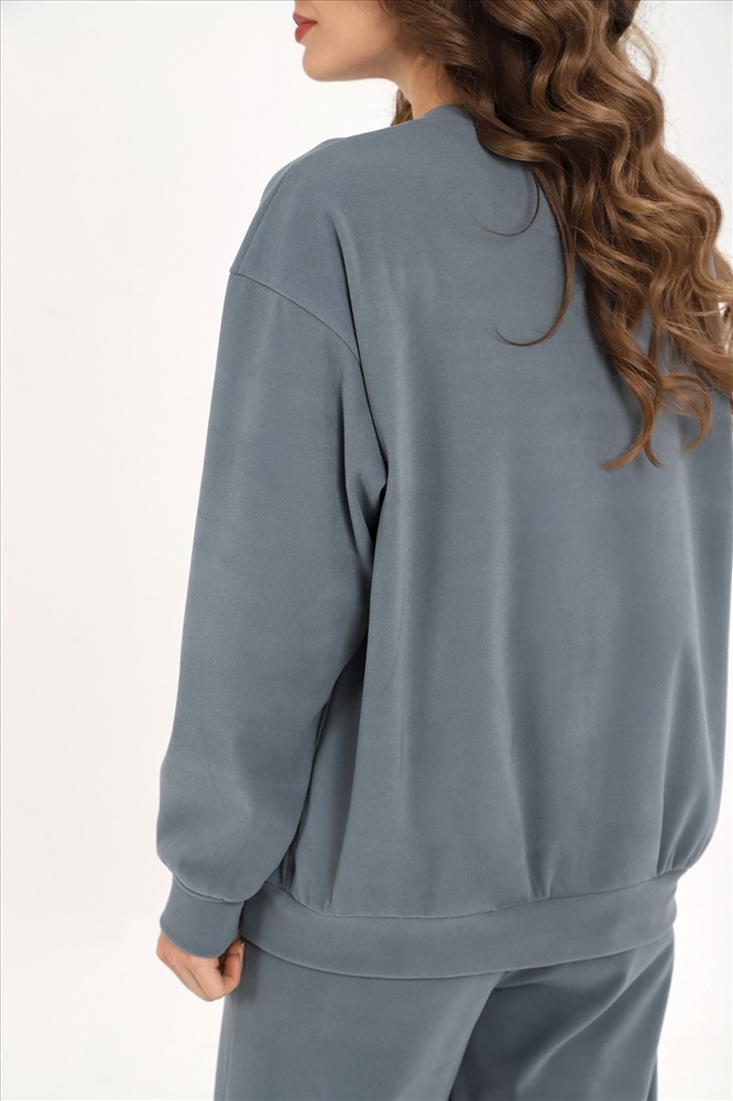 Костюм молодежный из гладкокрашеного трикотажного полотна «флис-сайкл», состоящий из джемпера и брюк. Джемпер – прямого силуэта, с длинными втачными рукавами, горловиной овальной формы, обработанной втачной планкой, притачным поясом понизу и принтом на полочке, выполненным в технике «шелкографии». Рукава – с притачными манжетами.Брюки – длинные, свободные, на притачном поясе с эластичной тесьмой внутри, карманами в боковых швах.
