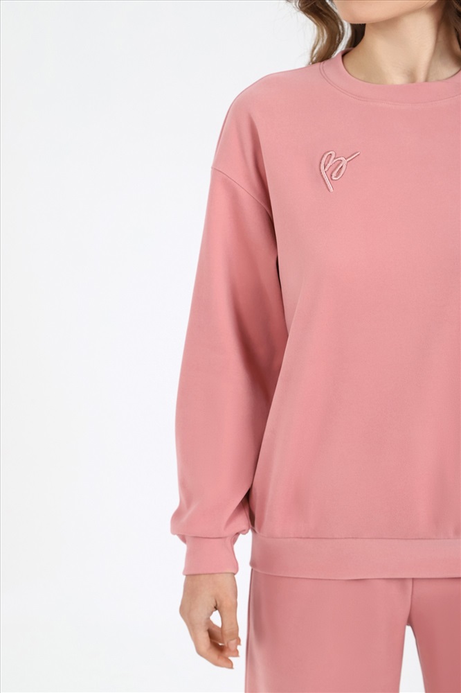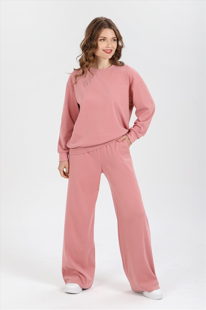 Костюм молодежный из гладкокрашеного трикотажного полотна «флис-сайкл», состоящий из джемпера и брюк. Джемпер – прямого силуэта, с длинными втачными рукавами, горловиной овальной формы, обработанной втачной планкой, притачным поясом понизу и принтом на полочке, выполненным в технике «шелкографии». Рукава – с притачными манжетами.Брюки – длинные, свободные, на притачном поясе с эластичной тесьмой внутри, карманами в боковых швах.