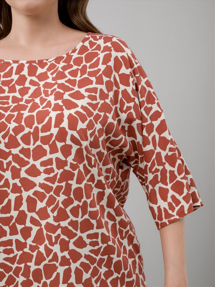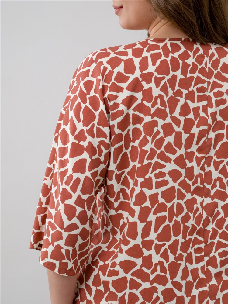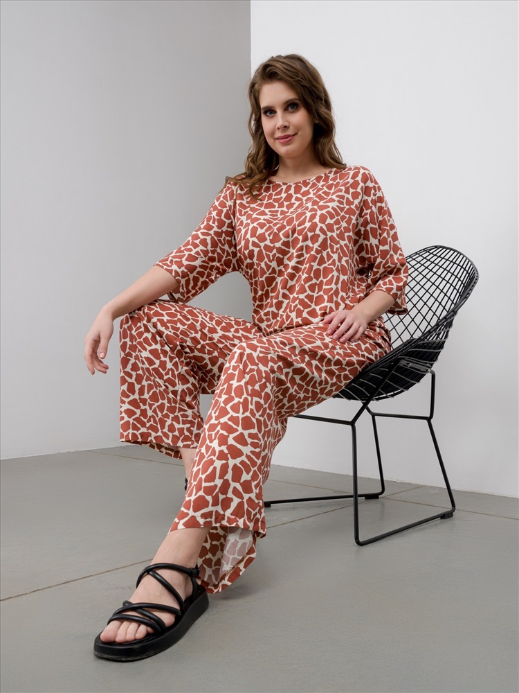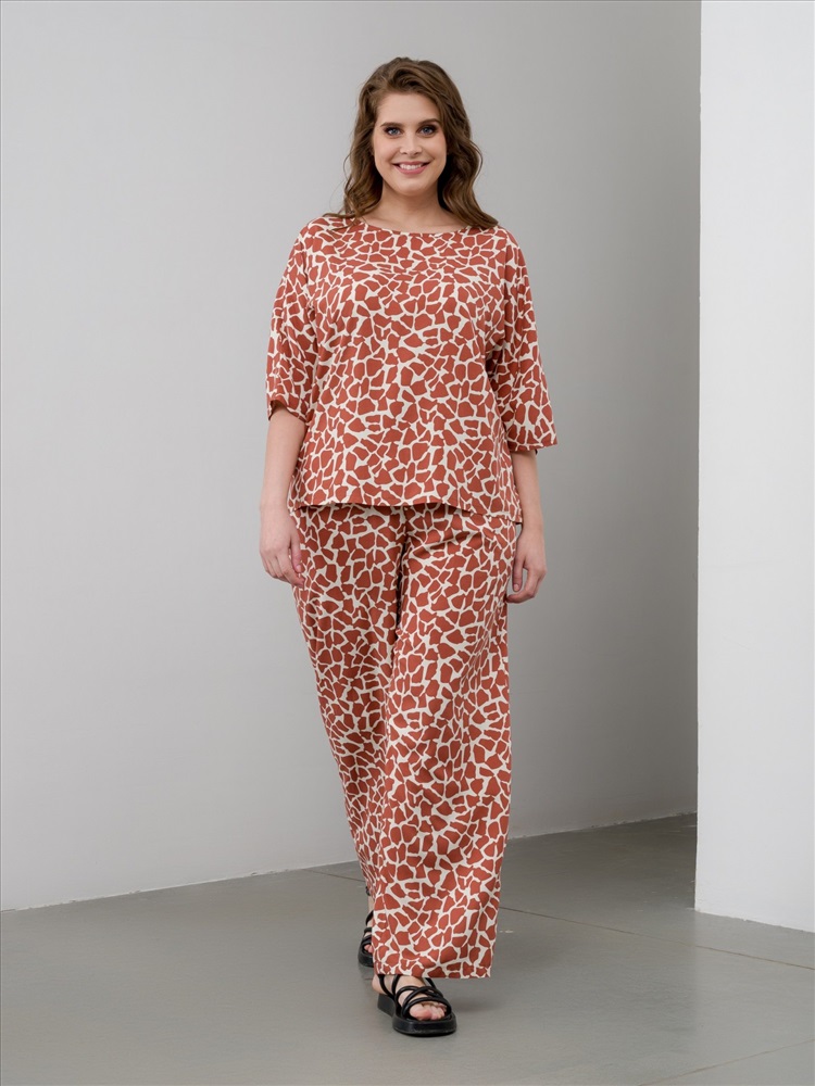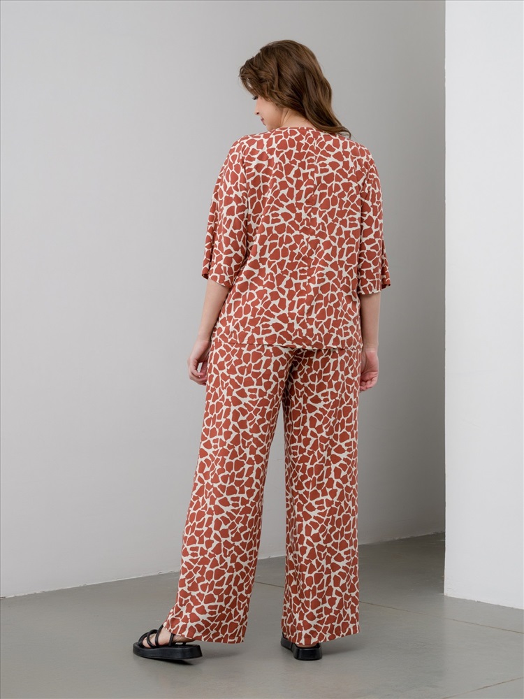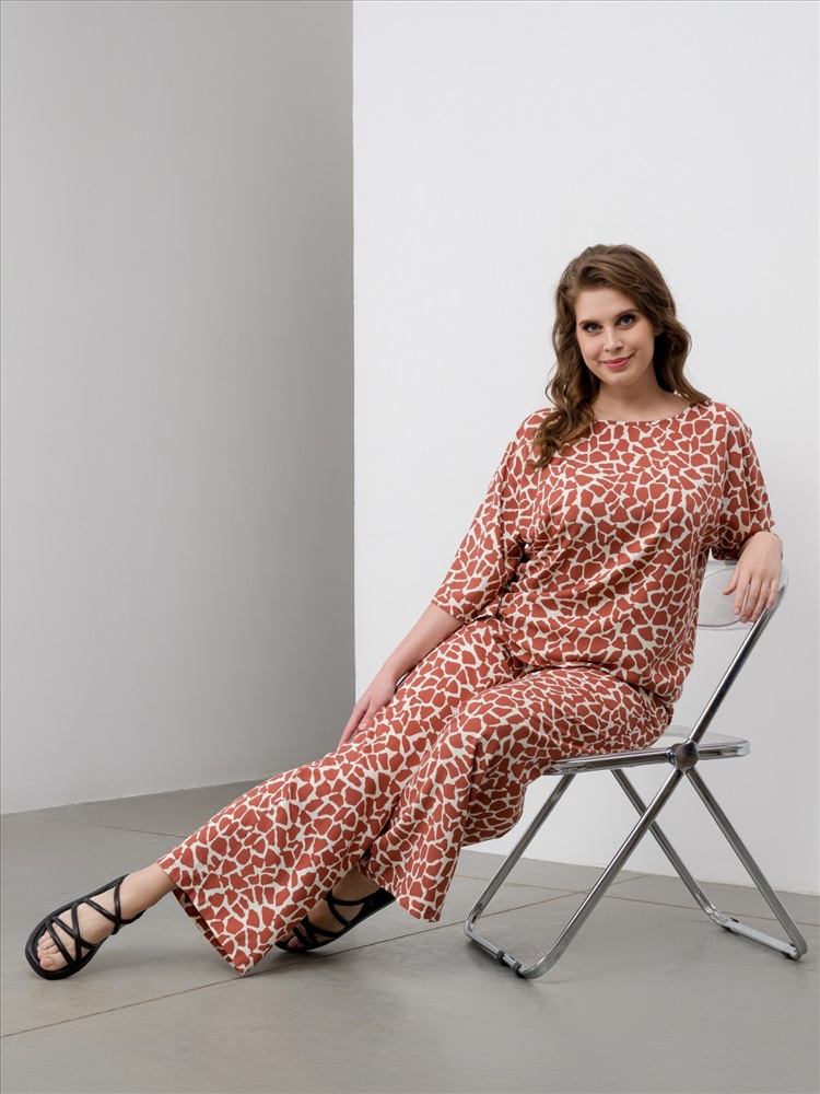 Костюм женский из тканого полотна «штапель» с набивным рисунком, Блуза - свободного кроя, горловиной овальной формы, обработанной окантовкой из основного материала, с цельнокроеными рукавами длиной до локтя.Брюки - длинные, свободные, с карманами в боковых швах, на притачном поясе с эластичной тесьмой внутри.