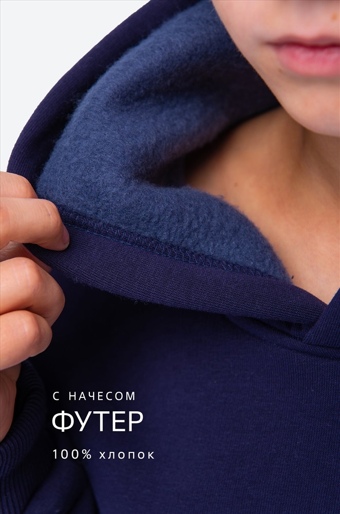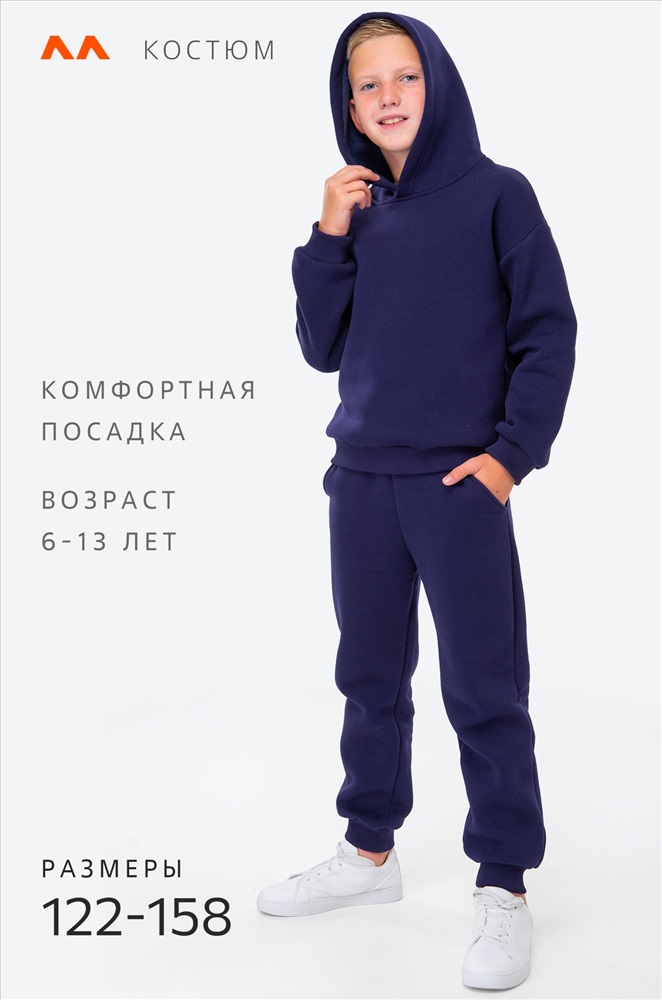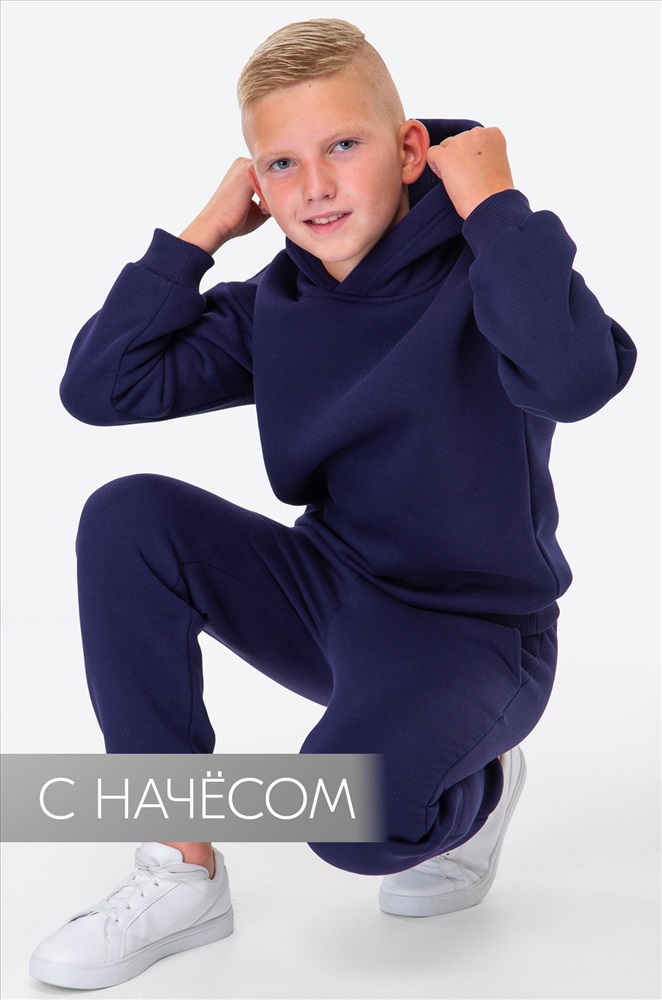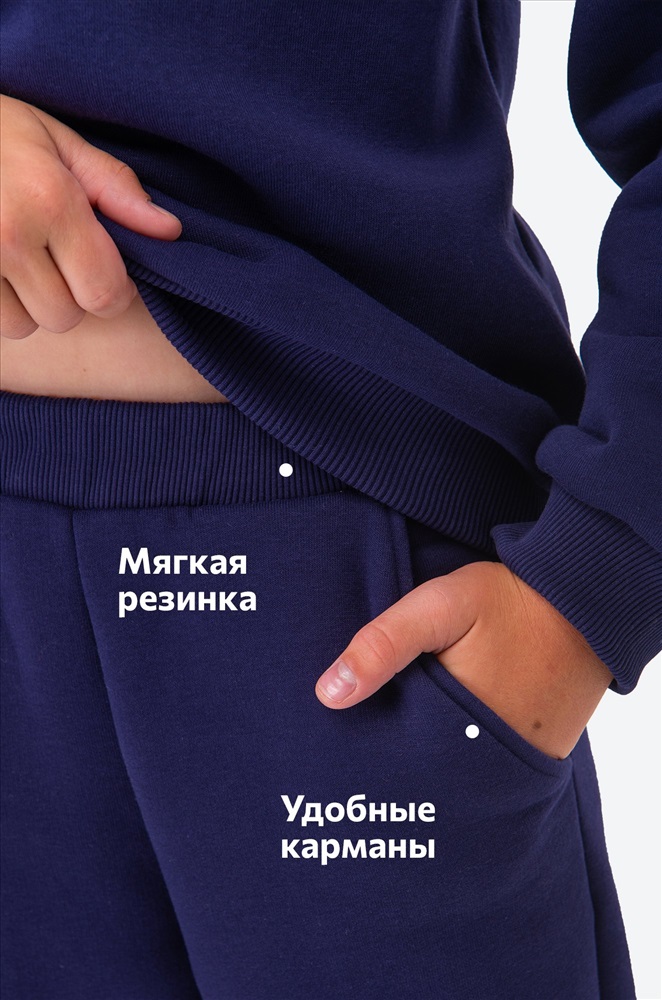 Синий спортивный костюм для детей выполнен из плотного трикотажа футер трехнитка. Начес отлично сохраняет тепло и не пропускает холодный воздух. Костюм хорошо тянется и держит форму даже после частых стирок.