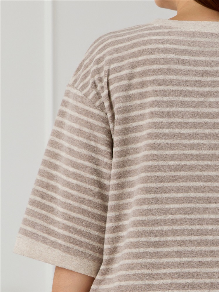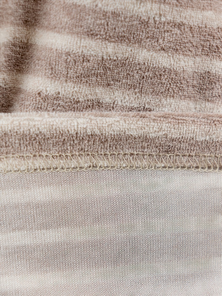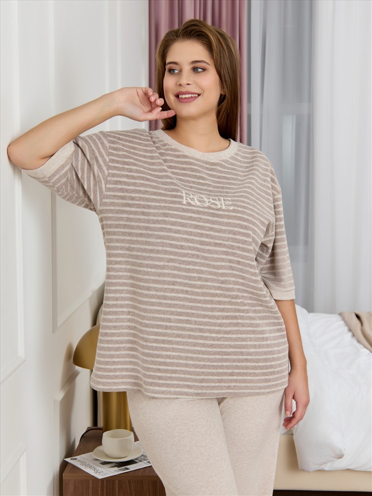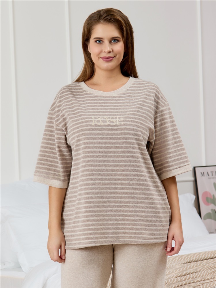 Ткань: Махра Махра - это хлопчатобумажная ткань, поверхность которой с одной стороны покрыта ворсом из петель нитей. Это очень мягкая ткань, легко впитывает влагу в больших количествах. Махра - натуральный материал, он гипоаллергенный и воздухопроницаемый. Ворс может быть с одной стороны или с двух (односторонняя или двусторонняя махра). Так оставаться в виде петель, либо стриженым. Стричь ворс могут сплошным полотном, или художественно выстригая узоры. Все это разновидности махровой ткани. Костюм женский из трикотажного полотна «махра» в комбинации двух видов в единой цветовой гамме, состоящий из футболки и брюк. Футболка – из полотна в « полоску», с втачными короткими рукавами, горловиной овальной формы, обработанной втачной планкой и вышивкой по центру переда. Планка горловины и манжеты на рукавах выполнены из контрастного полотна «махра меланж».Брюки – из полотна «махра меланж» классического покроя, с карманами в боковых швах, на притачном поясе с эластичной тесьмой внутри.