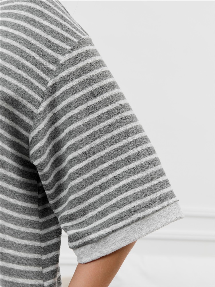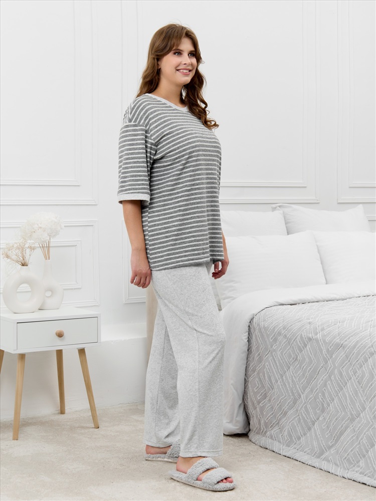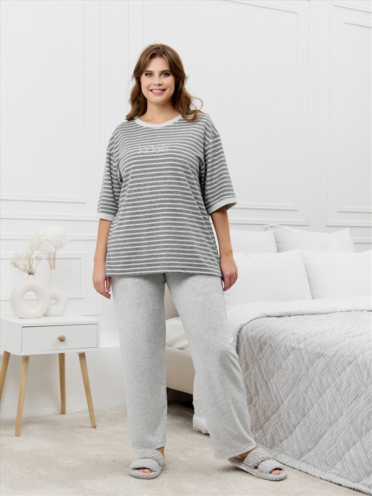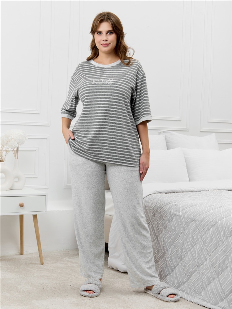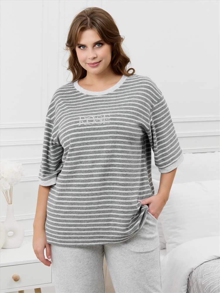 Костюм женский из трикотажного полотна «махра» в комбинации двух видов в единой цветовой гамме, состоящий из футболки и брюк. Футболка – из полотна в « полоску», с втачными короткими рукавами, горловиной овальной формы, обработанной втачной планкой и вышивкой по центру переда. Планка горловины и манжеты на рукавах выполнены из контрастного полотна «махра меланж».Брюки – из полотна «махра меланж» классического покроя, с карманами в боковых швах, на притачном поясе с эластичной тесьмой внутри.