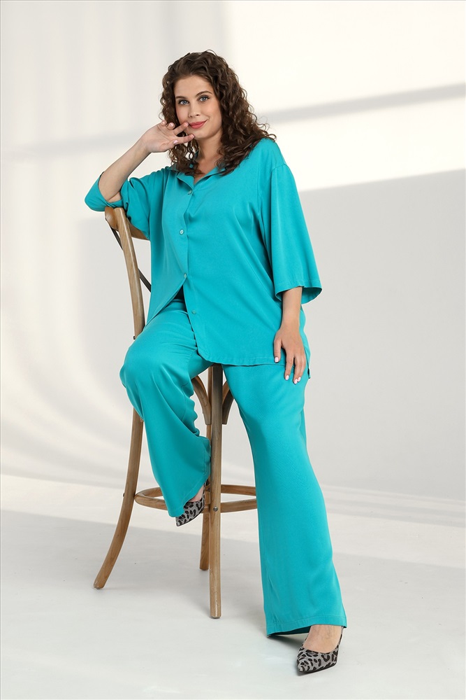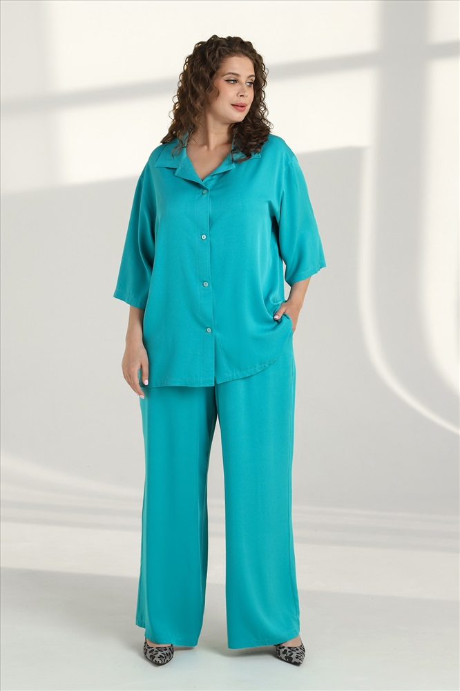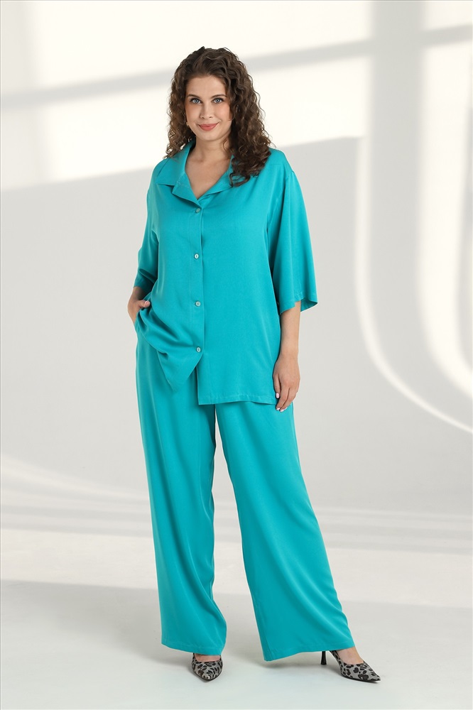 Костюм женский из гладкокрашеного тканого полотна «штапель» состоящий из блузы и брюк в единой цветовой гамме. Блуза (рубашка) женская из тканого гладкокрашеного полотна «штапель», свободного покроя, с короткими втачными рукавами, стояче-отложным воротником, центральной бортовой застежкой на обметанные петли и пуговицы. В боковых швах разрезы. Брюки женские из гладкокрашеного тканого полотна «штапель», свободные слегка расширенные книзу, с карманами в боковых швах на притачном поясе с эластичной тесьмой внутри.