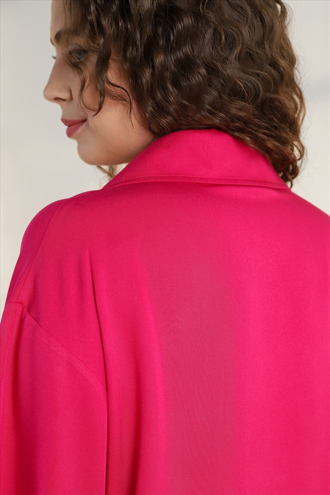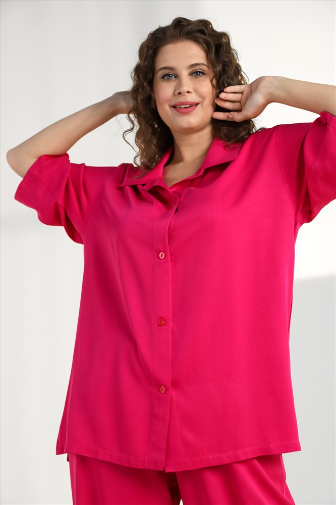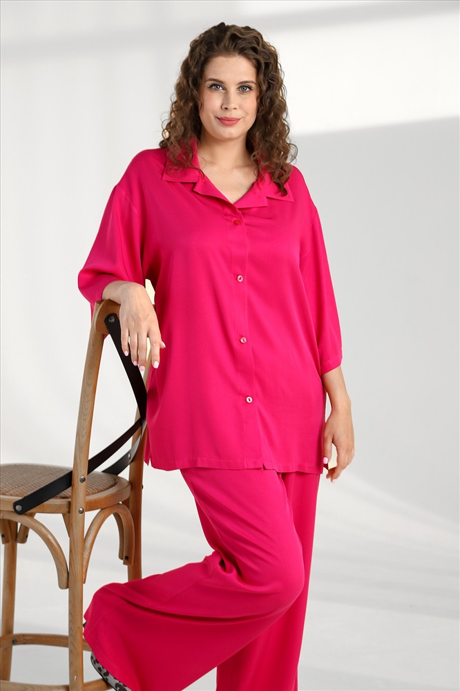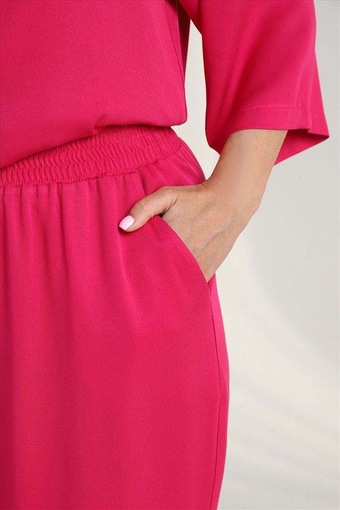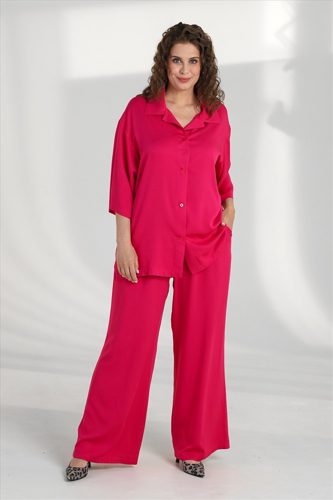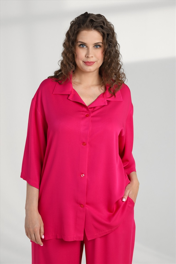 Костюм женский из гладкокрашеного тканого полотна «штапель» состоящий из блузы и брюк в единой цветовой гамме. Блуза (рубашка) женская из тканого гладкокрашеного полотна «штапель», свободного покроя, с короткими втачными рукавами, стояче-отложным воротником, центральной бортовой застежкой на обметанные петли и пуговицы. В боковых швах разрезы. Брюки женские из гладкокрашеного тканого полотна «штапель», свободные слегка расширенные книзу, с карманами в боковых швах на притачном поясе с эластичной тесьмой внутри.